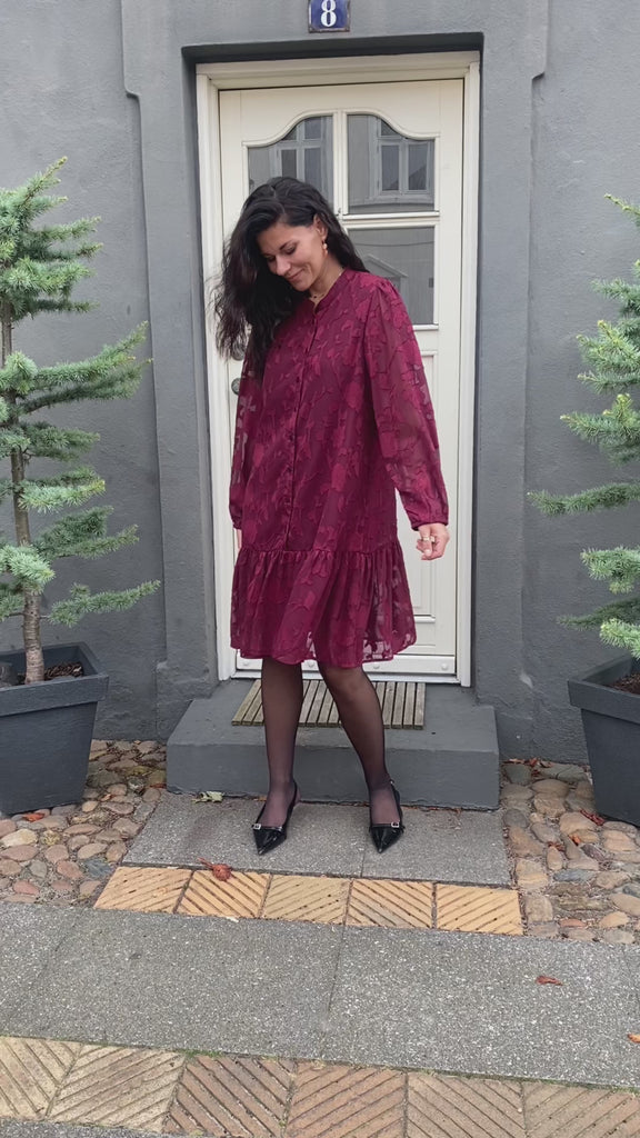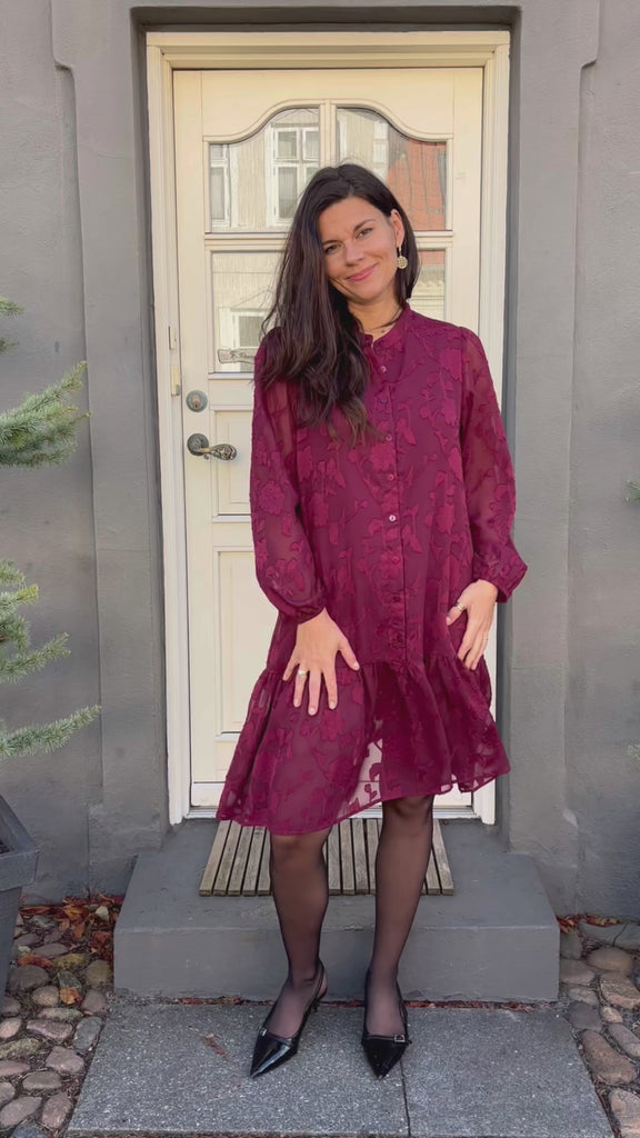 Smuk kjole fra Say INA Copenhagen i bordeaux med blomster-mønster.