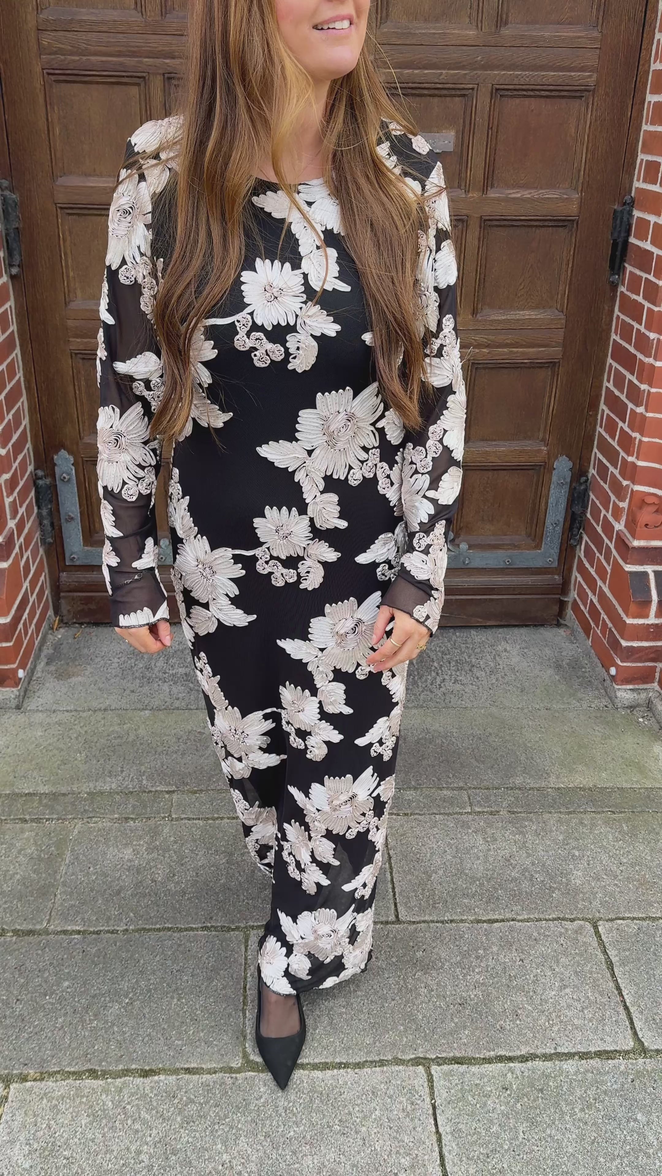 Elegant og eksklusiv kjole fra Say INA Copenhagen i sort mesh med flotte 3D blomster i ivory.