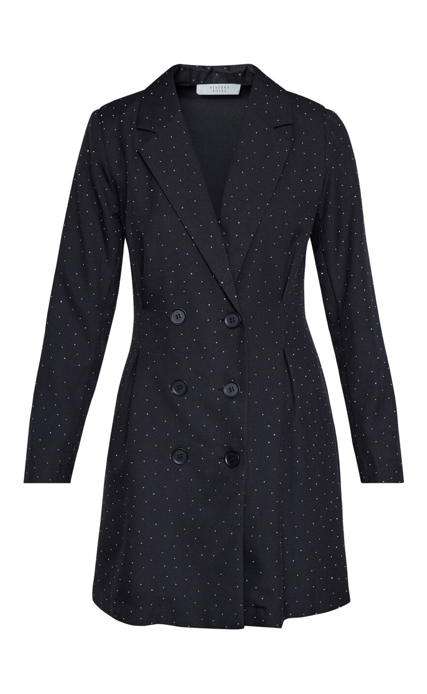 En sort blazer-kjole fra Sisters Point med dobbeltradet knaplukning, lange ærmer og diskret glitter – et stilfuldt valg til festlige anledninger.