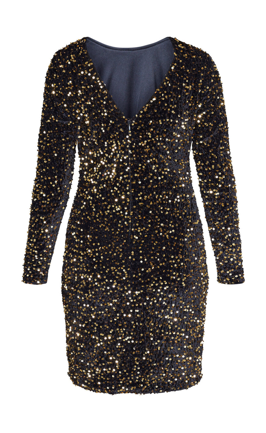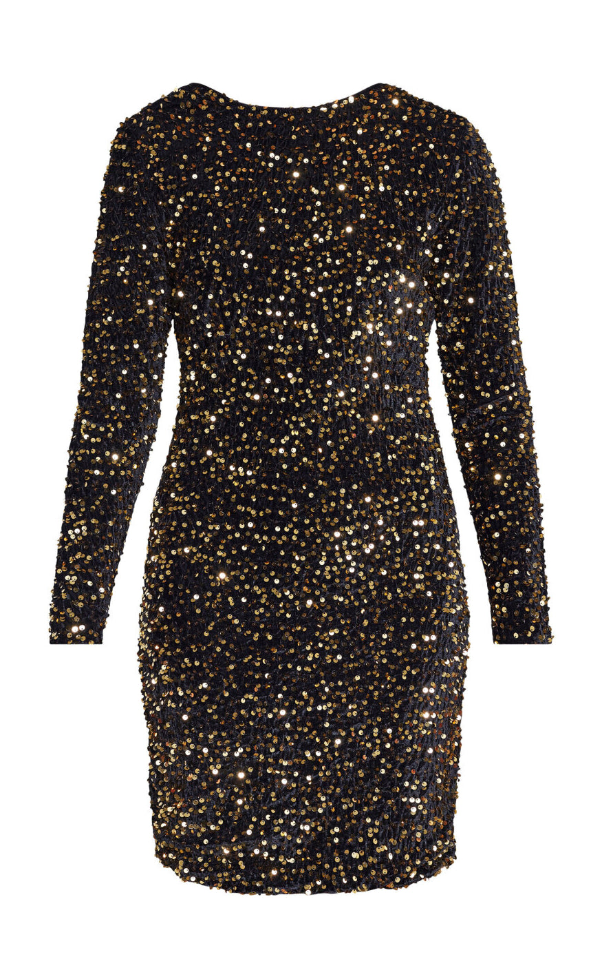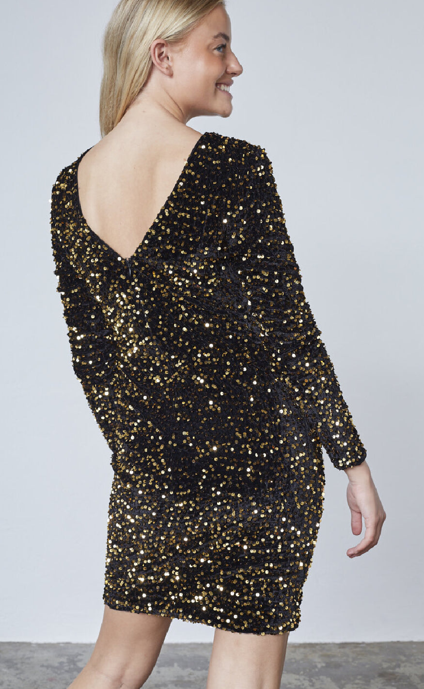 En tætsiddende, sort minikjole fra Sisters Point dækket med flotte pailletter og lange ærmer – et iøjnefaldende valg til fest og nytår.