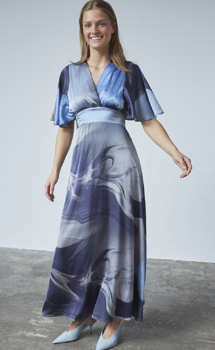 Kjolen er lang med løse ærmer, og passer perfekt til finere lejligheder.