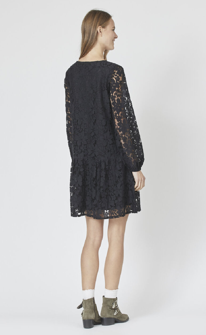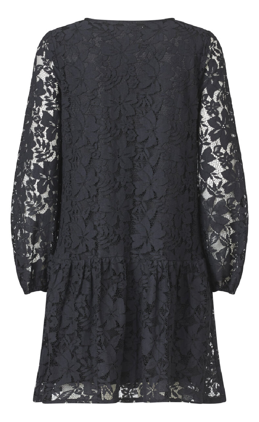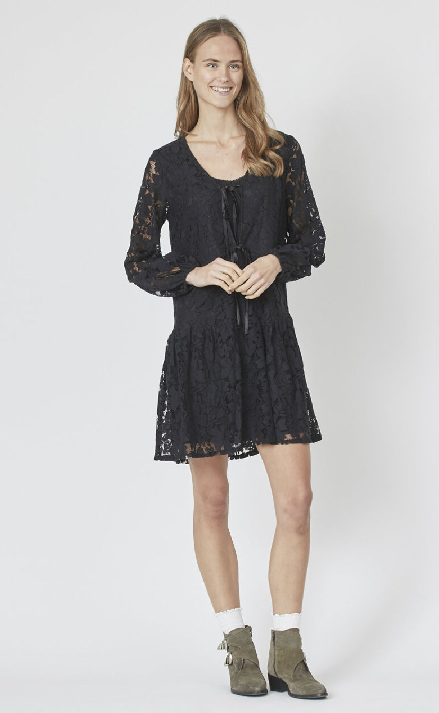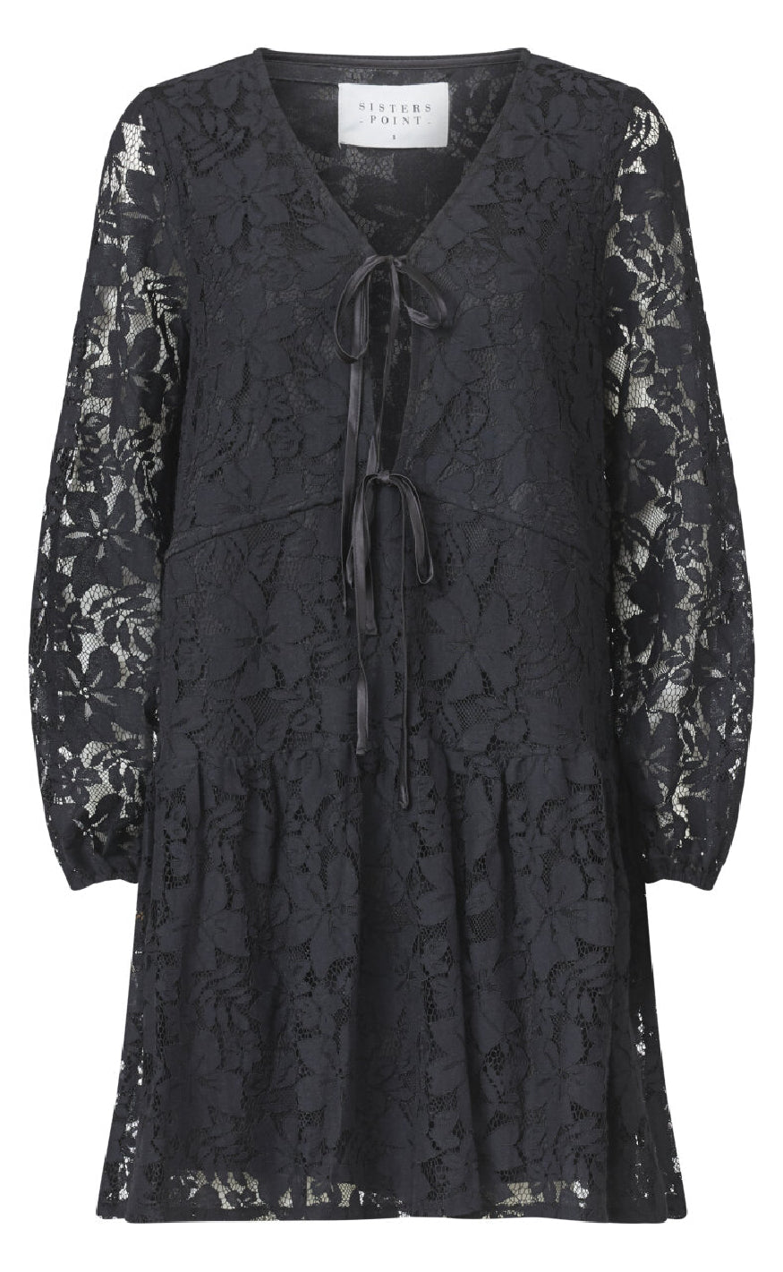 Sort blondekjole fra Sisters Point med lange ærmer, V-udskæring og bindebånd foran – feminin og elegant til enhver lejlighed.
