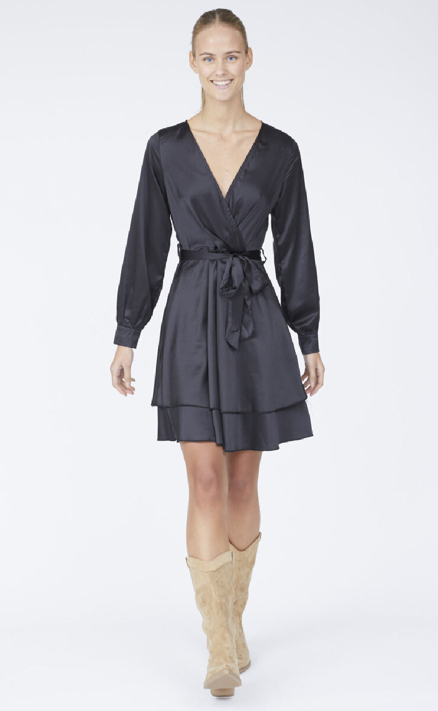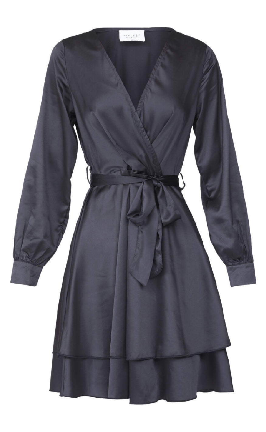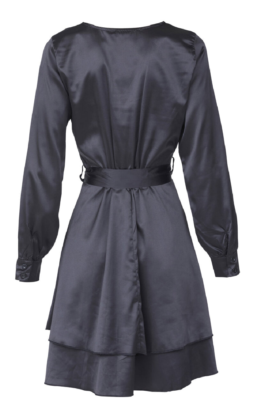 Elegant slå-om kjole fra Sisters Point i satin-look med lange ærmer og bindebælte – perfekt til festlige anledninger.
