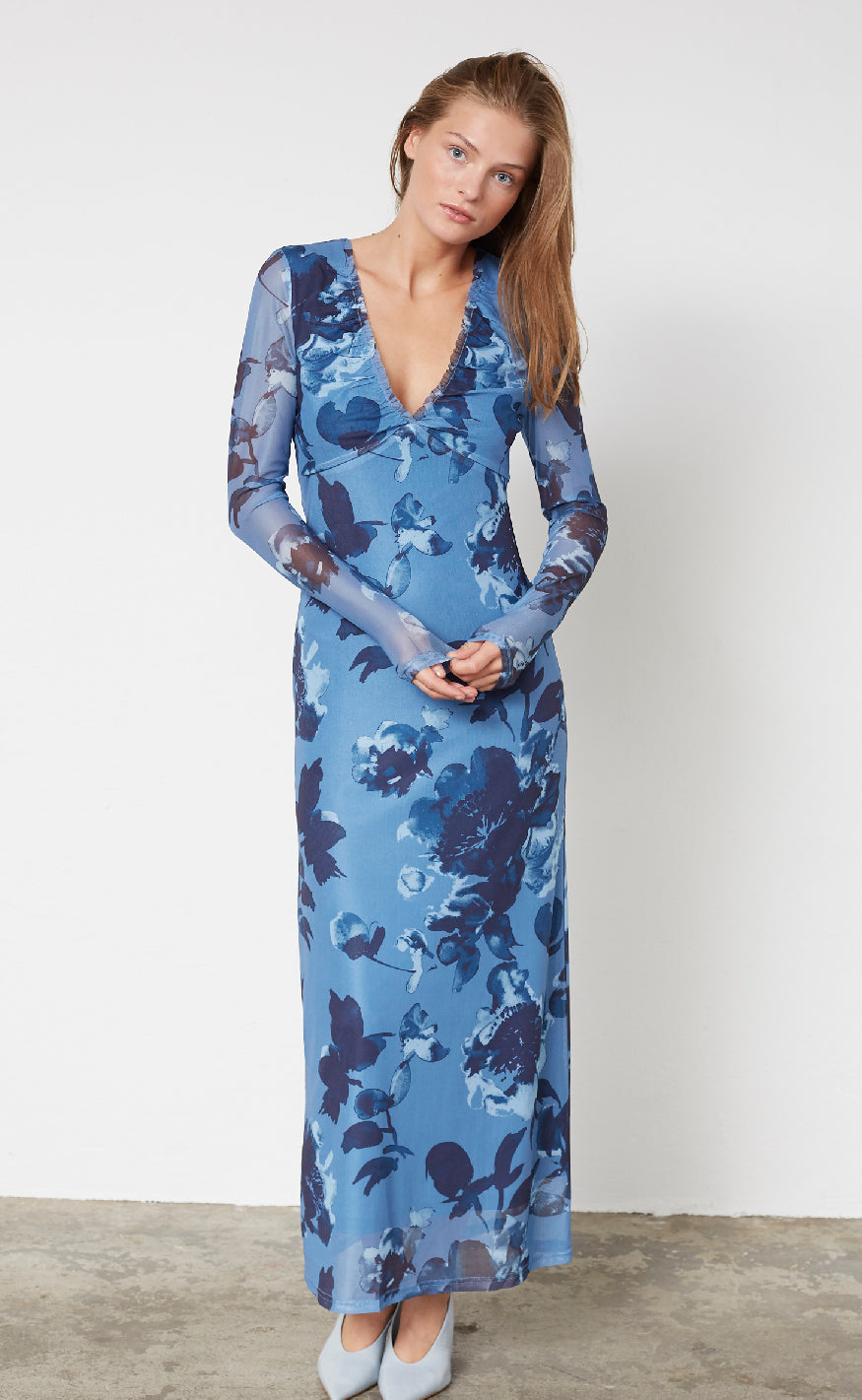 Kjolen har en maxi længde og en v-hals.