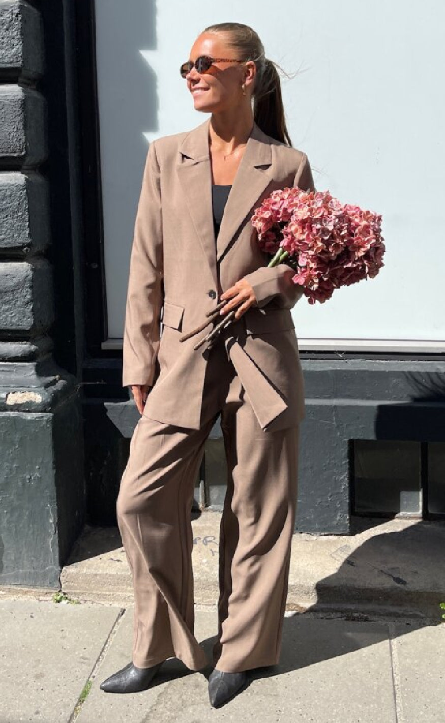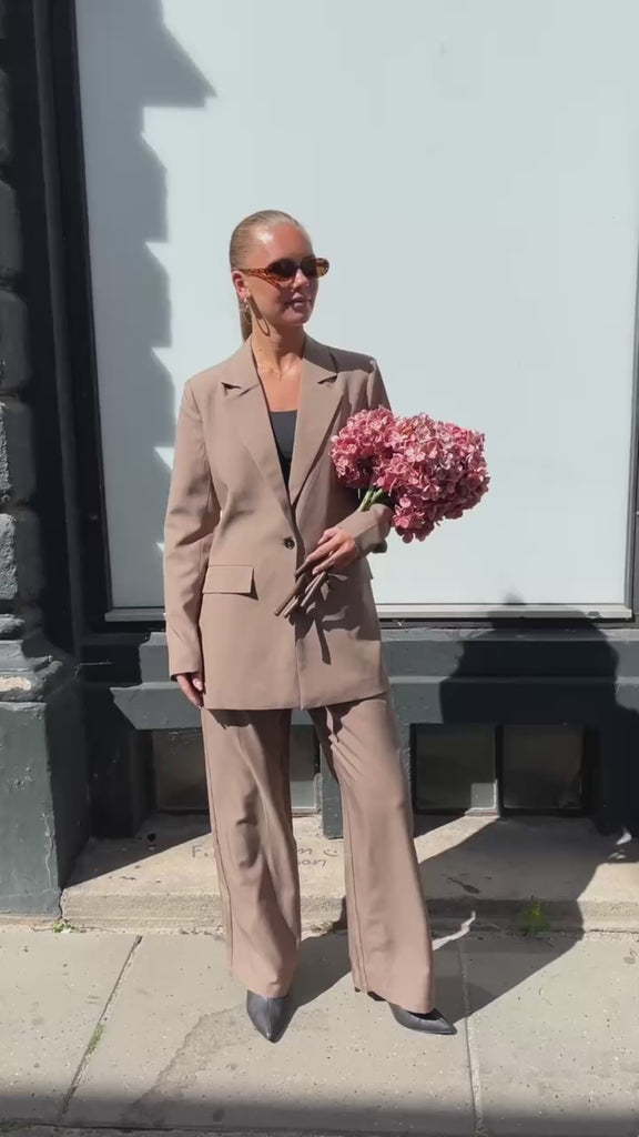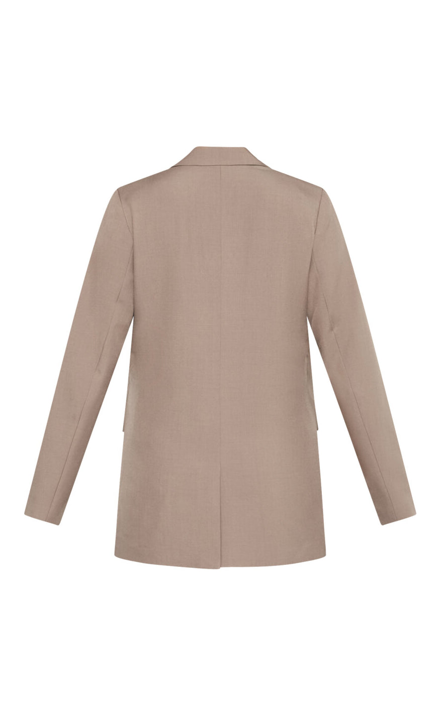 Blazeren er med reverskrave, knaplukning foran og tre pynteknapper på ærmerne og to lommer foran.