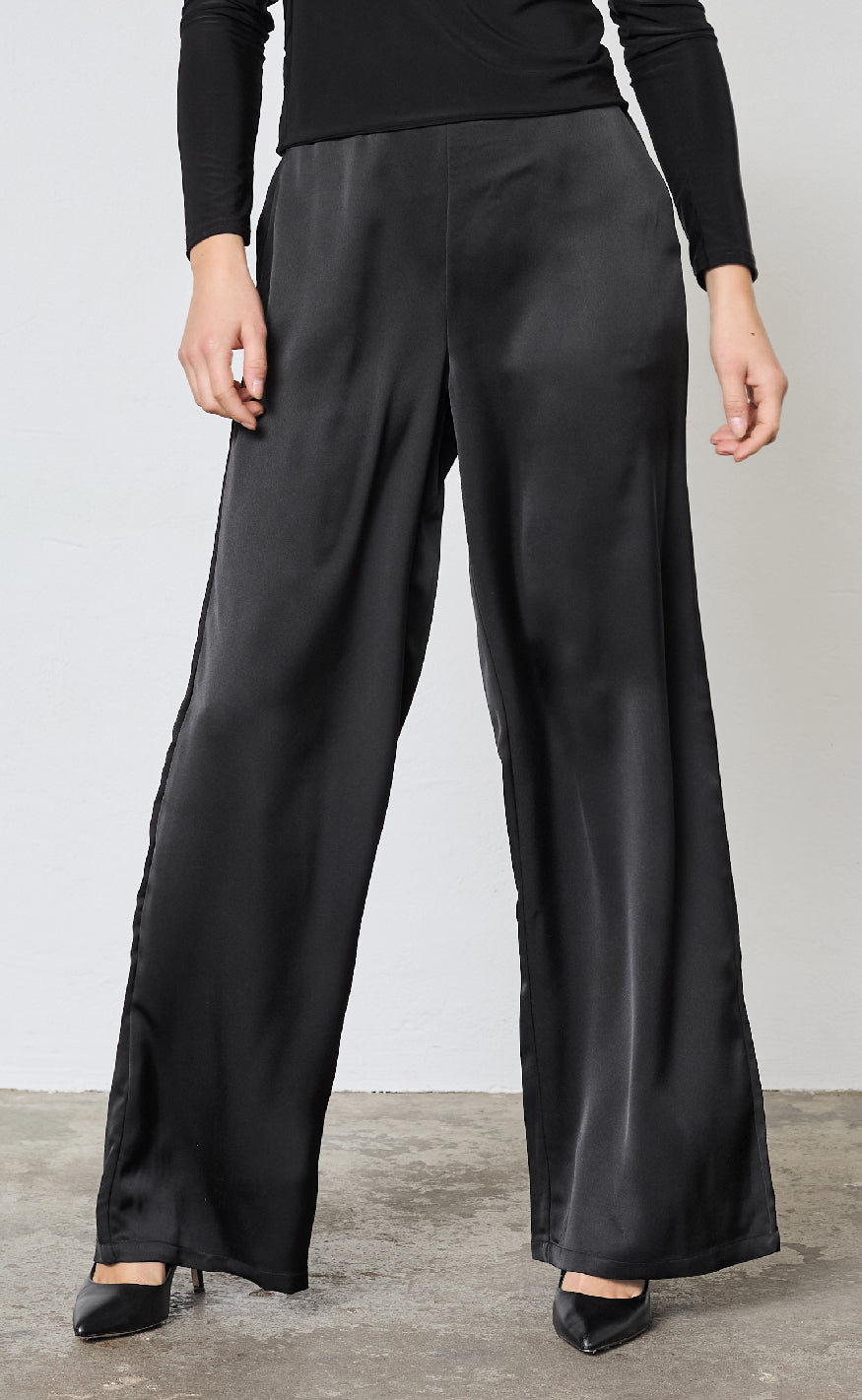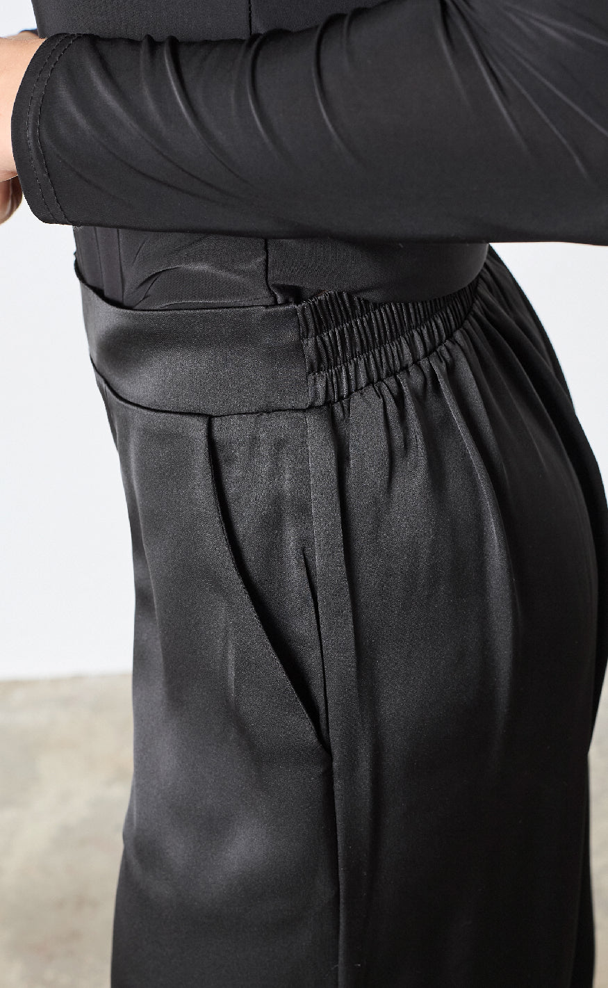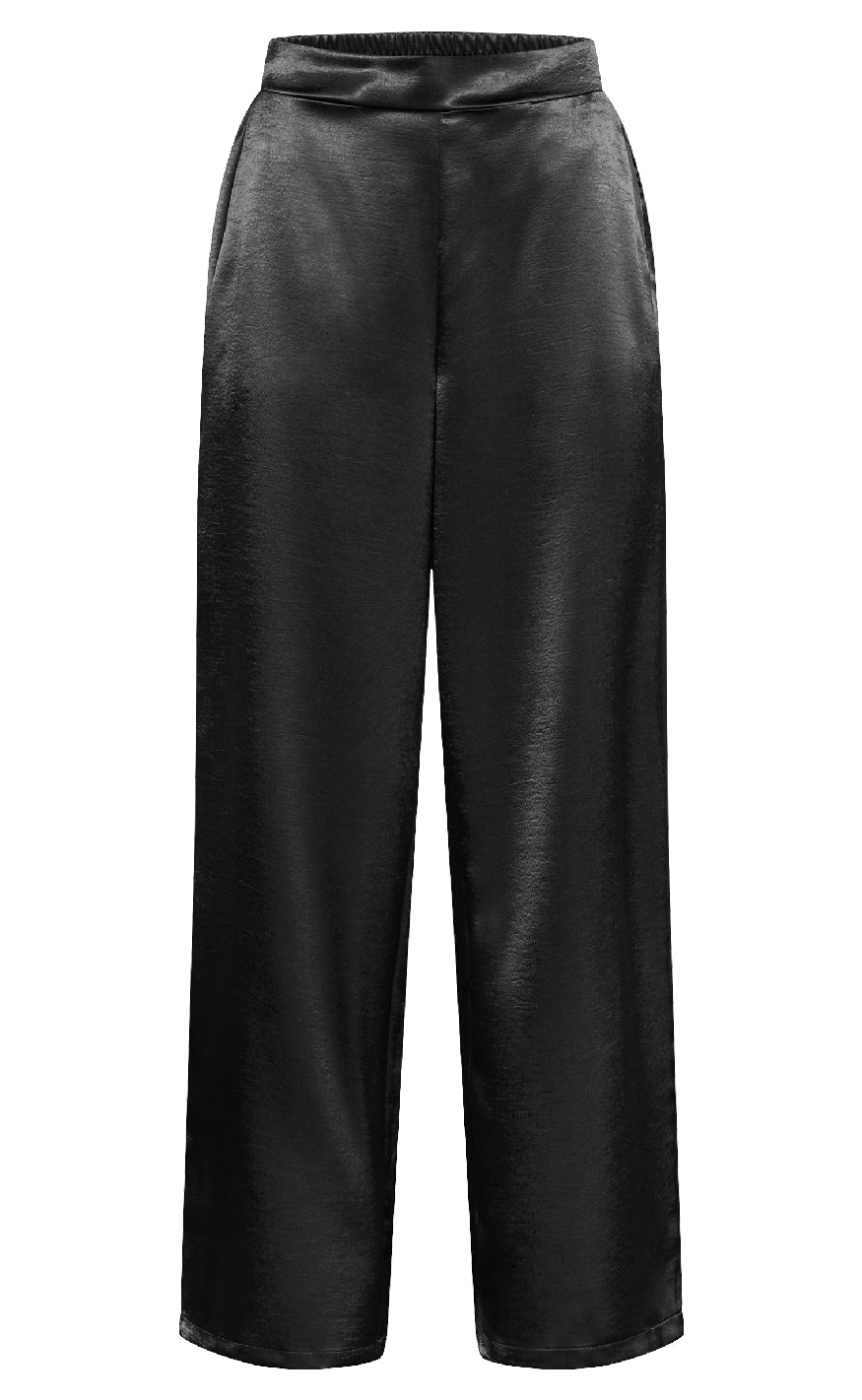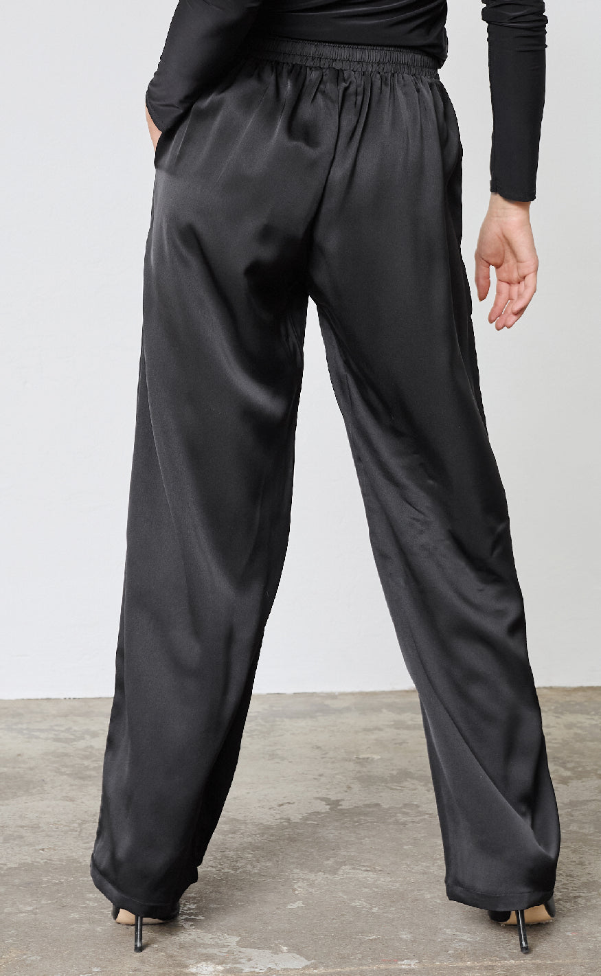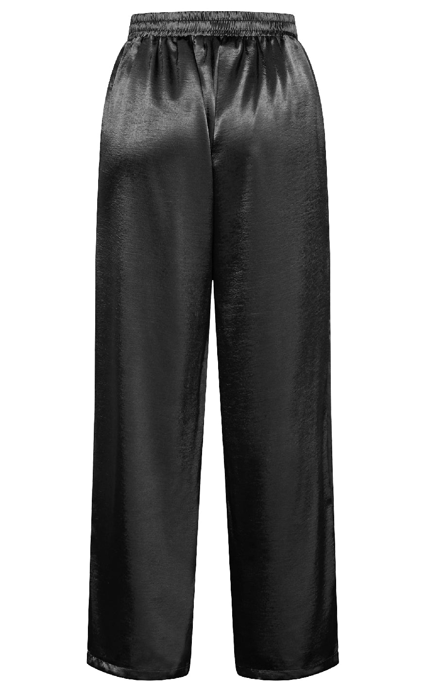 Sorte satinbukser med høj talje og vide ben – et elegant og komfortabelt valg til både hverdag og fest.