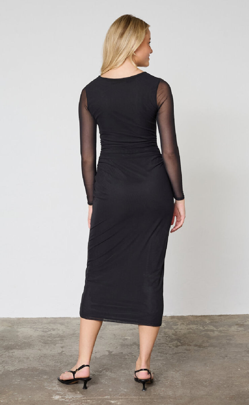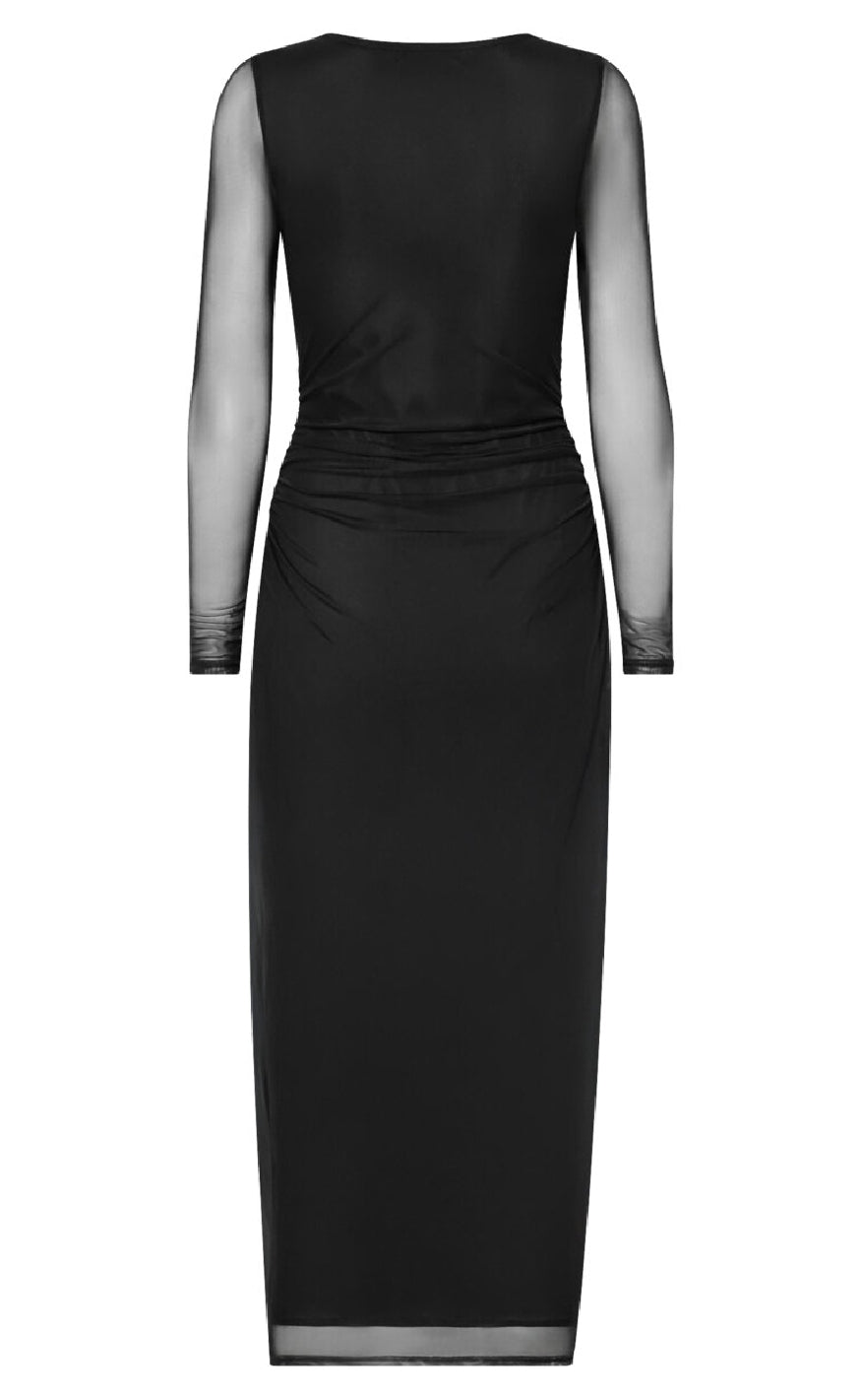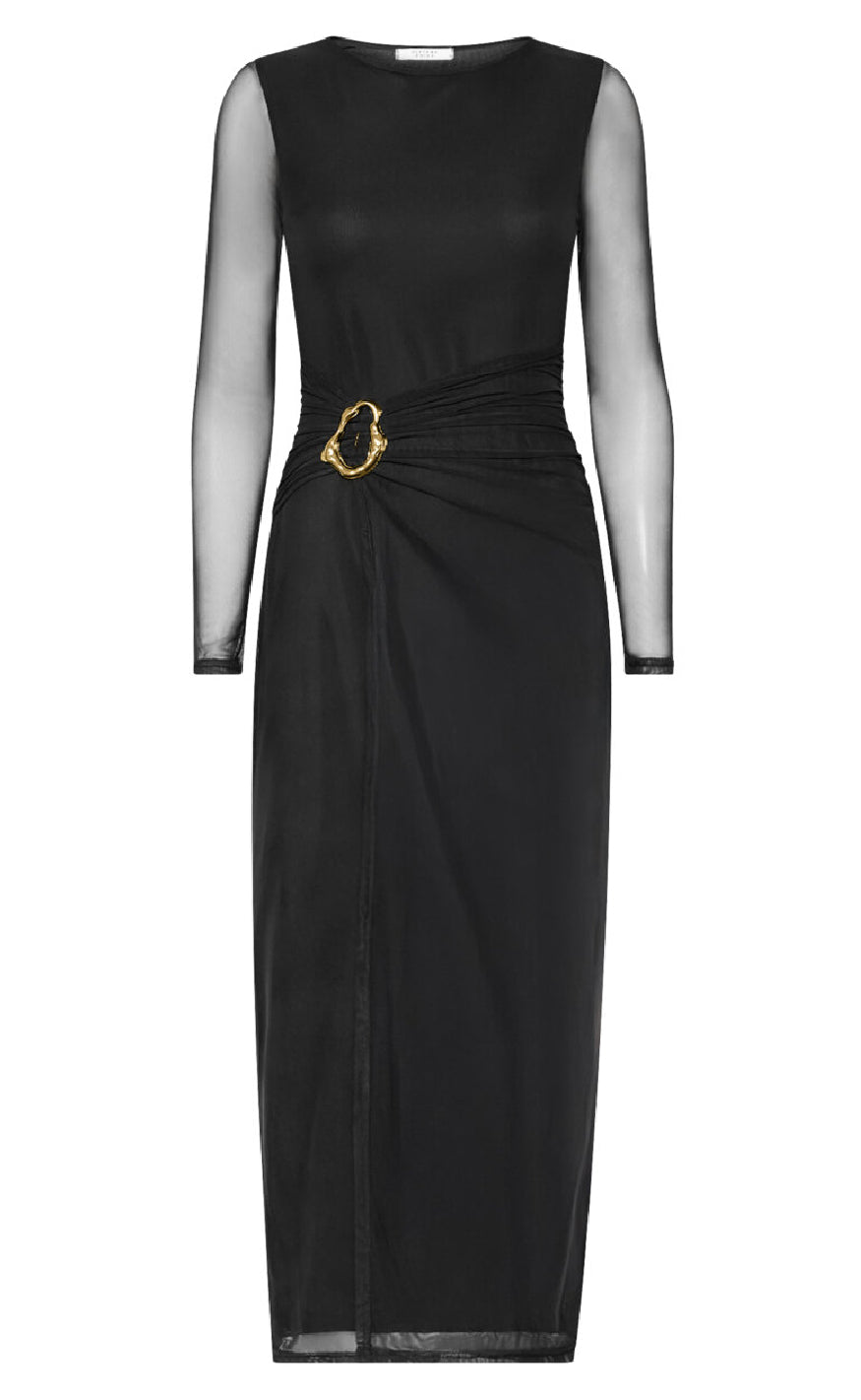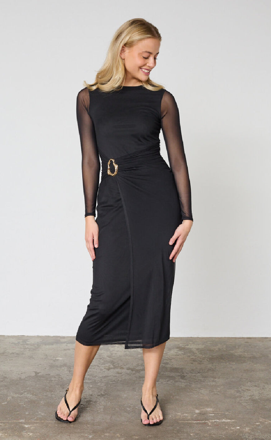 Midi-kjole fra Sisters Point, tætsiddende med et feminint fald. Den har et guldfarvet spænde i taljen, gennemsigtige ærmer og er lavet af et let, let-gennemsigtigt stof.