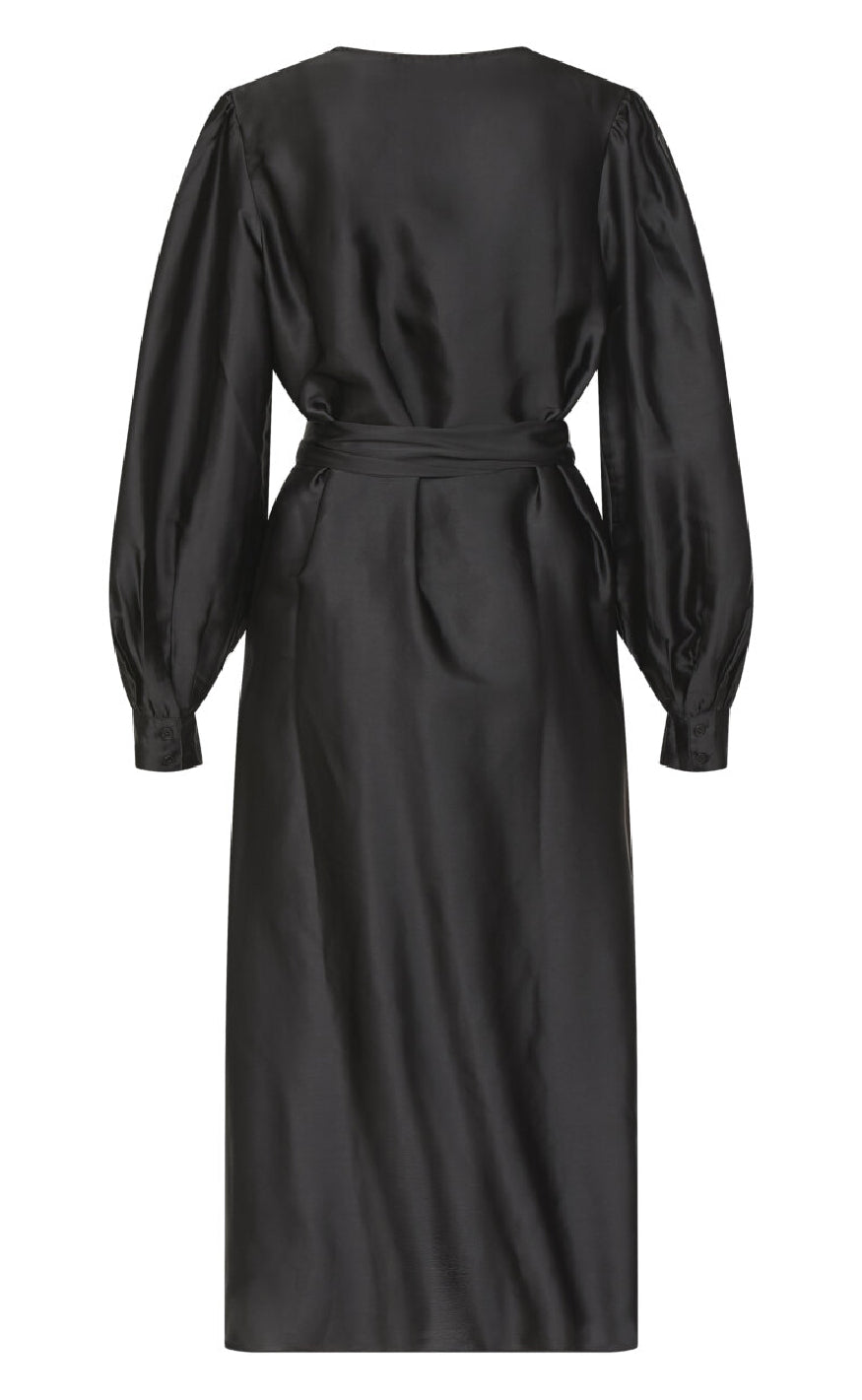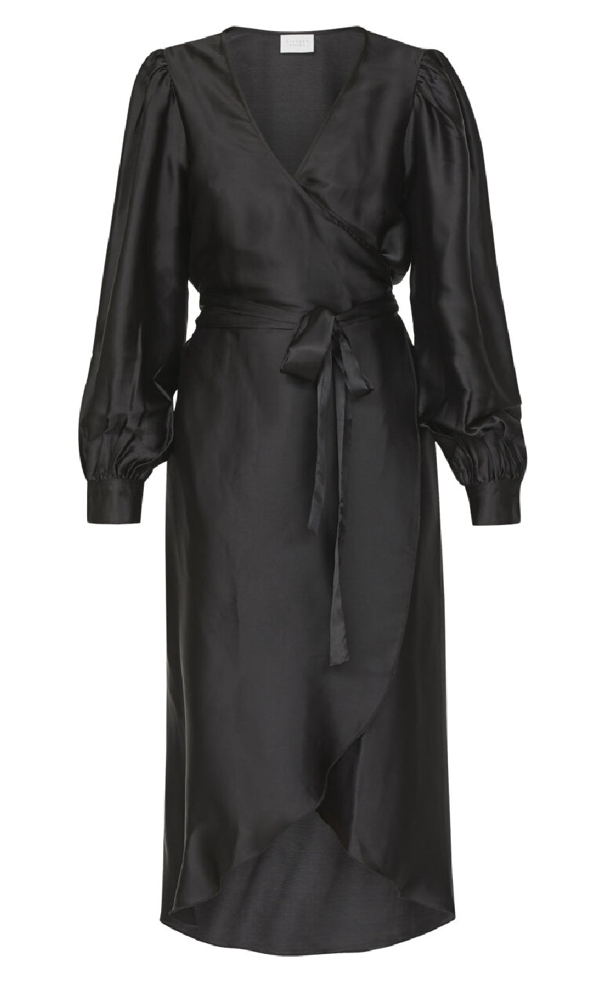 Sort slå-om kjole fra Sisters Point med lange ærmer, bindebånd i taljen og elegant satinlook – perfekt til festlige anledninger.