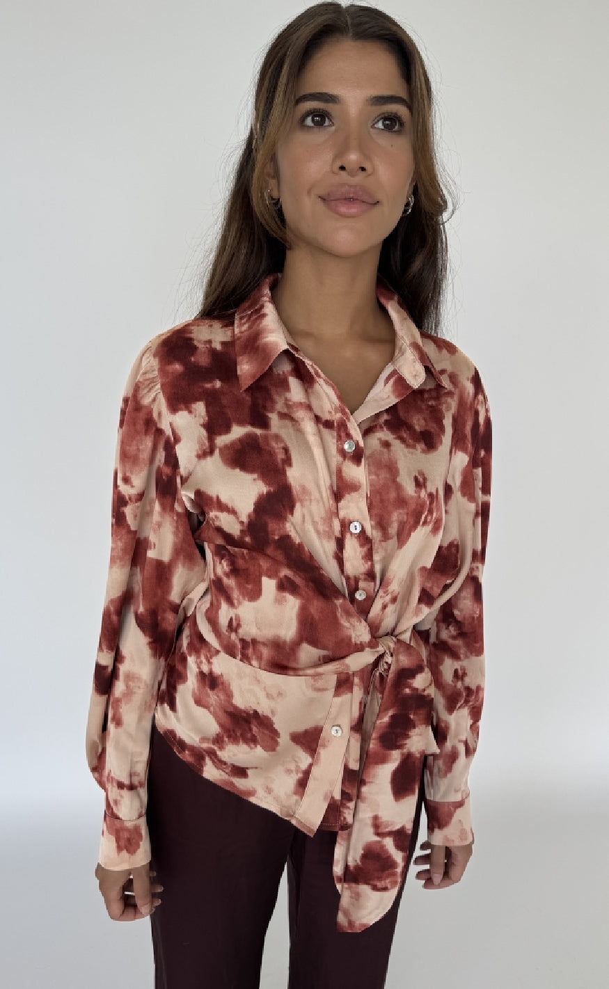 Skjorten har bindebånd i taljen samt er gennemknappet.