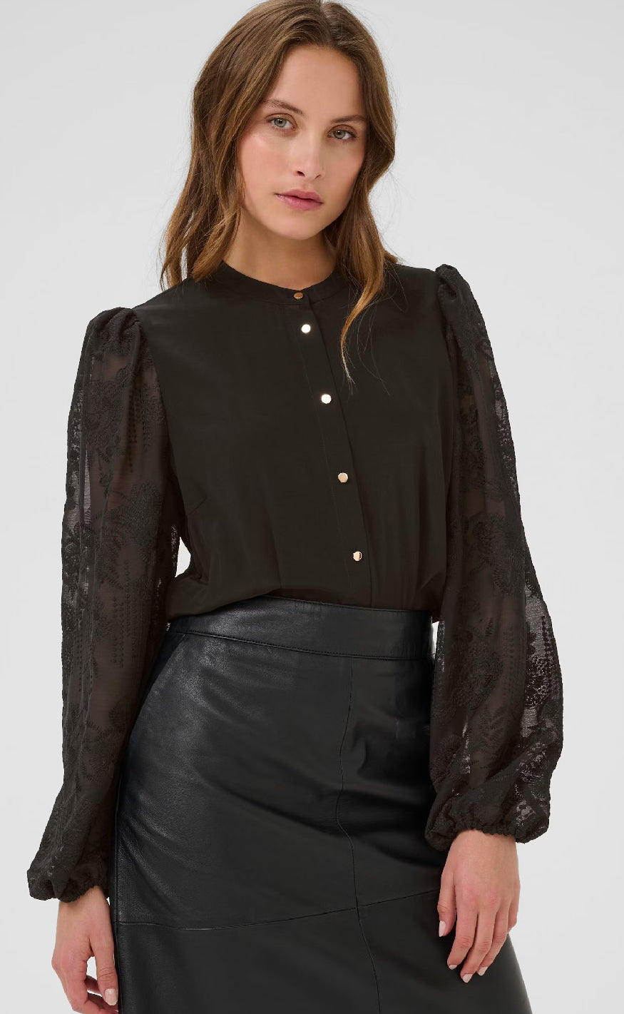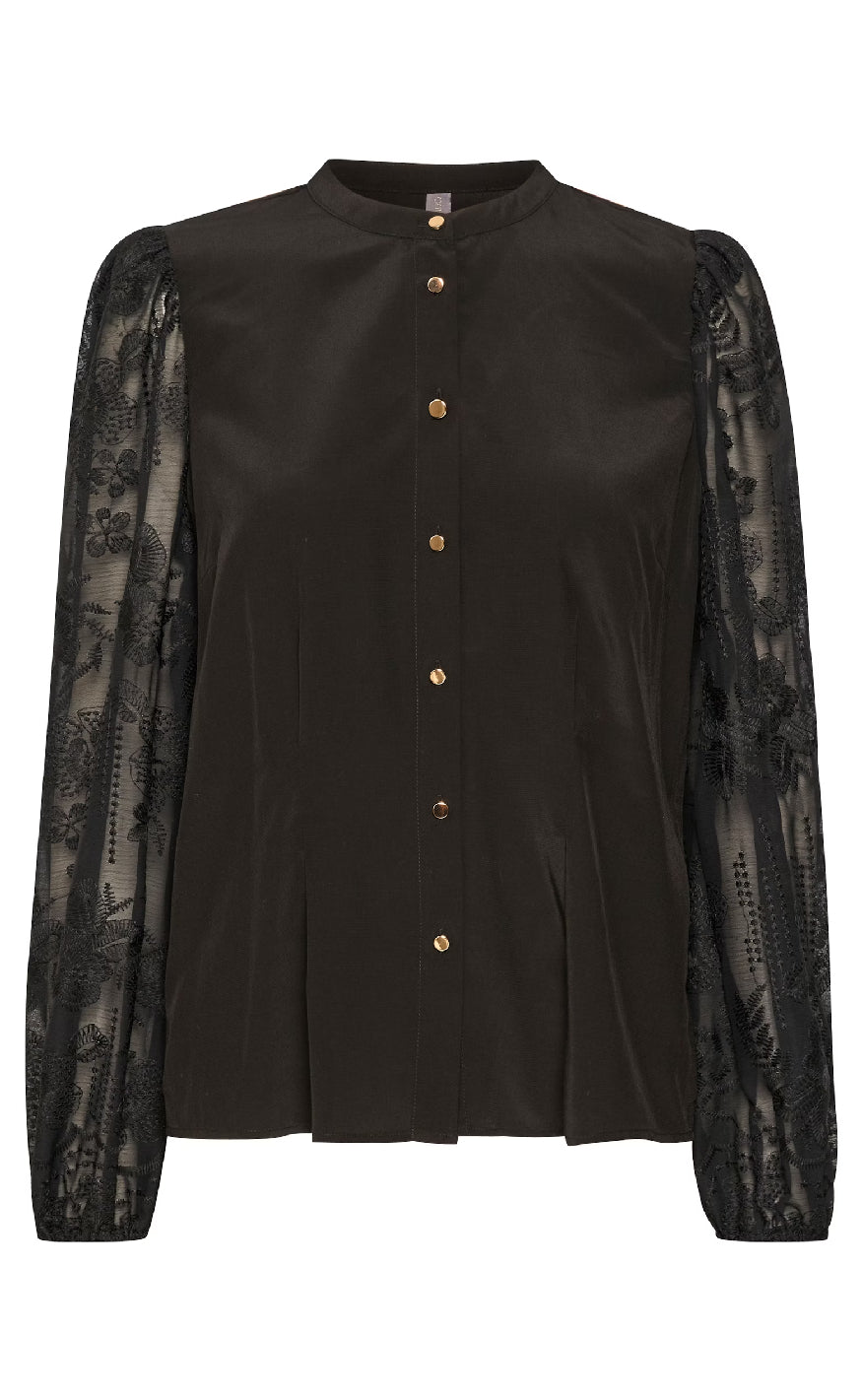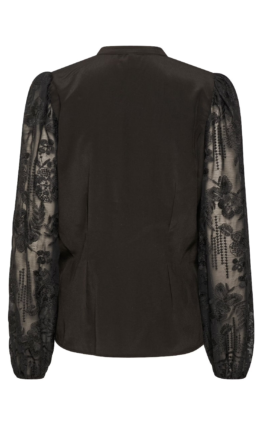 Bluse med let transparente, teksturerede lange ærmer og rund hals.