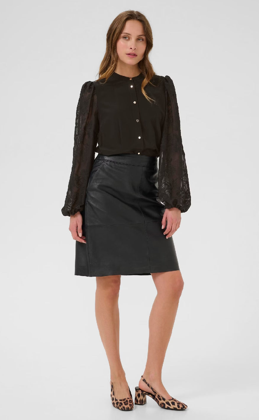 Diskrete læg foran skaber et sofistikeret look, mens den lige silhuet og knaplukning med elegante manchetter fuldender designet.