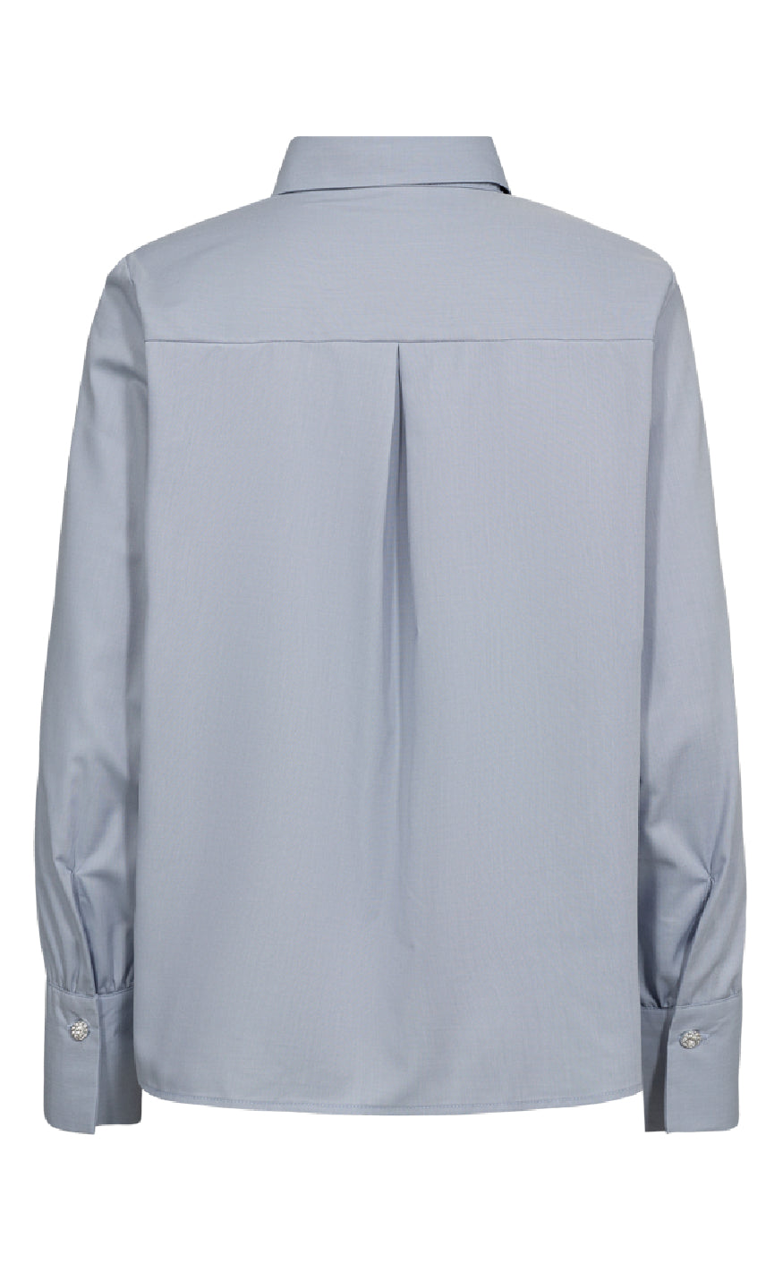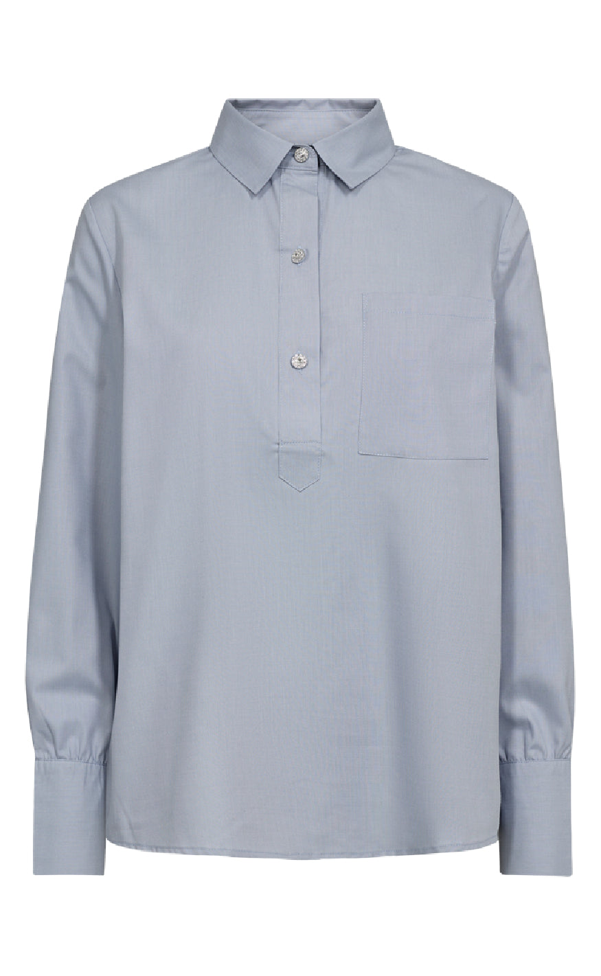 Skjorten har lange ærmer, klassisk krave med tre knapper og en brystlomme.
