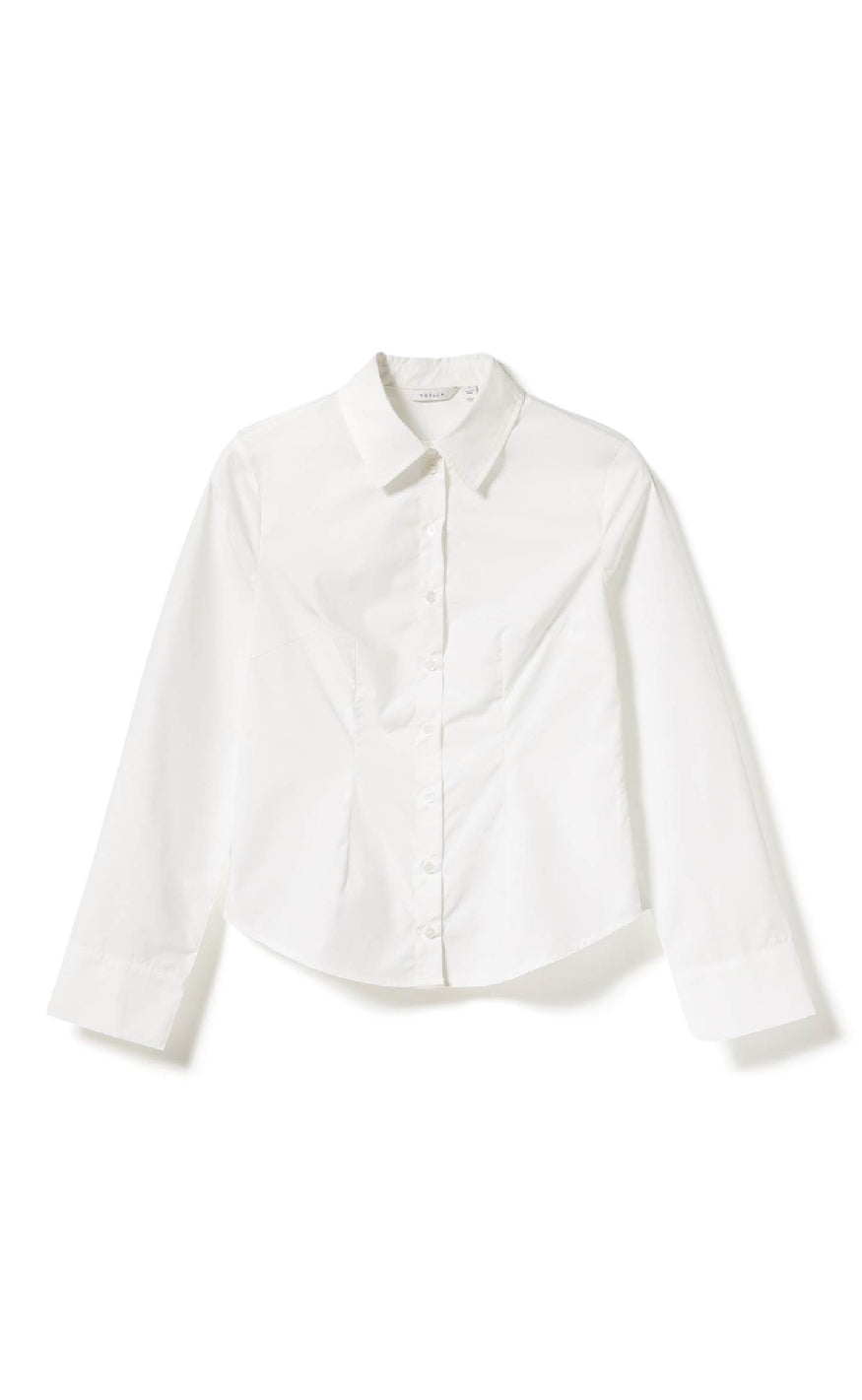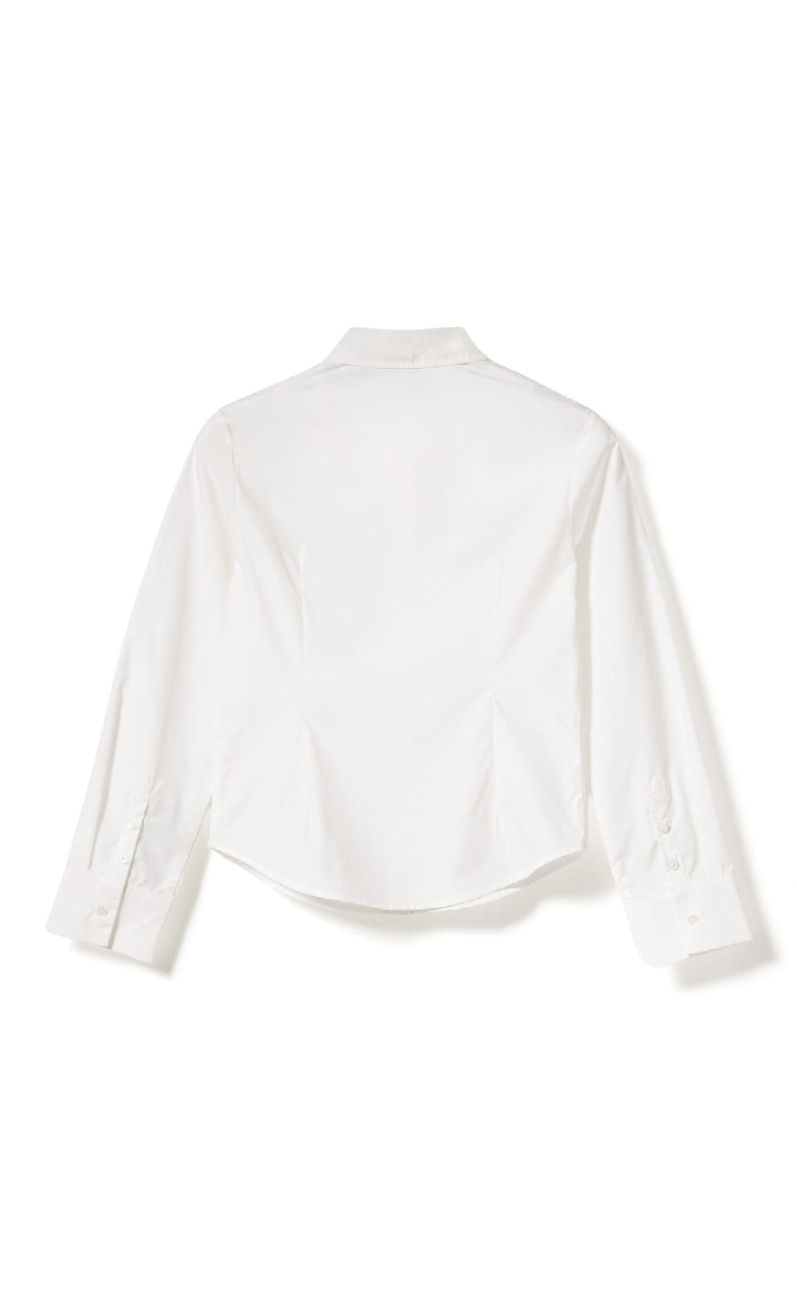 Skjorten er en figursyet, klassisk model med smigrende snit langs kroppen, der skaber en skræddersyet silhuet og fremhæver figuren. De oversized manchetter tilføjer et moderne og markant twist til designet.