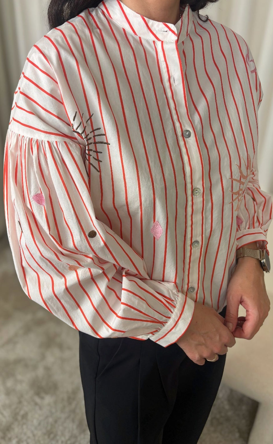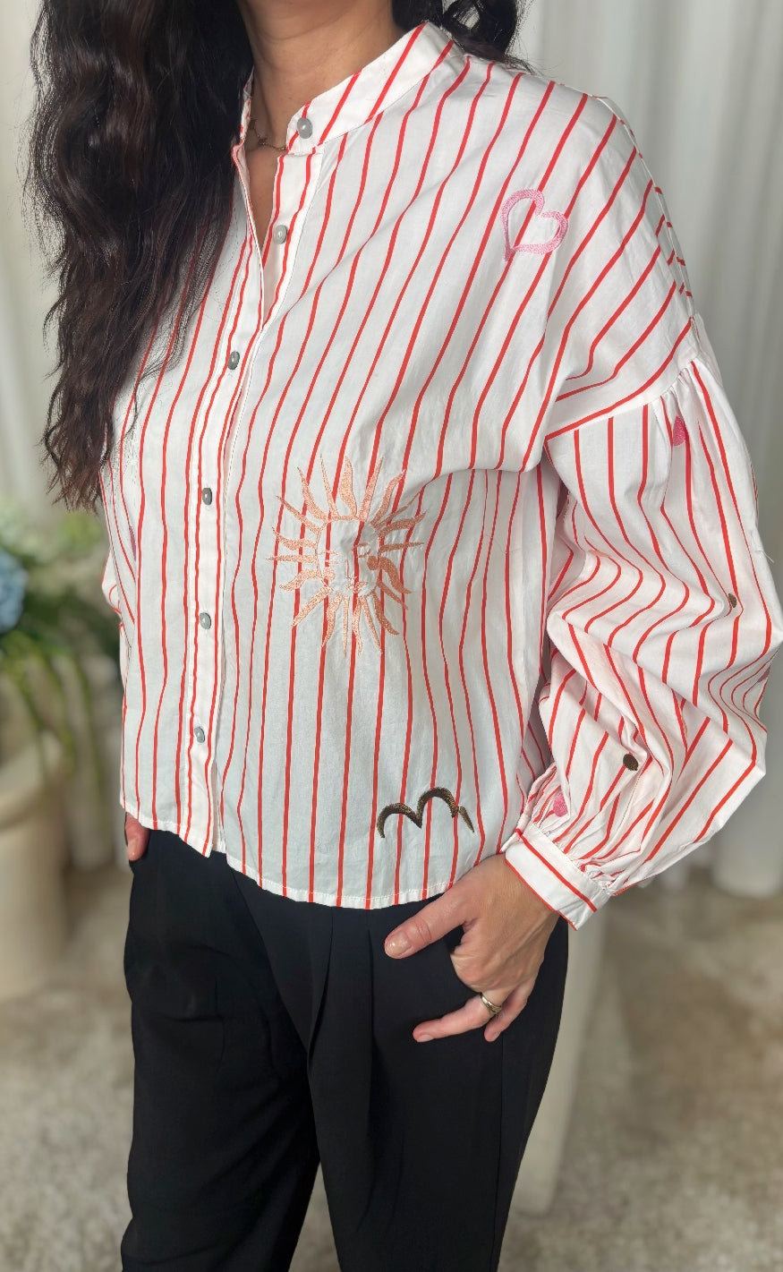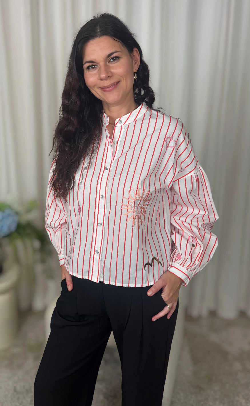 Skjorten har klassiske røde striber på hvid bund, kombineret med små broderede detaljer og grafiske elementer, der giver et legende og kunstnerisk udtryk.