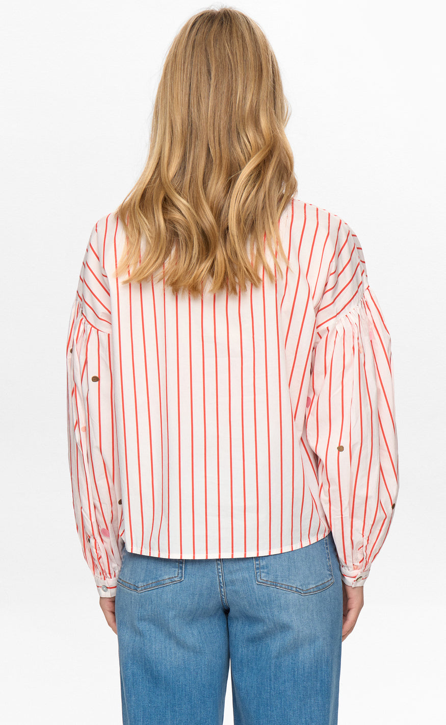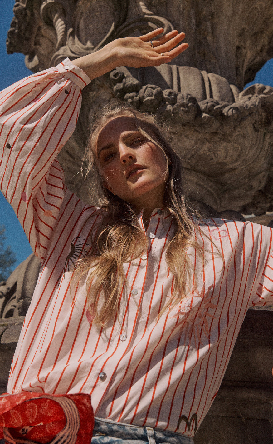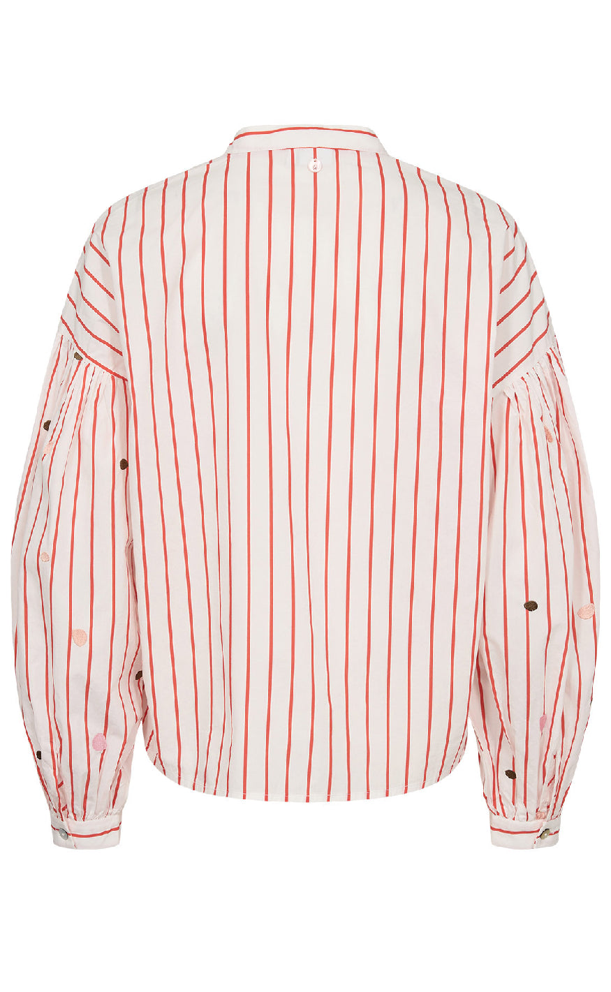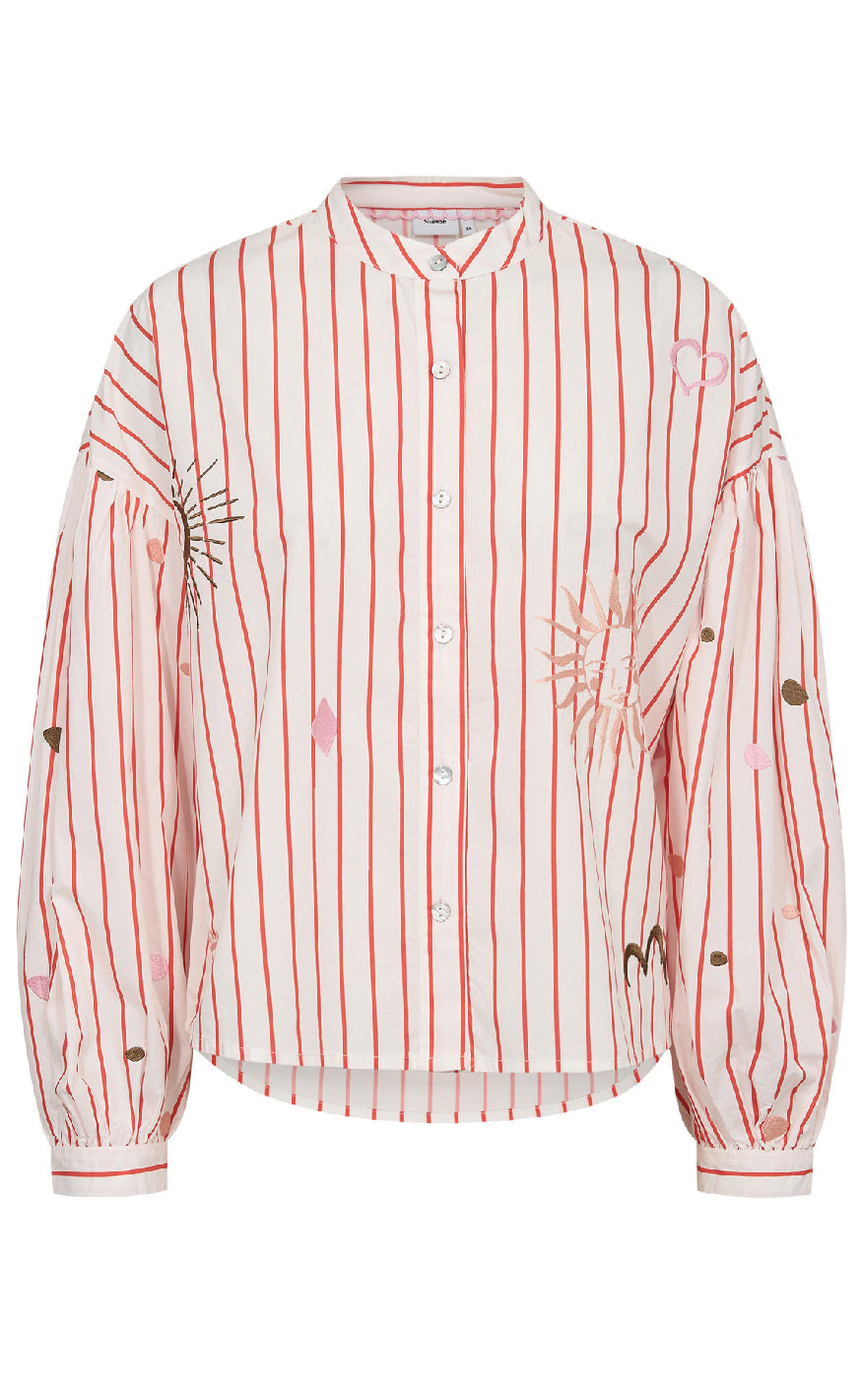 Skjorten har klassiske røde striber på hvid bund, kombineret med små broderede detaljer og grafiske elementer, der giver et legende og kunstnerisk udtryk.