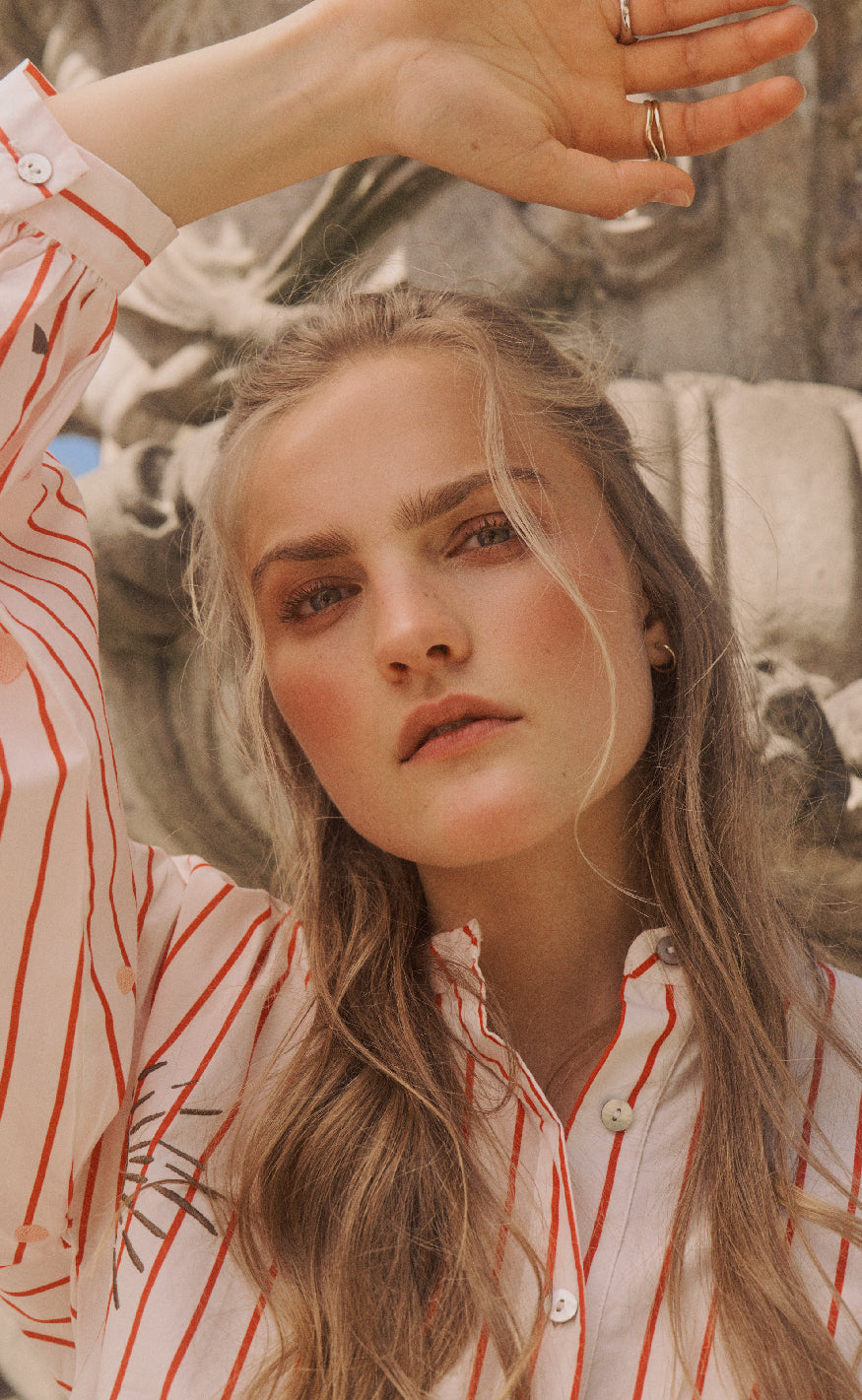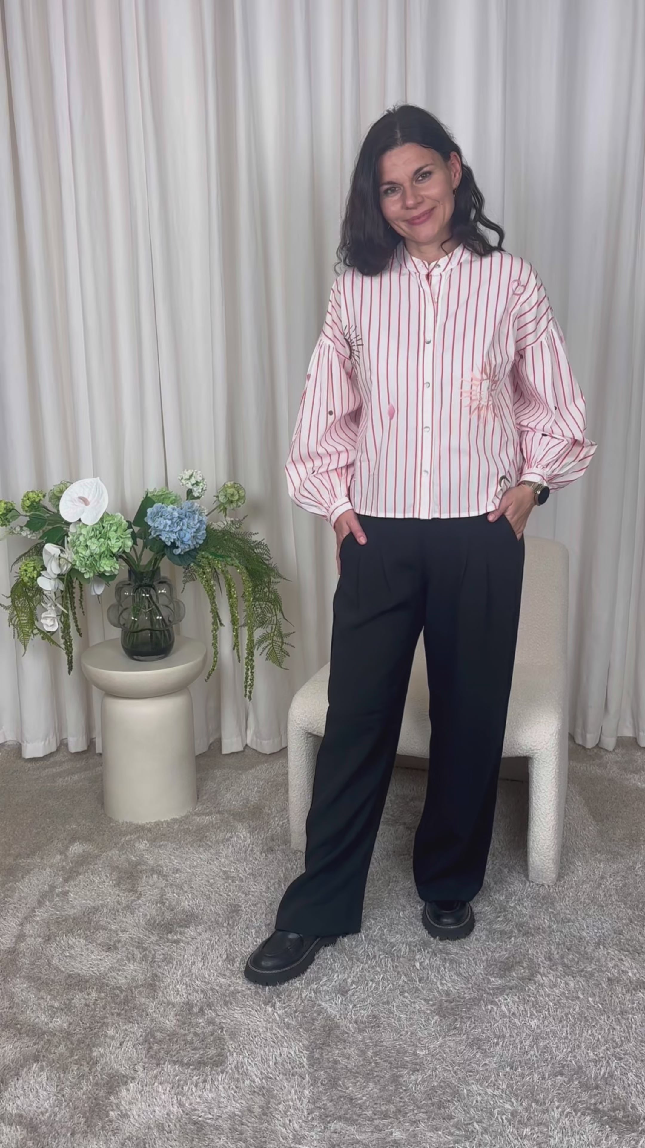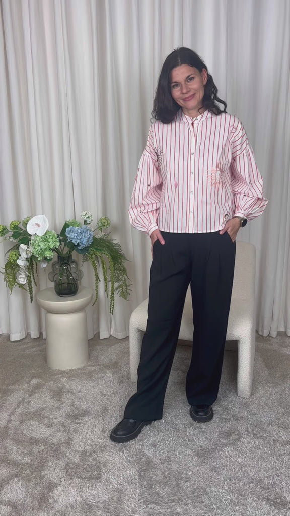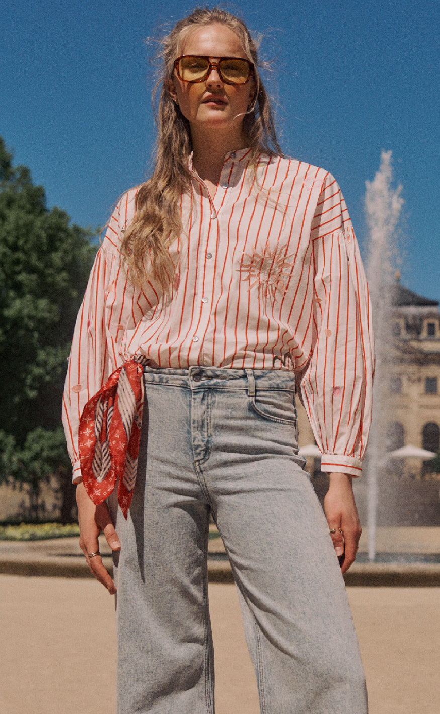 Skjorten har klassiske røde striber på hvid bund, kombineret med små broderede detaljer og grafiske elementer, der giver et legende og kunstnerisk udtryk.