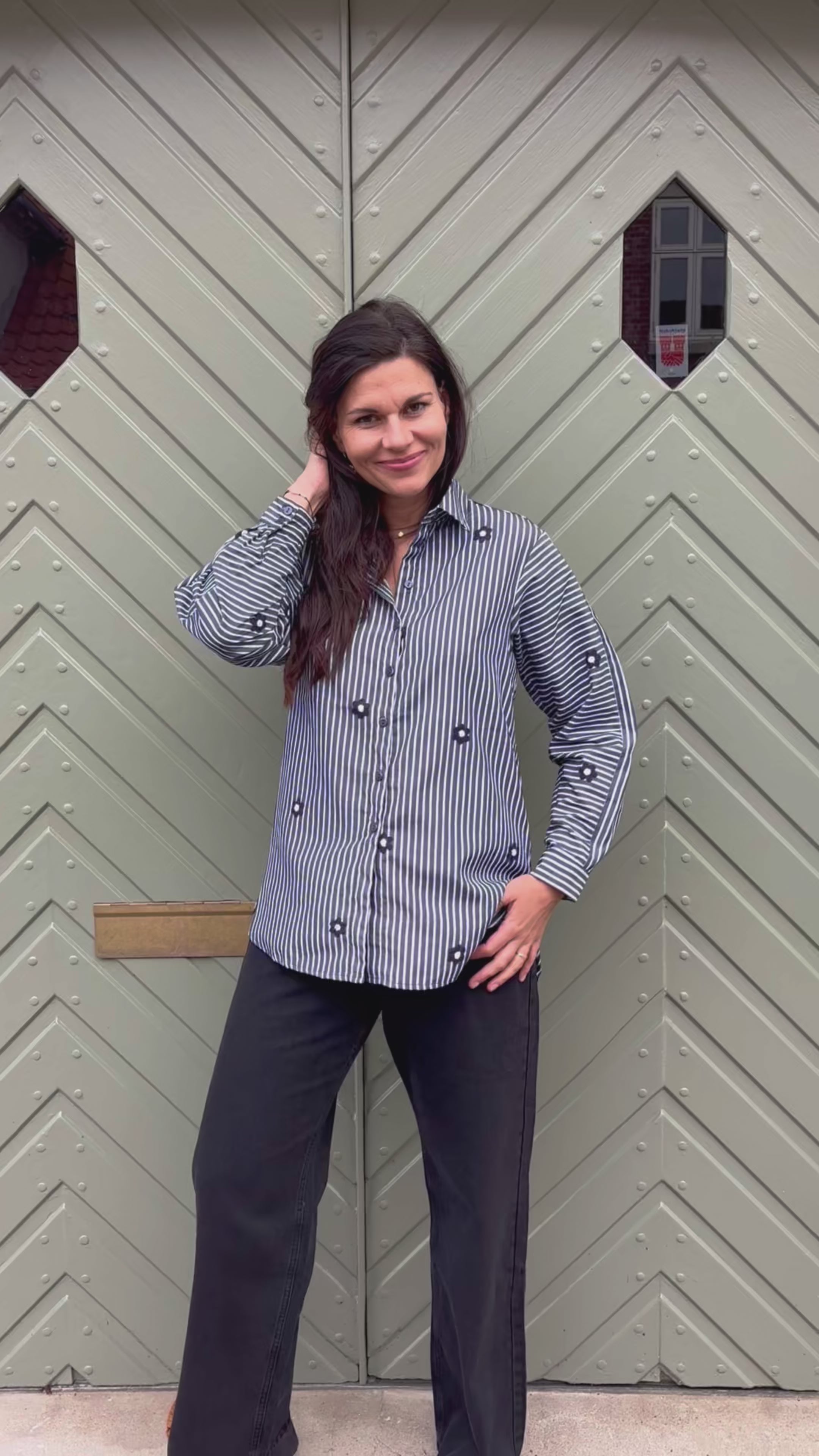 Flot skjorte fra INA Copenhagen i blåstribet med små broderede blomster.