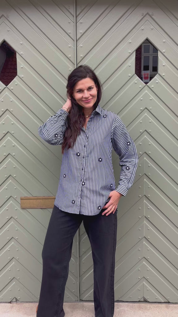 Say INA Copenhagen Skjorte - Katrina - Navy Blue Striped W. Embroidery Flower