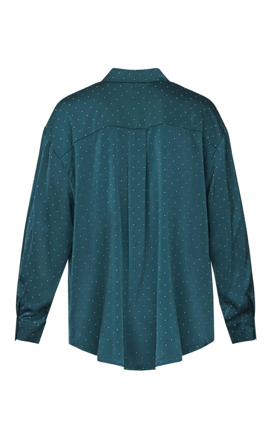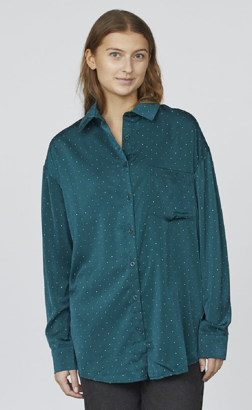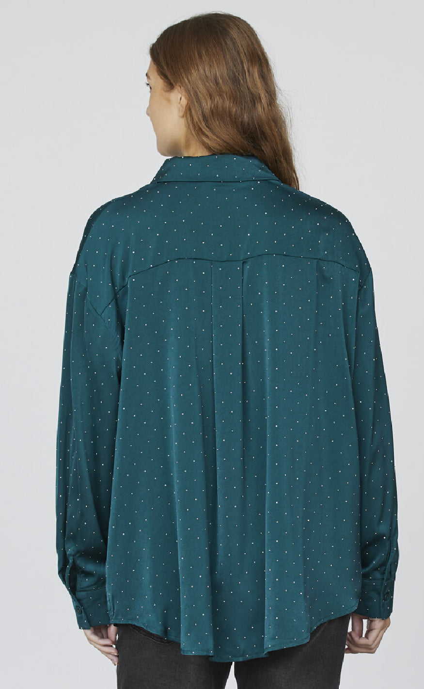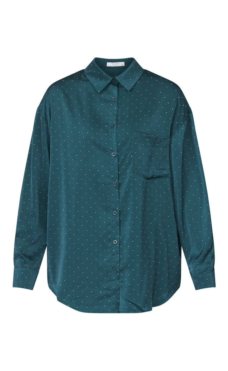 Lækker satin-skjorte fra Sisters Point i dyb grøn med diskrete prikker – perfekt til både hverdag og fest.