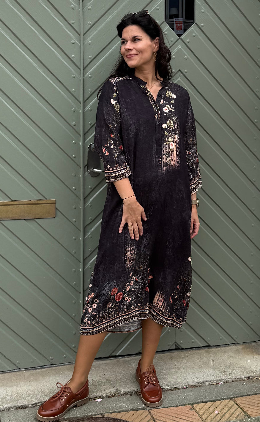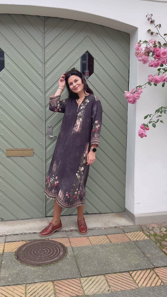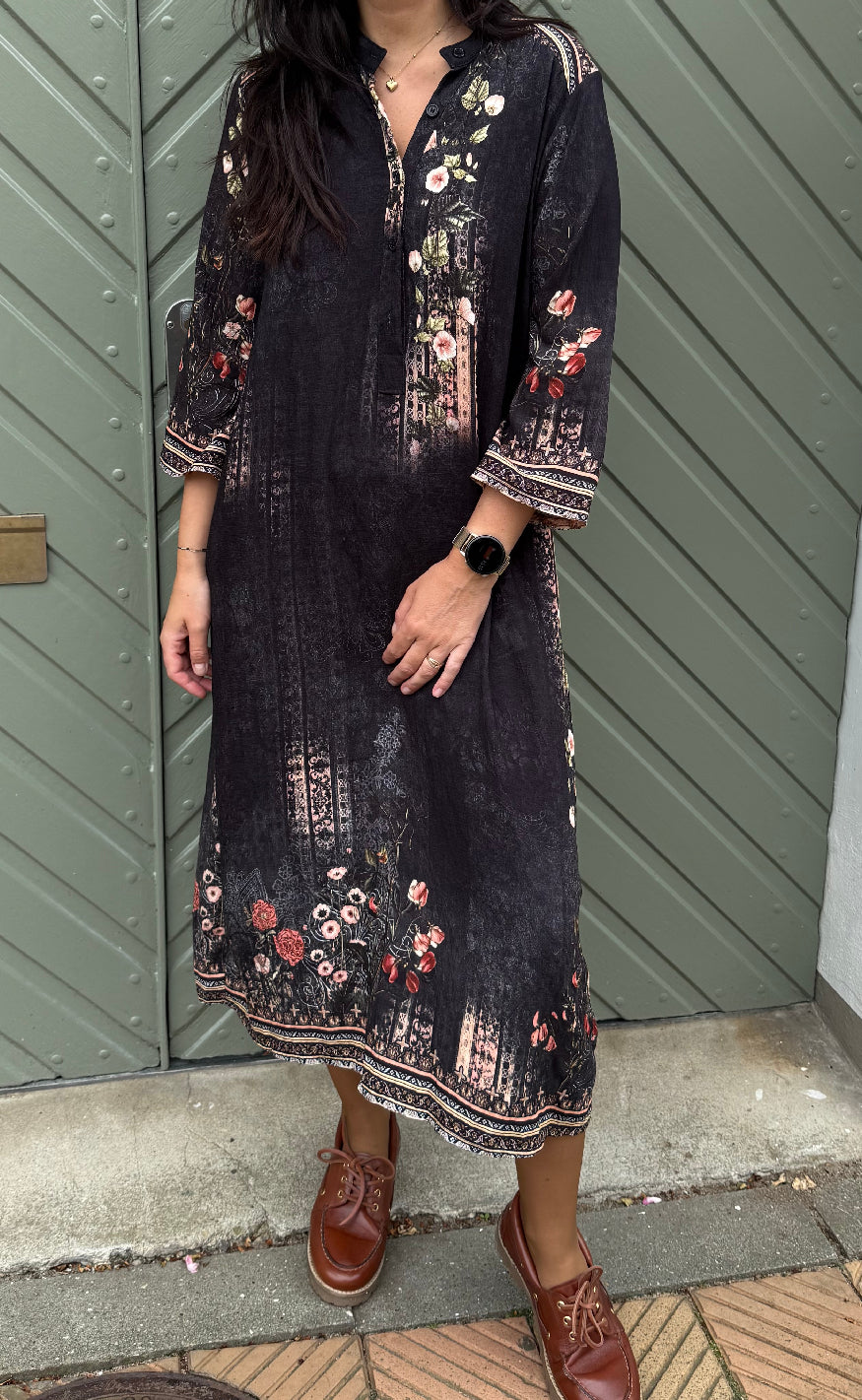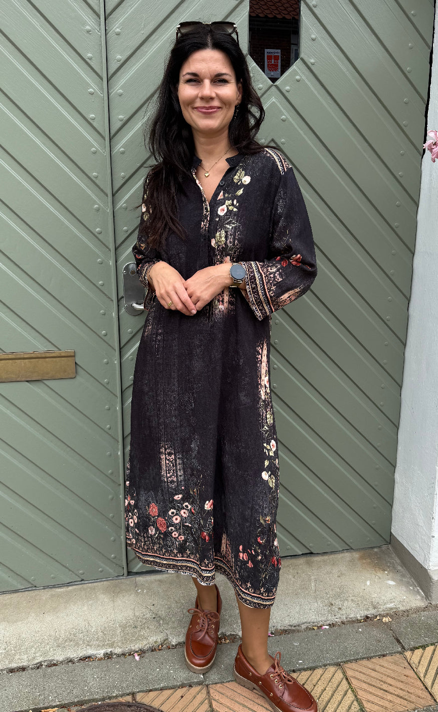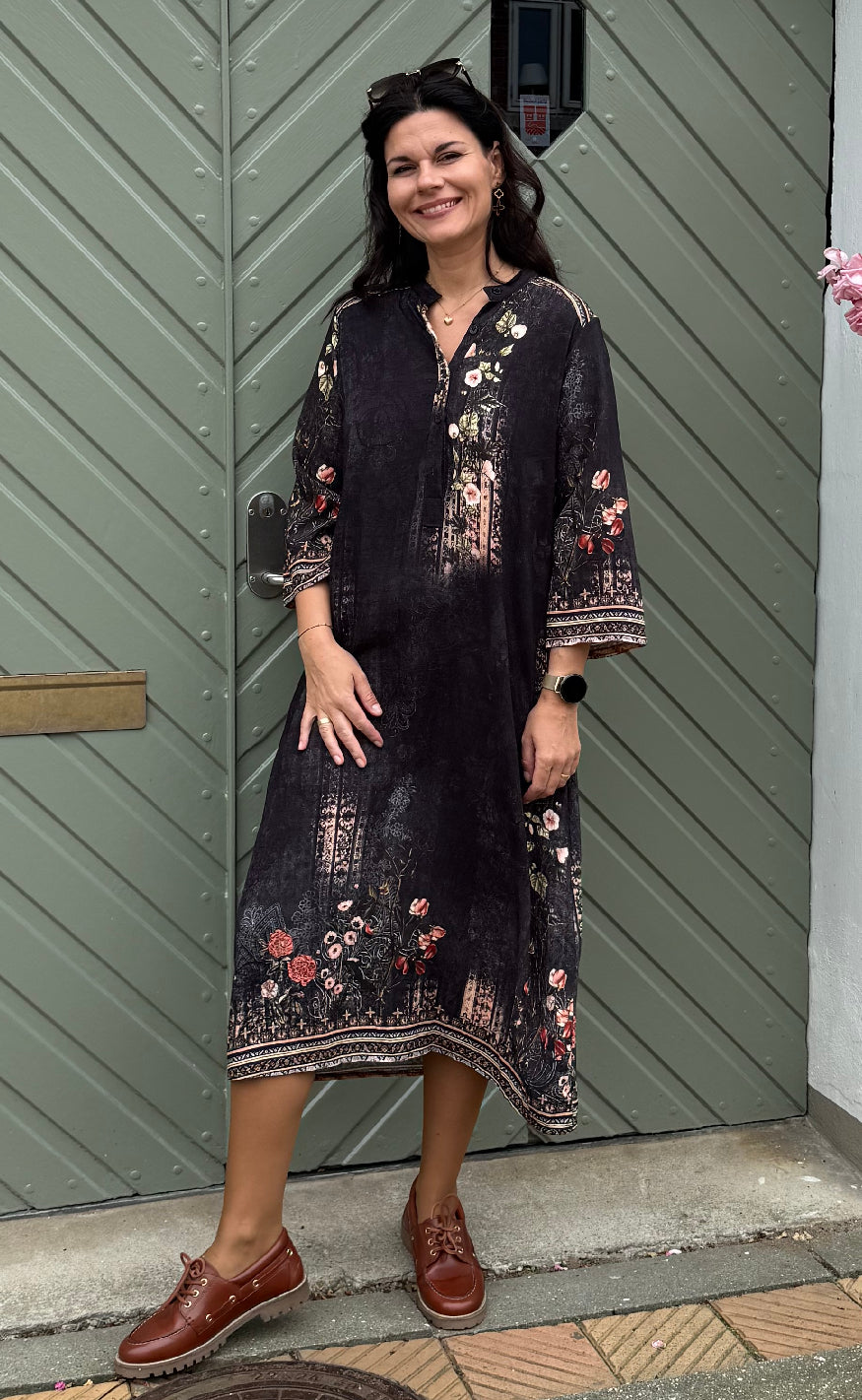Denne kjole er lang og har lange ærmer, hvilket gør den perfekt til efteråret.