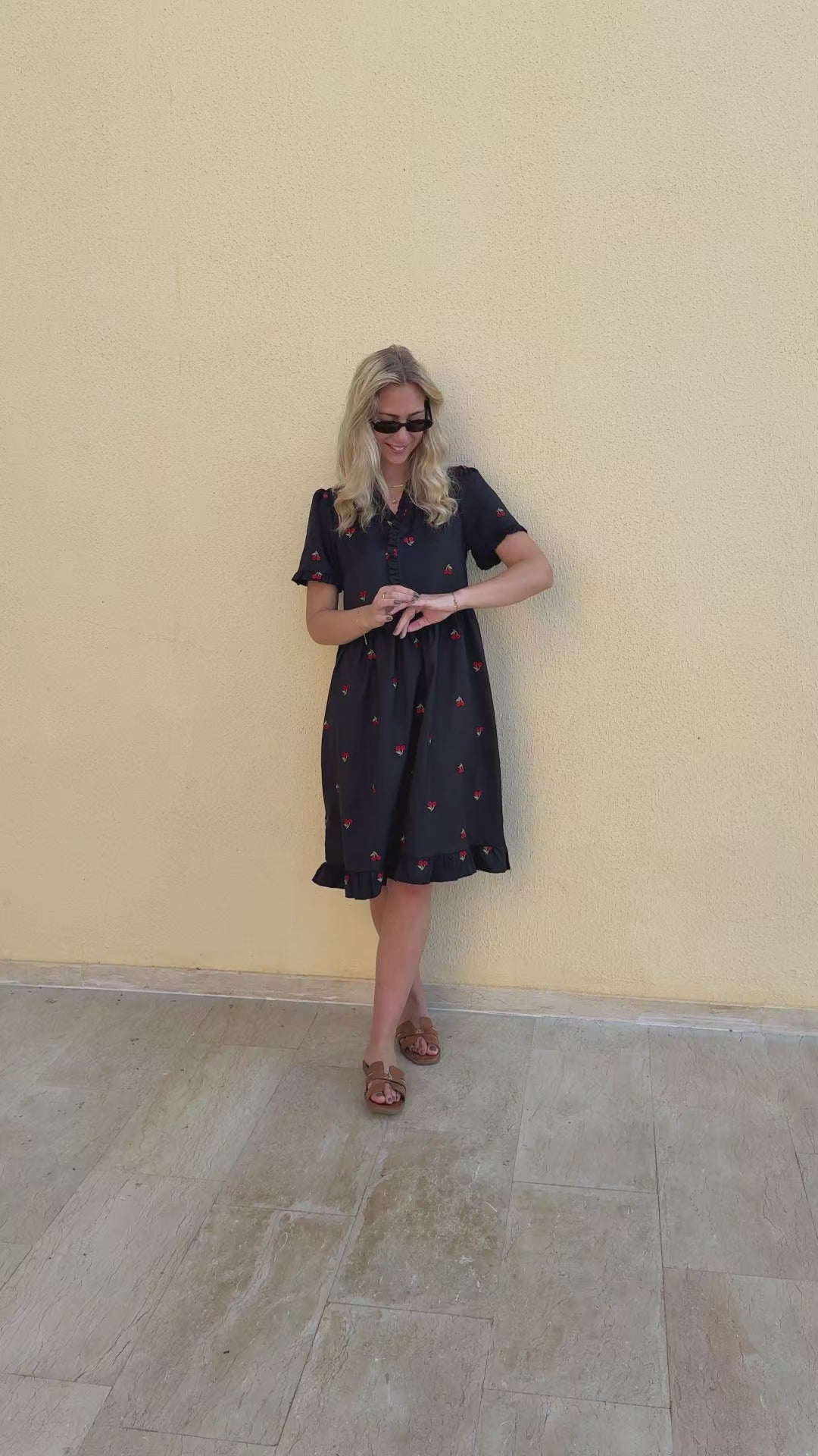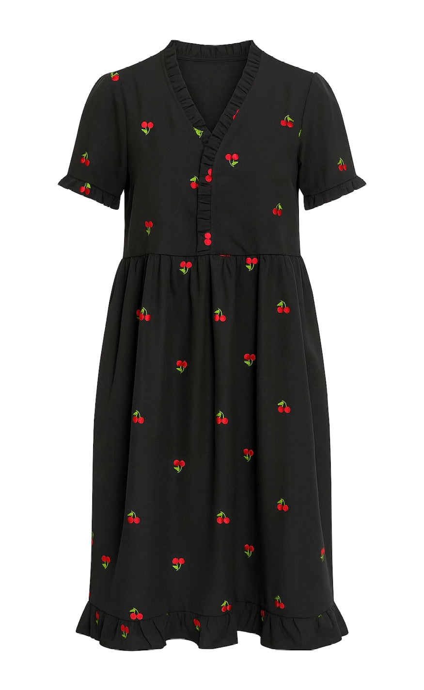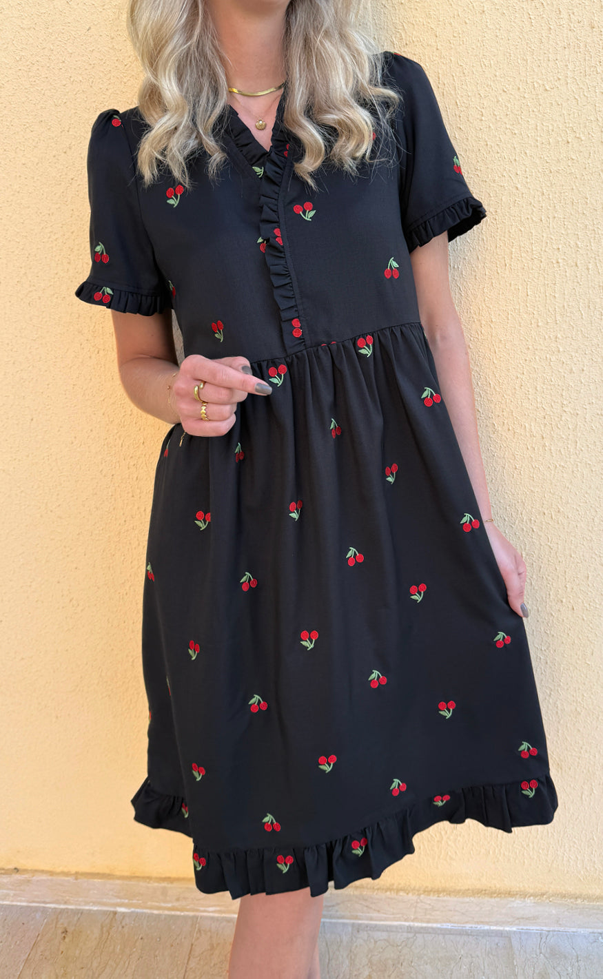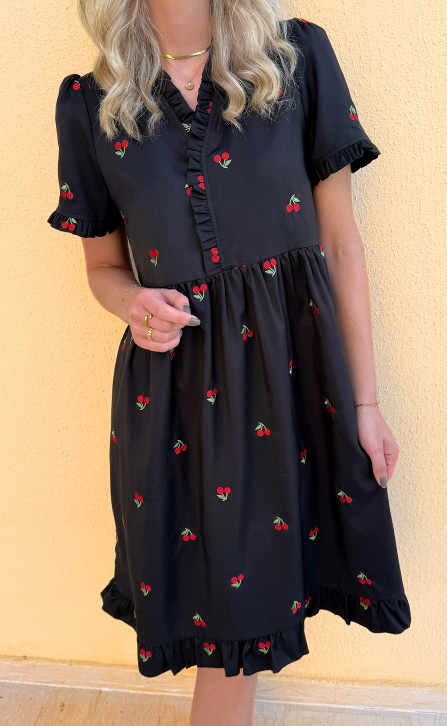 Smuk kjole fra INA Copenhagen i sort med broderede kirsebær.