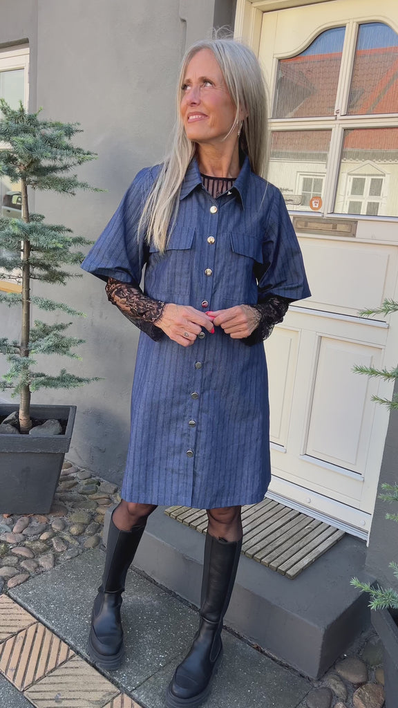 Flot kjole fra INA Copenhagen i denim blå med sorte nålestriber.