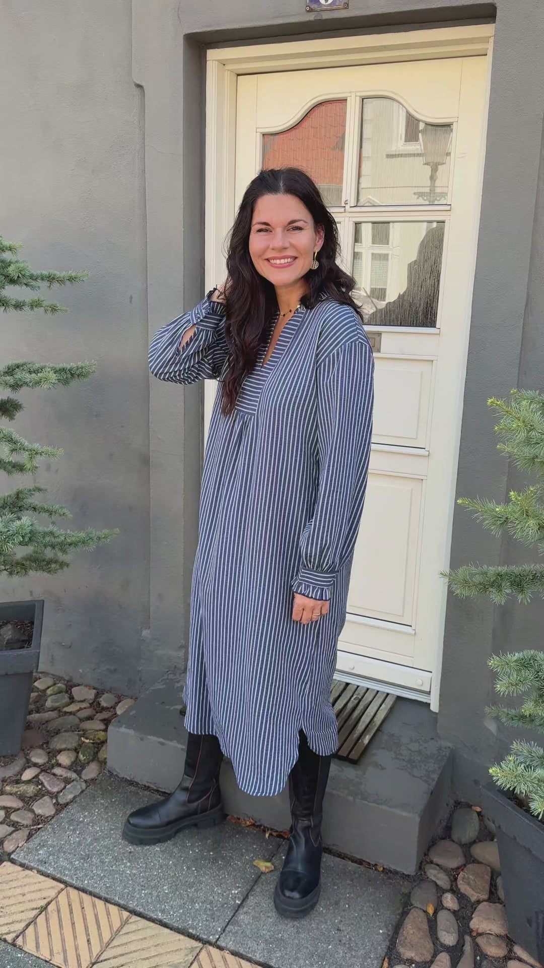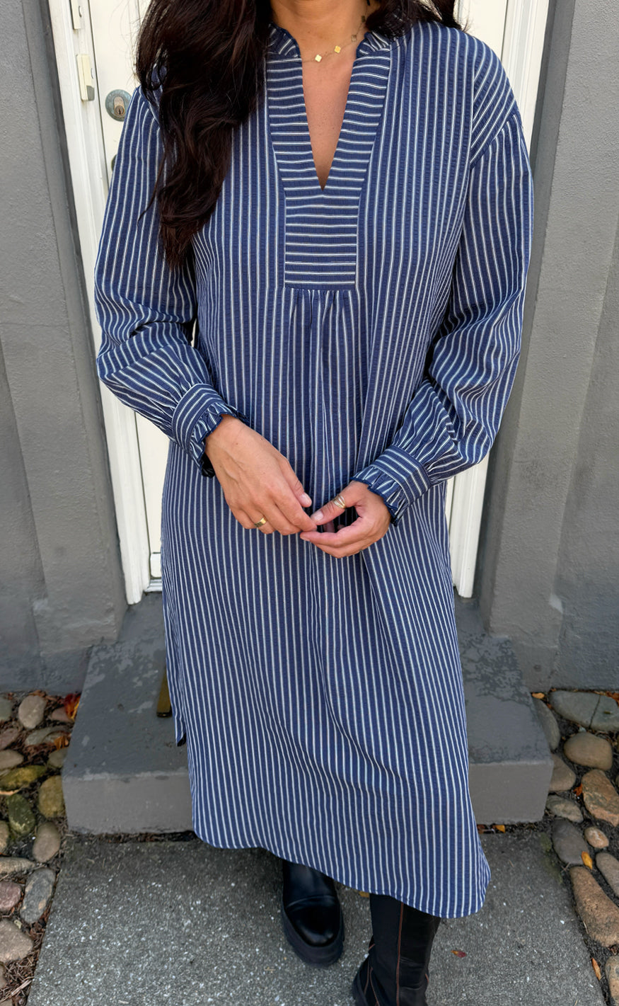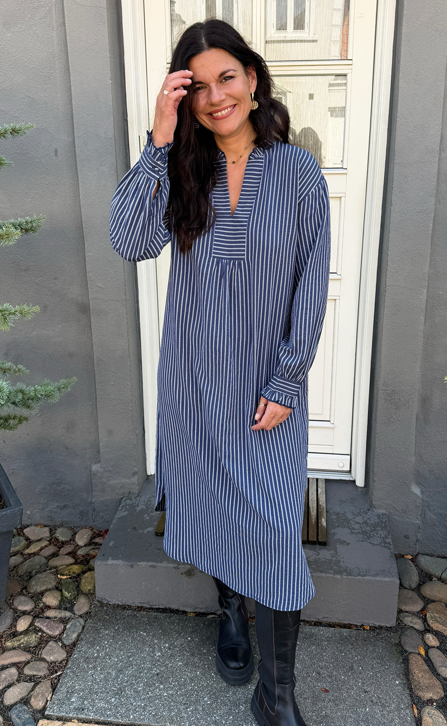 Smuk kjole fra Say INA Copenhagen i navy blå hvide striber.