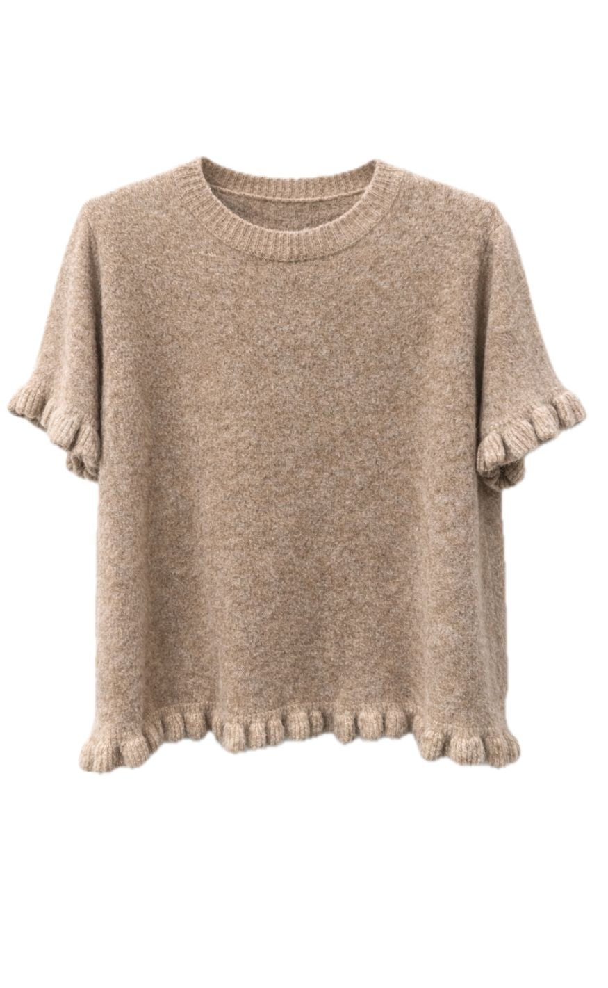 Kortærmet strikbluse i gul med blød, fluffy tekstur. Har ribkant ved halsen og bølget afslutning på ærmer og bund for et feminint touch.