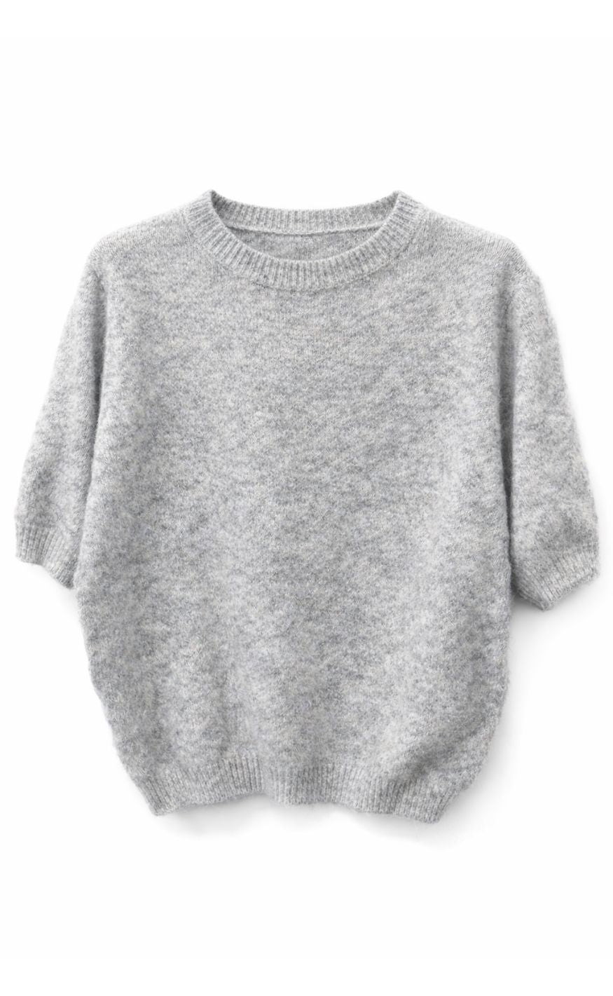 Grå kortærmet strikbluse med ribkant ved hals, ærmer og bund. Blød og fluffy tekstur giver et feminint og afslappet udtryk.
