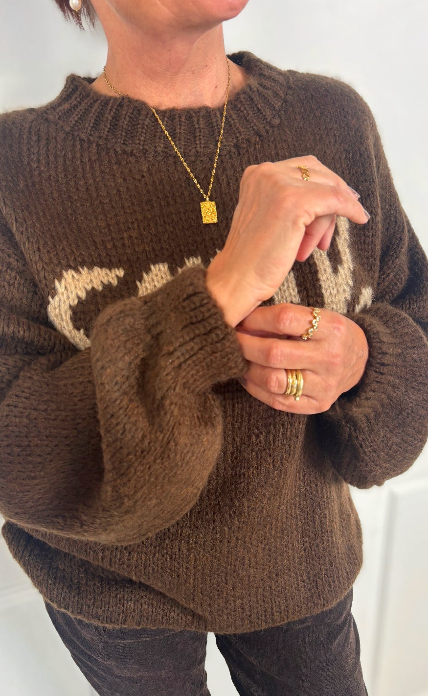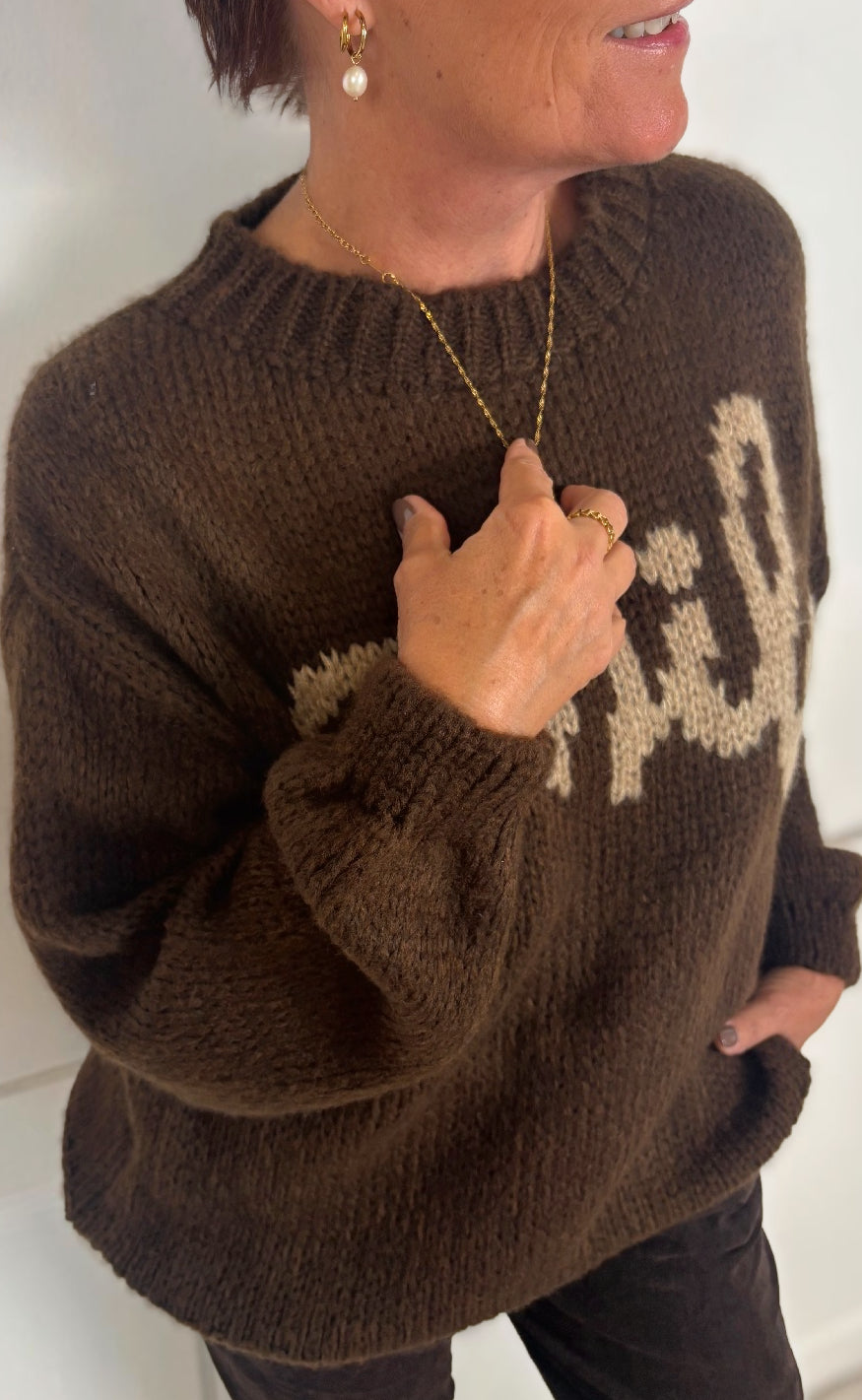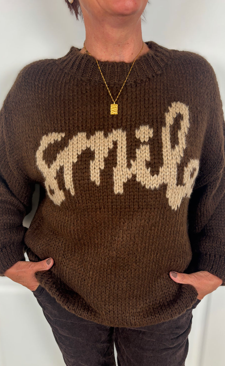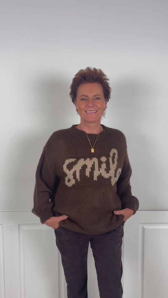Lækker striktrøje fra Marta Du Chateau i brun med skriften "Smile" stående på fronten.