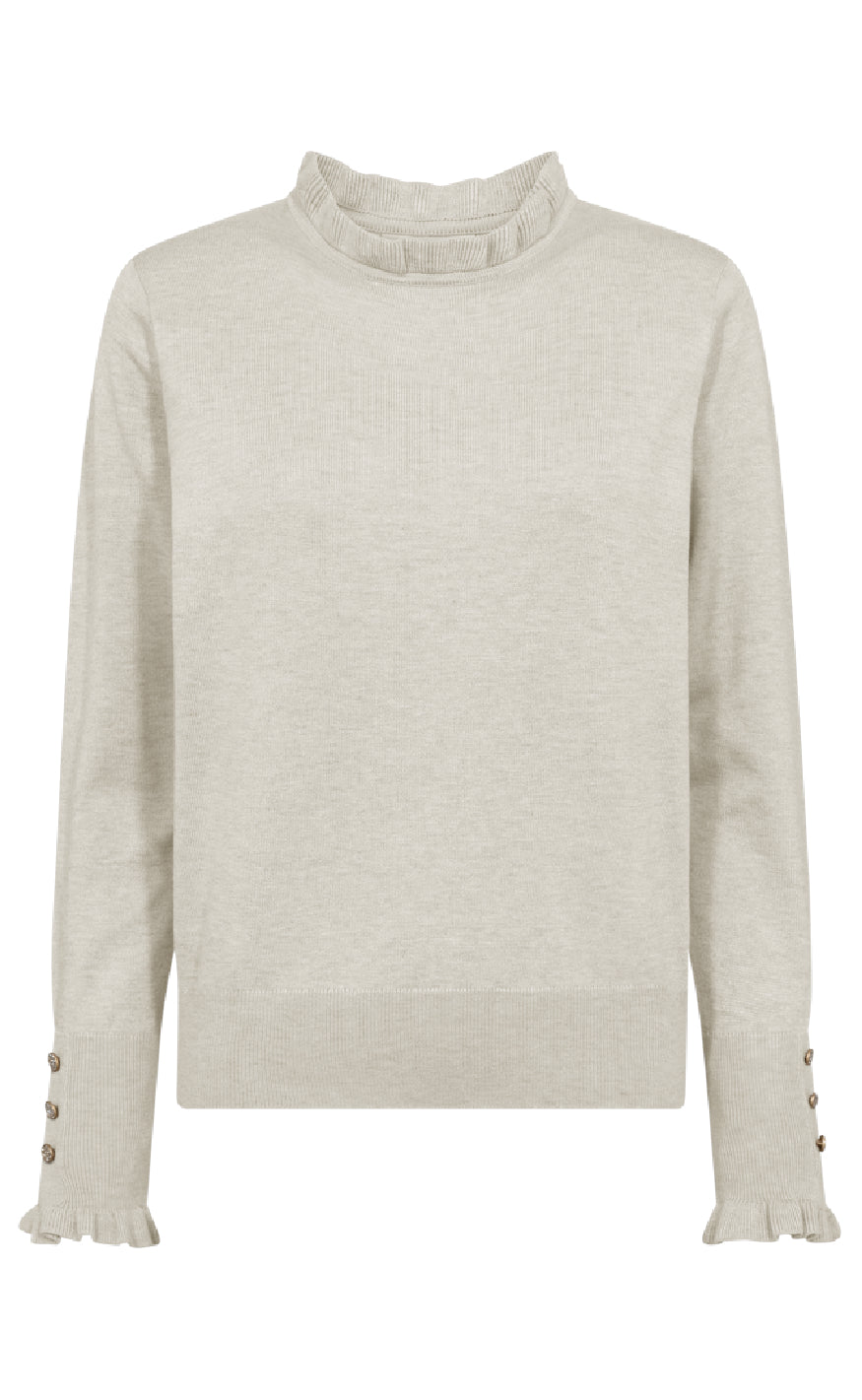 Lækker bluse fra Freequent i et blødt, finstrikket materiale. Blusen har flæser i halsudskæringen og dekorative knapper med små rhinsten på ærmerne
