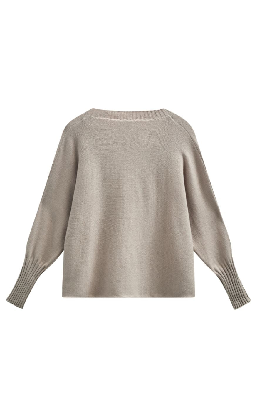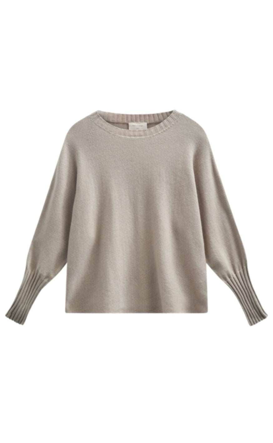 Beige strik fra Freequent med O-ribstrikket hals og lange ærmer med brede ribkanter.