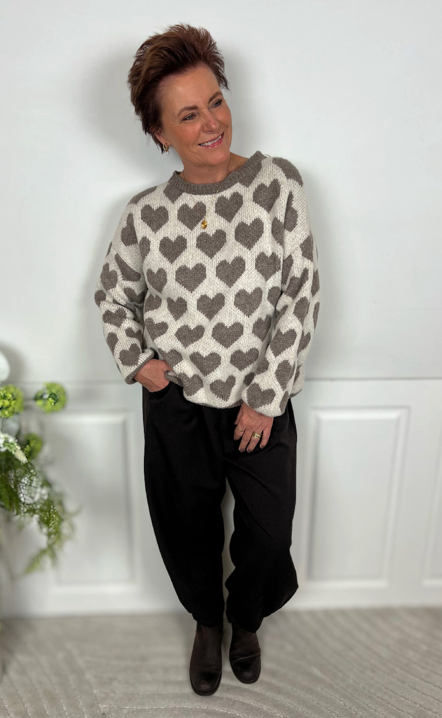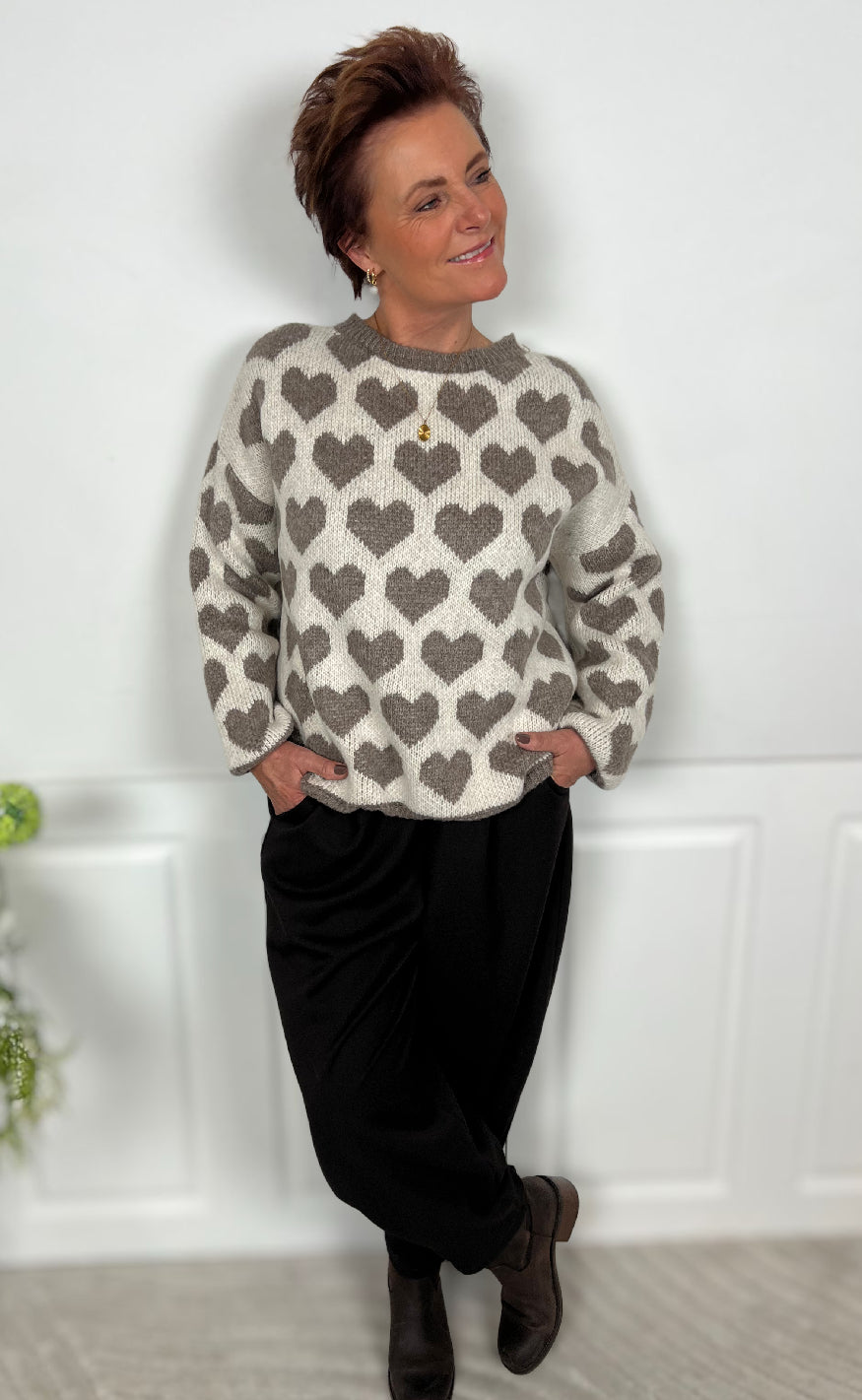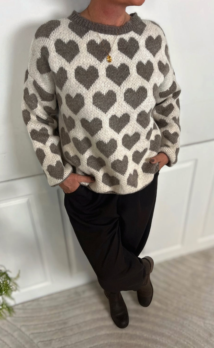 Blød striktrøje fra Marta Du Chateau i beige med brune hjerter over hele designet.