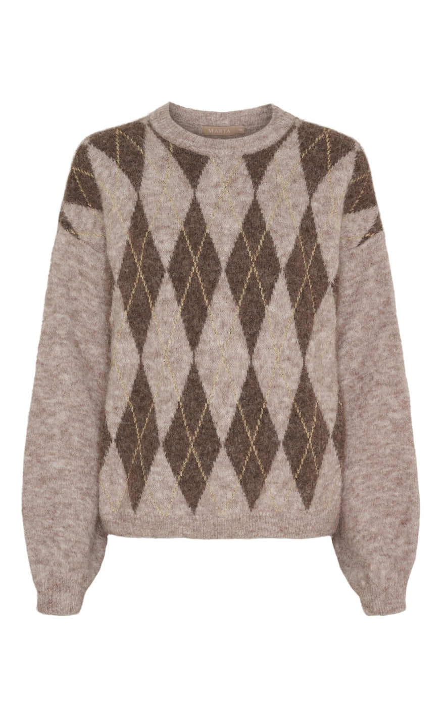 Blød striktrøje fra Marta Du Chateau med klassisk argyle-mønster i brune, beige og guld nuancer.