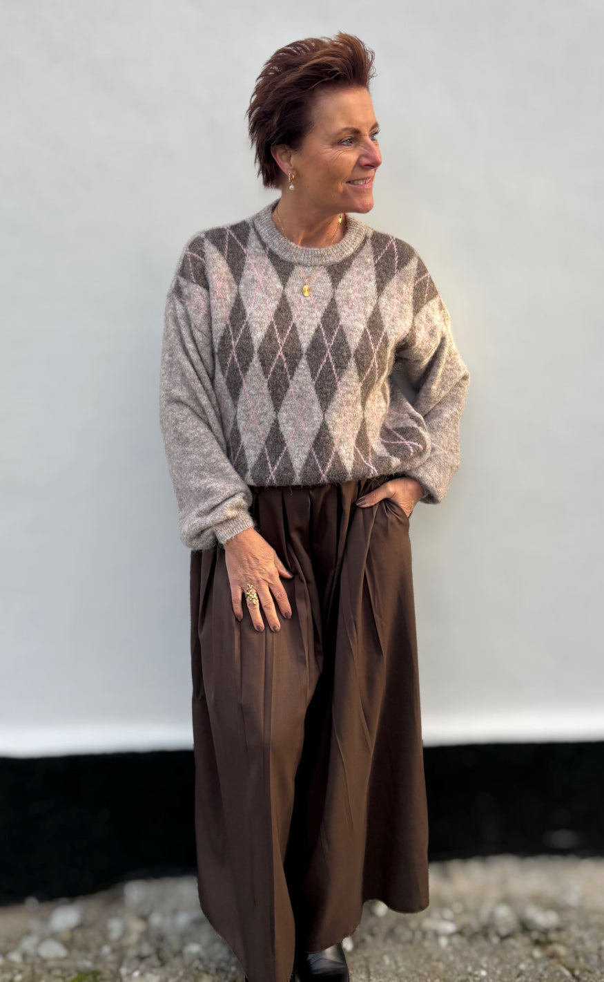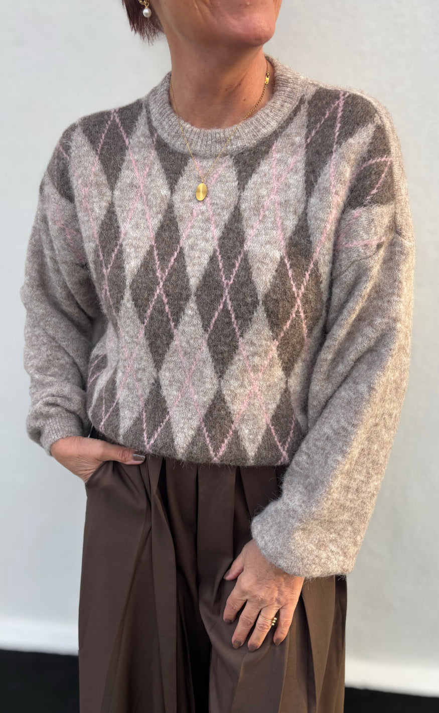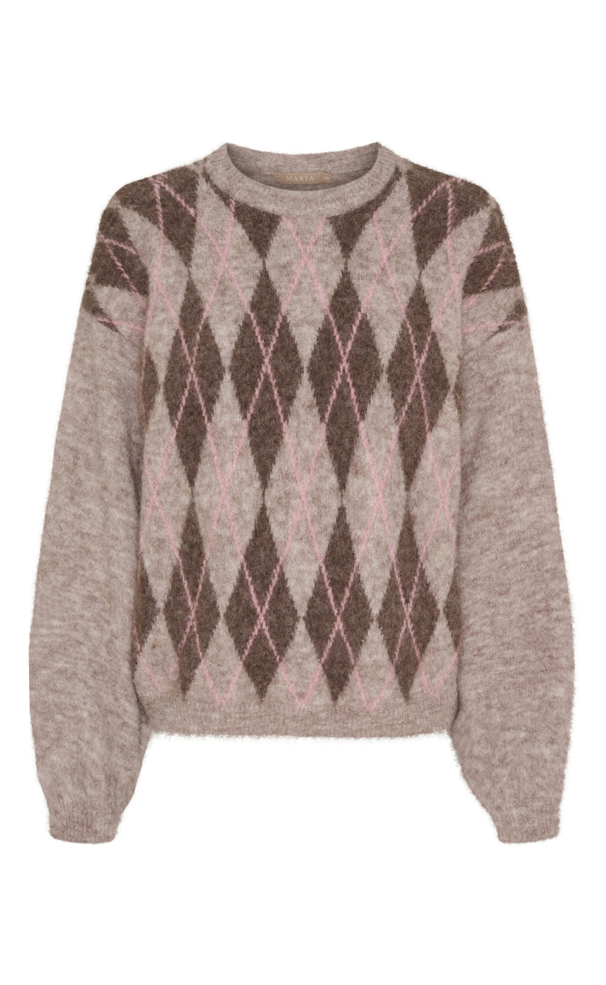 Blød striktrøje fra Marta Du Chateau med klassisk argyle-mønster i brune, beige og lyserøde nuancer.