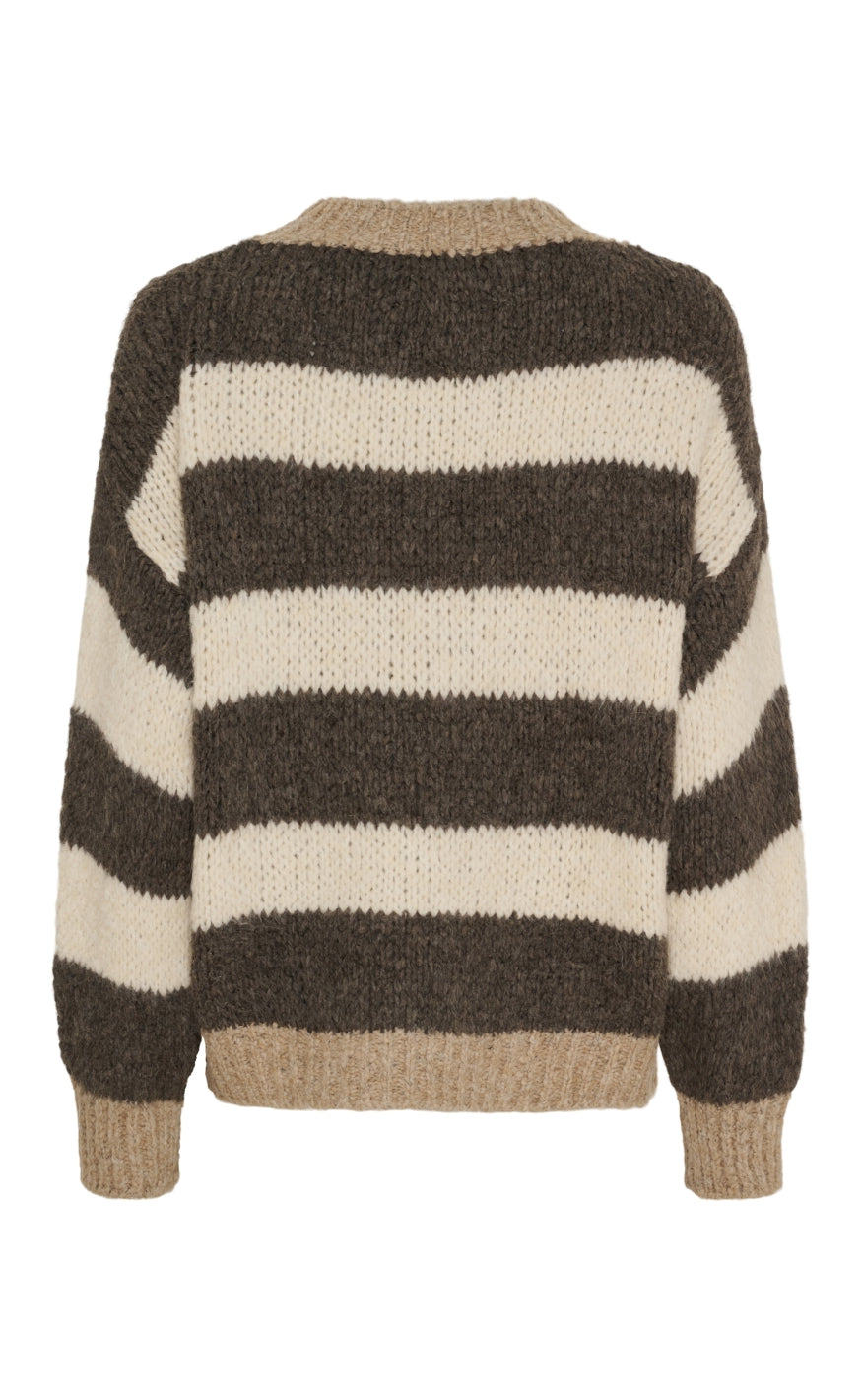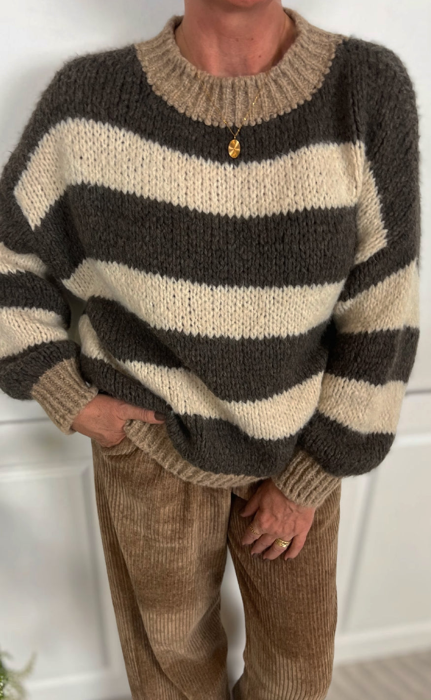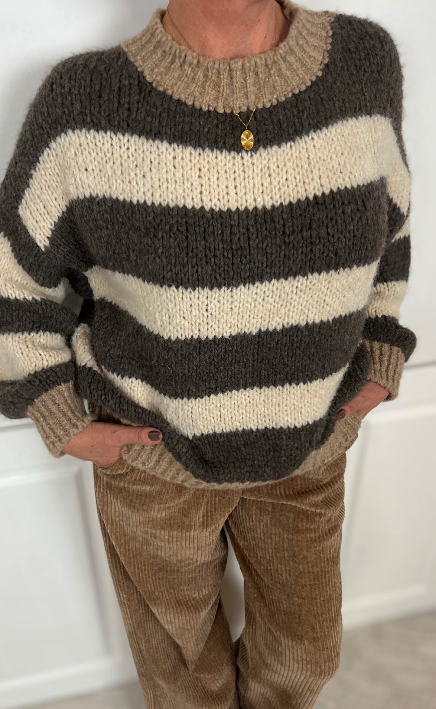 Chunky strik fra Marta Du Chateau med brede striber i grå og creme.