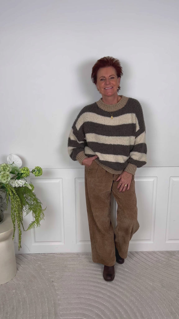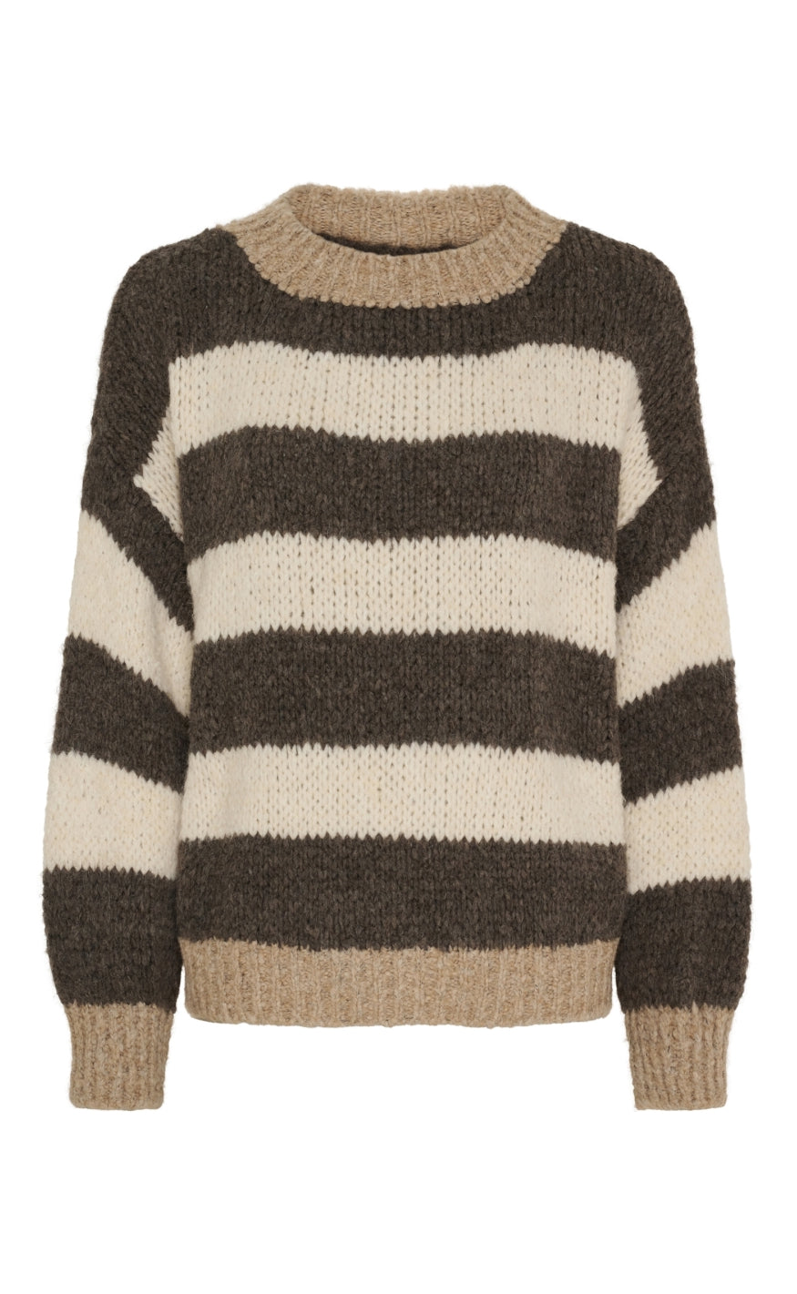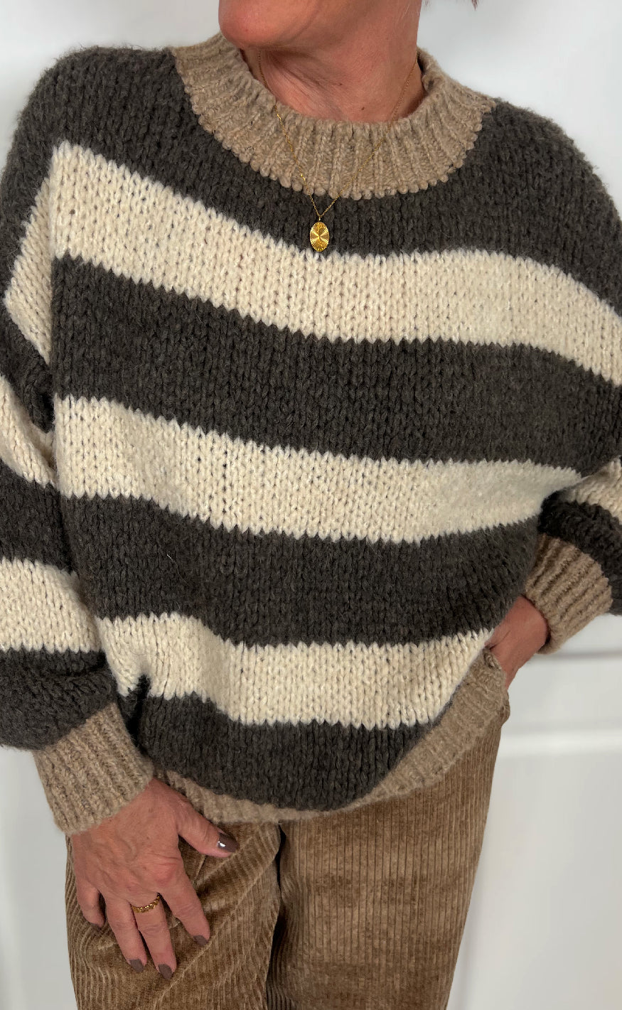 Chunky strik fra Marta Du Chateau med brede striber i grå og creme.
