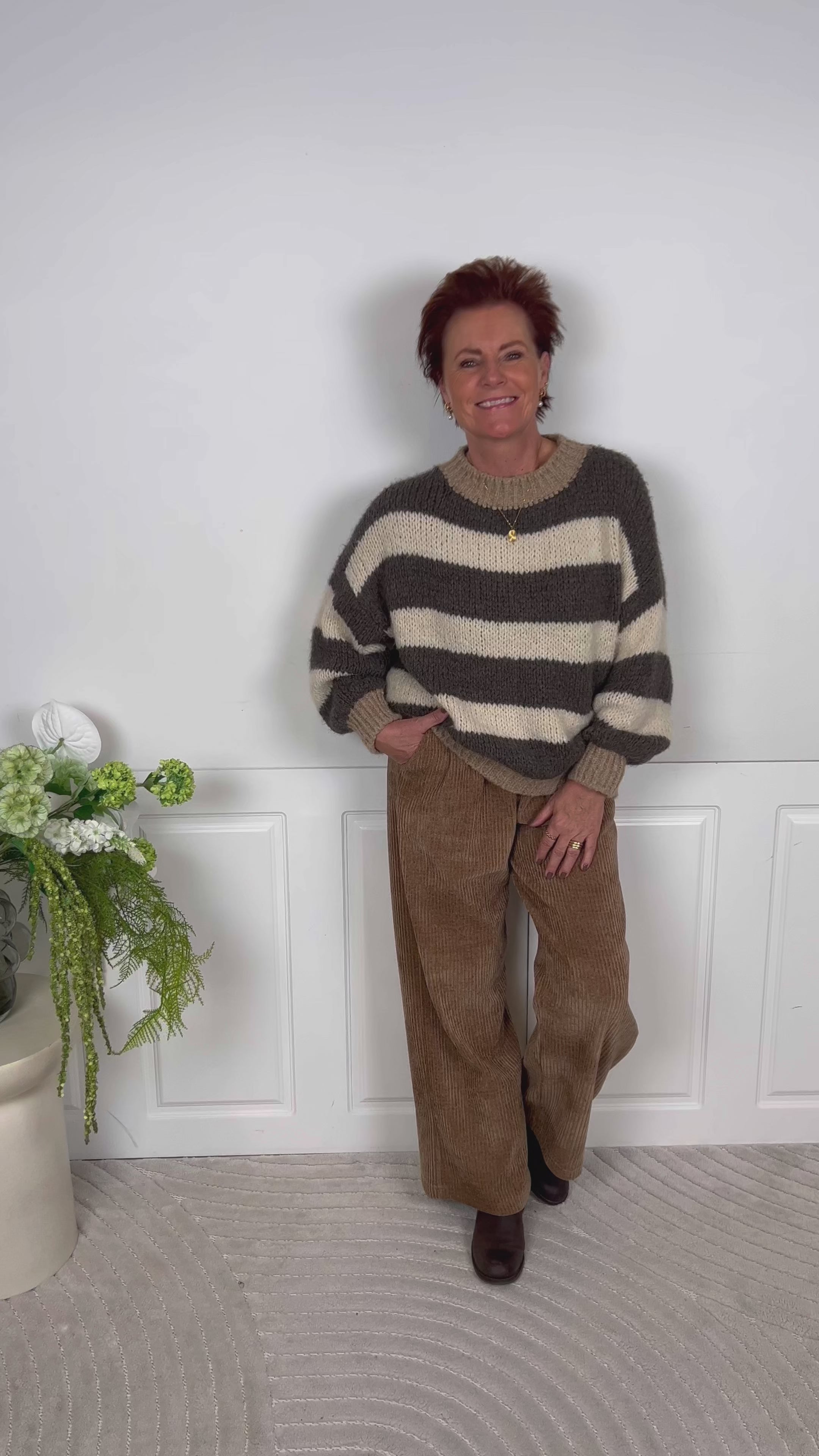 Strikken har rund hals med ribkant, lange ærmer og en løs pasform, der giver et hyggeligt og casual look. Perfekt til kølige dage og til at style med jeans eller nederdel for et afslappet outfit.