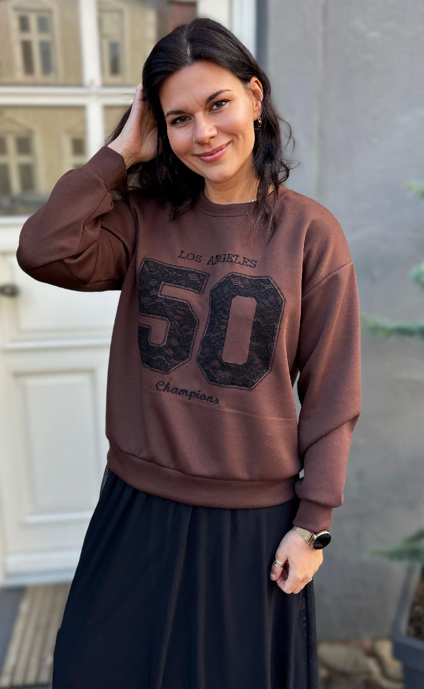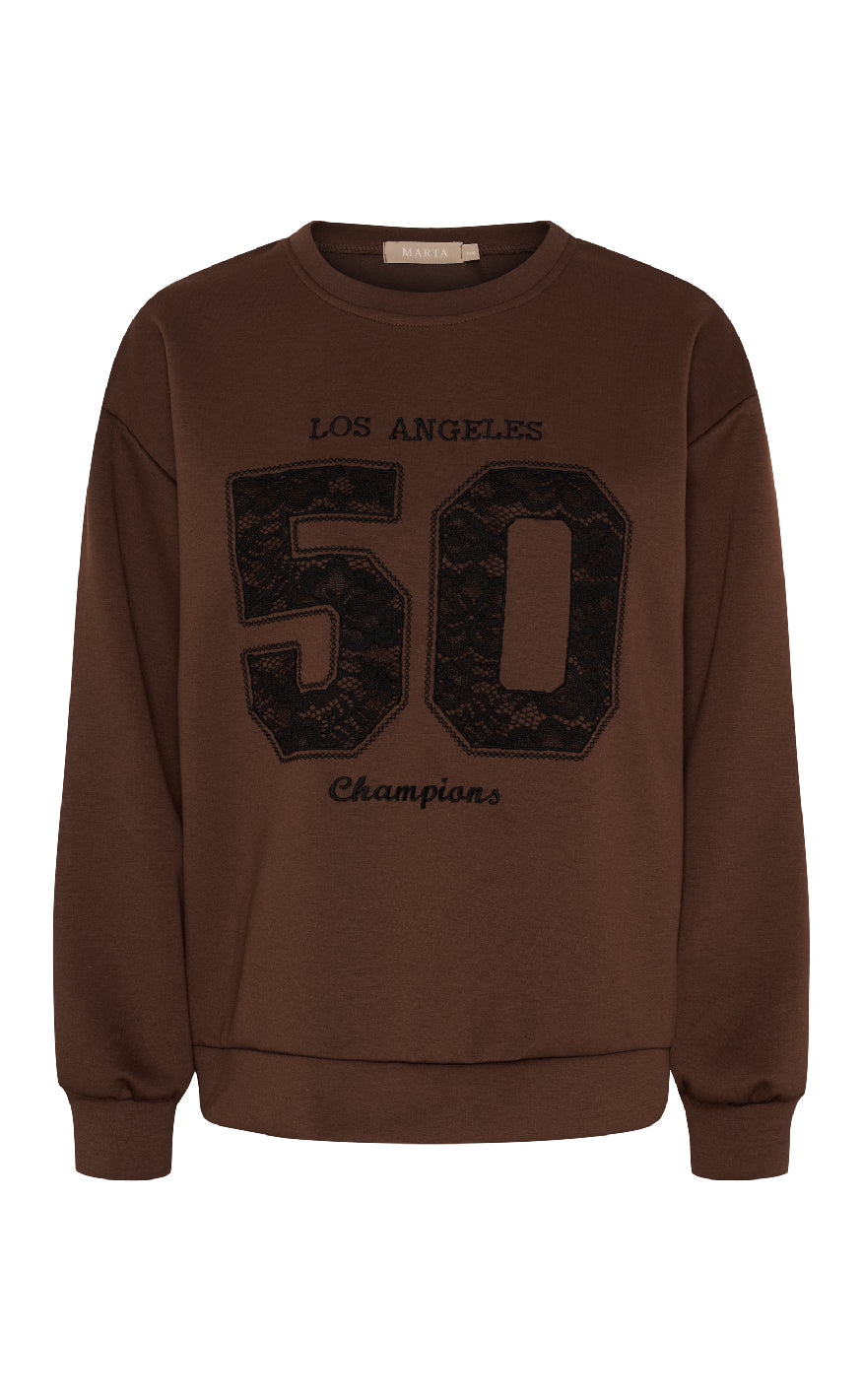 Lækker sweatshirt fra Marta Du Chateau i brun med skrift, med blonde.