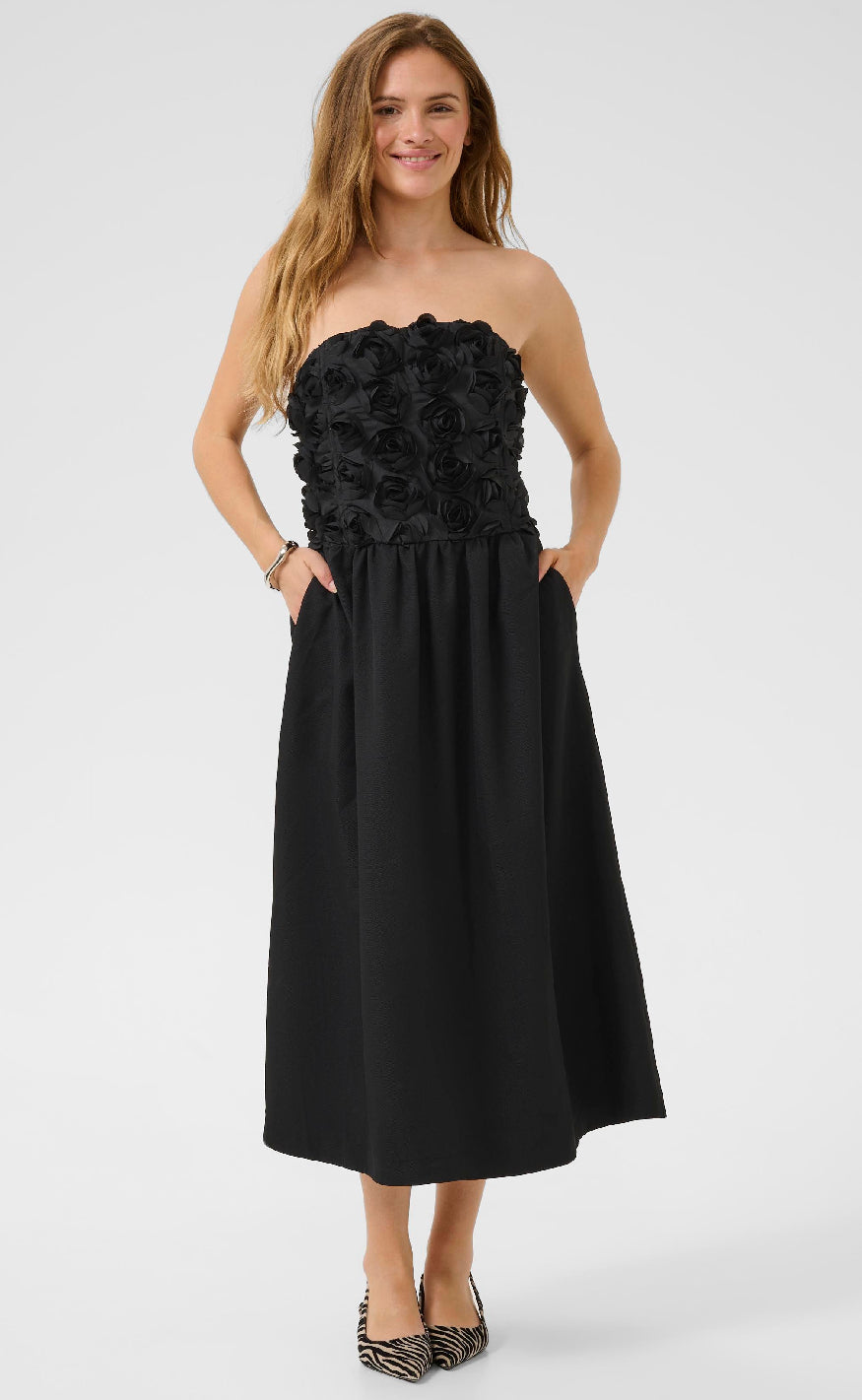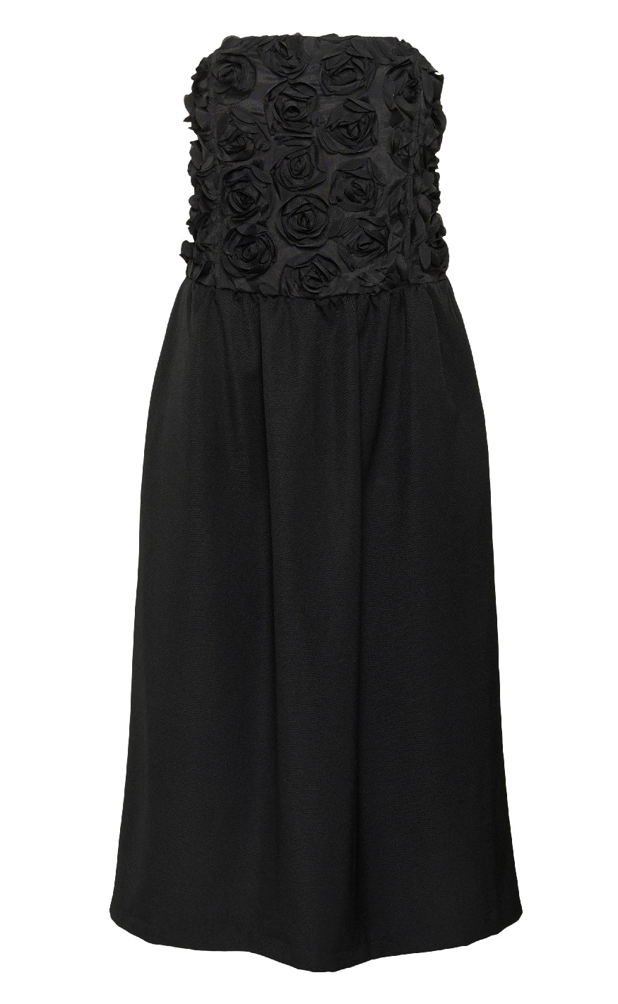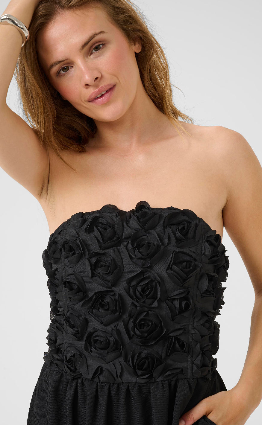 Sort stropløs kjole fra Culture med dekorative stofroser på overdelen.