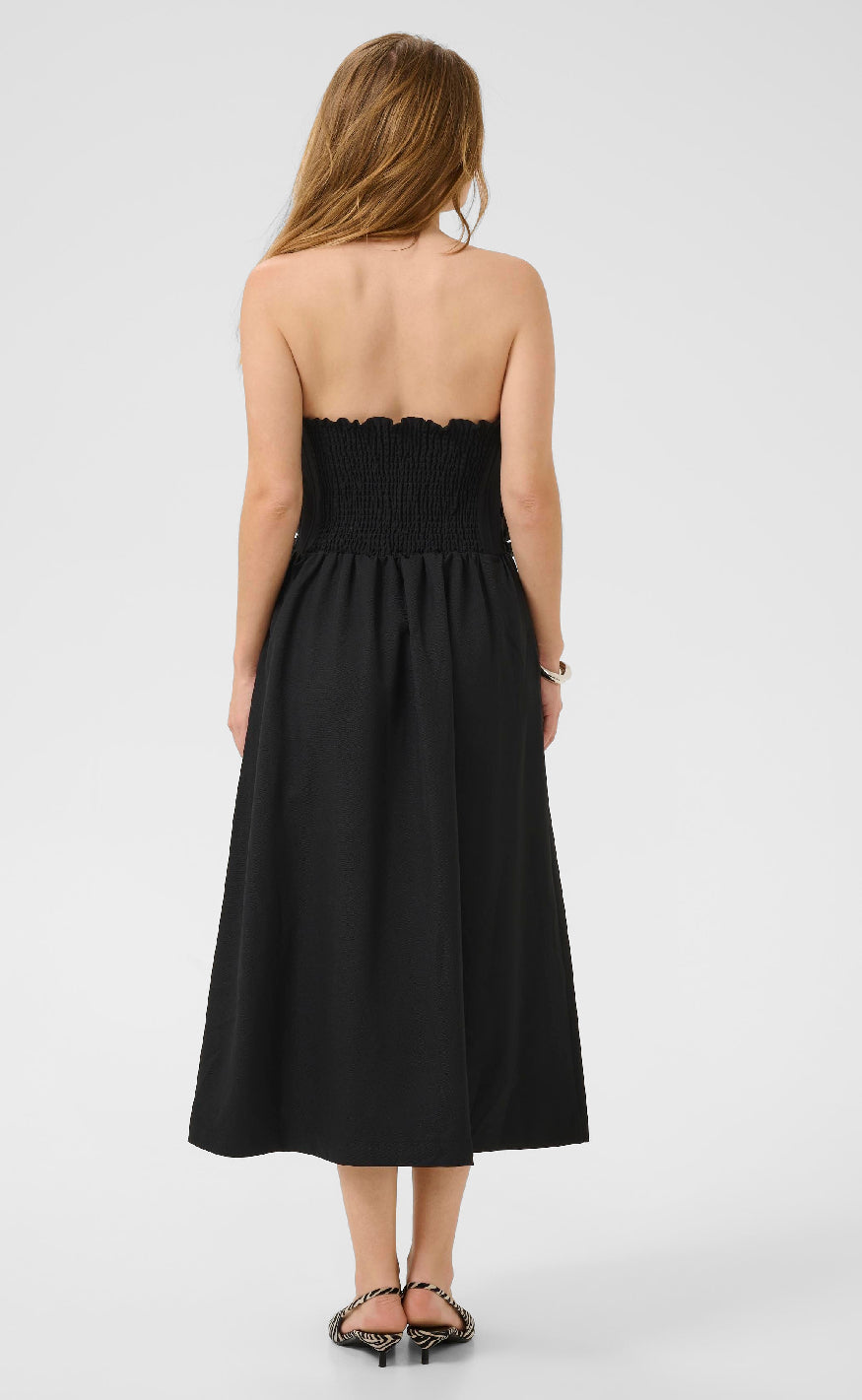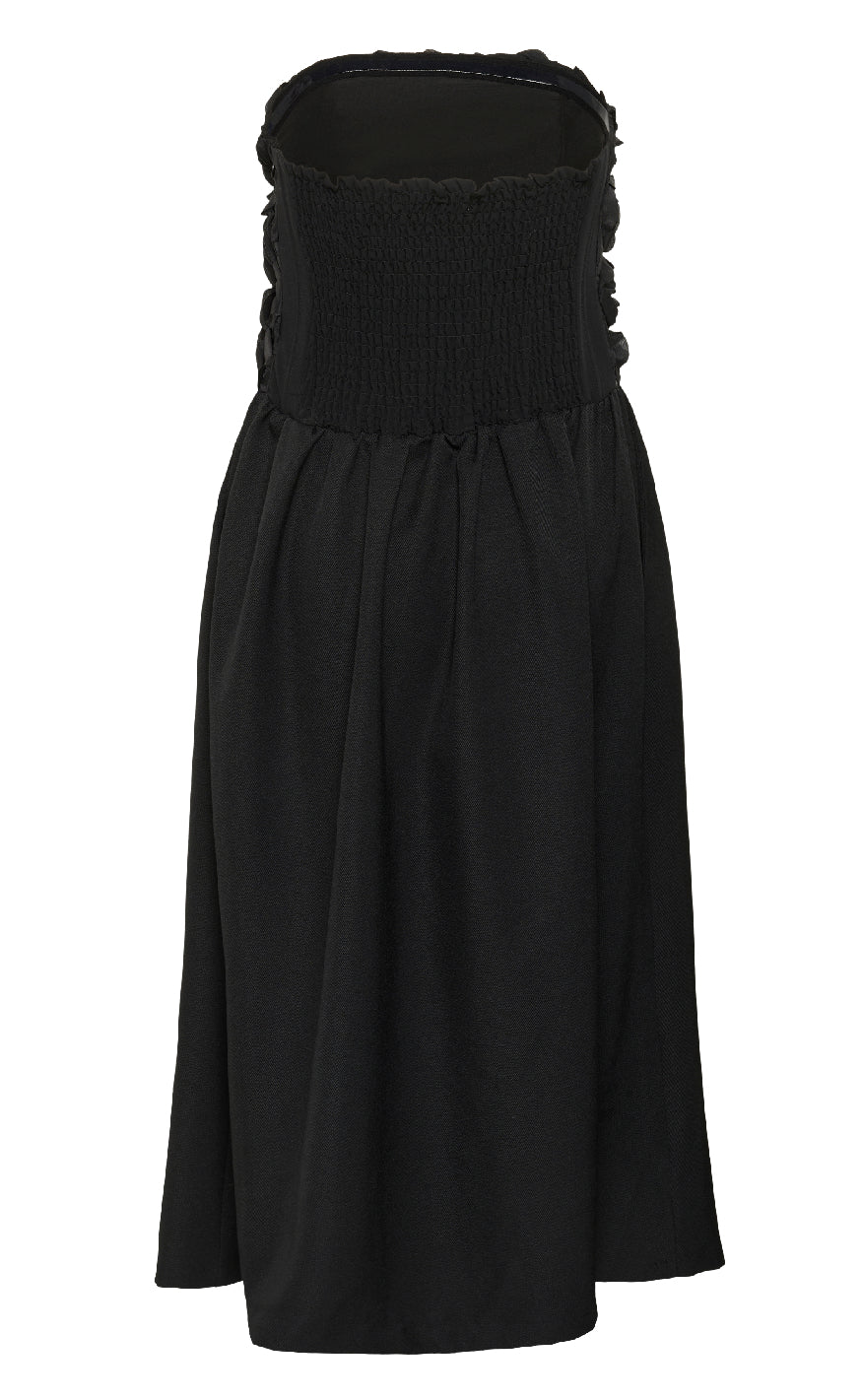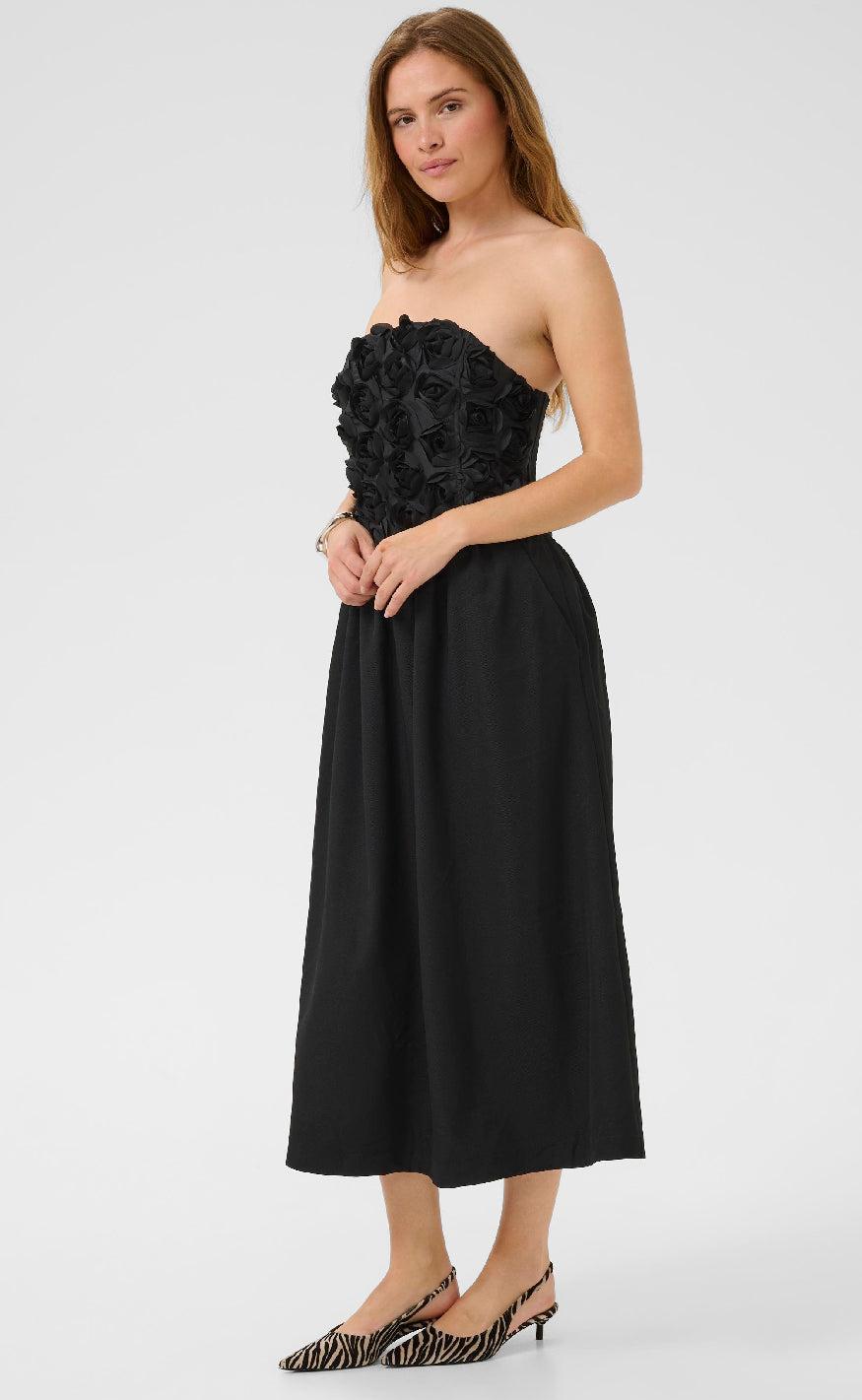 Sort stropløs kjole fra Culture med dekorative stofroser på overdelen.