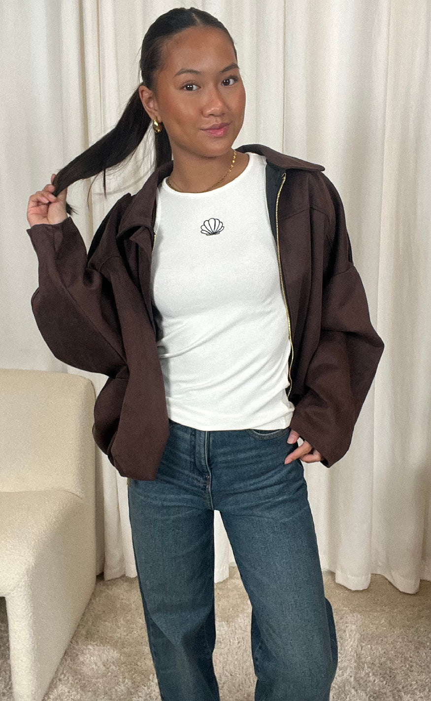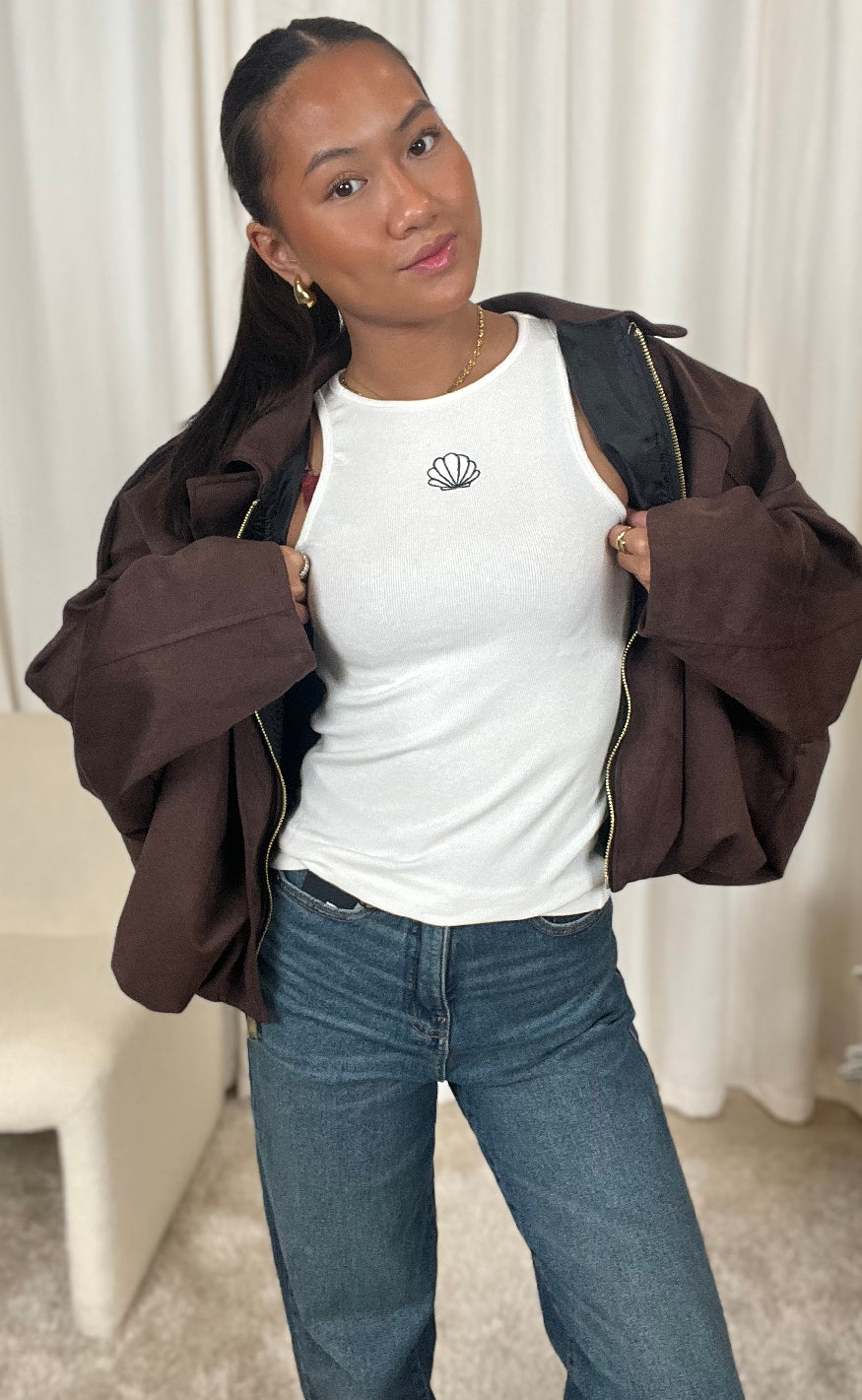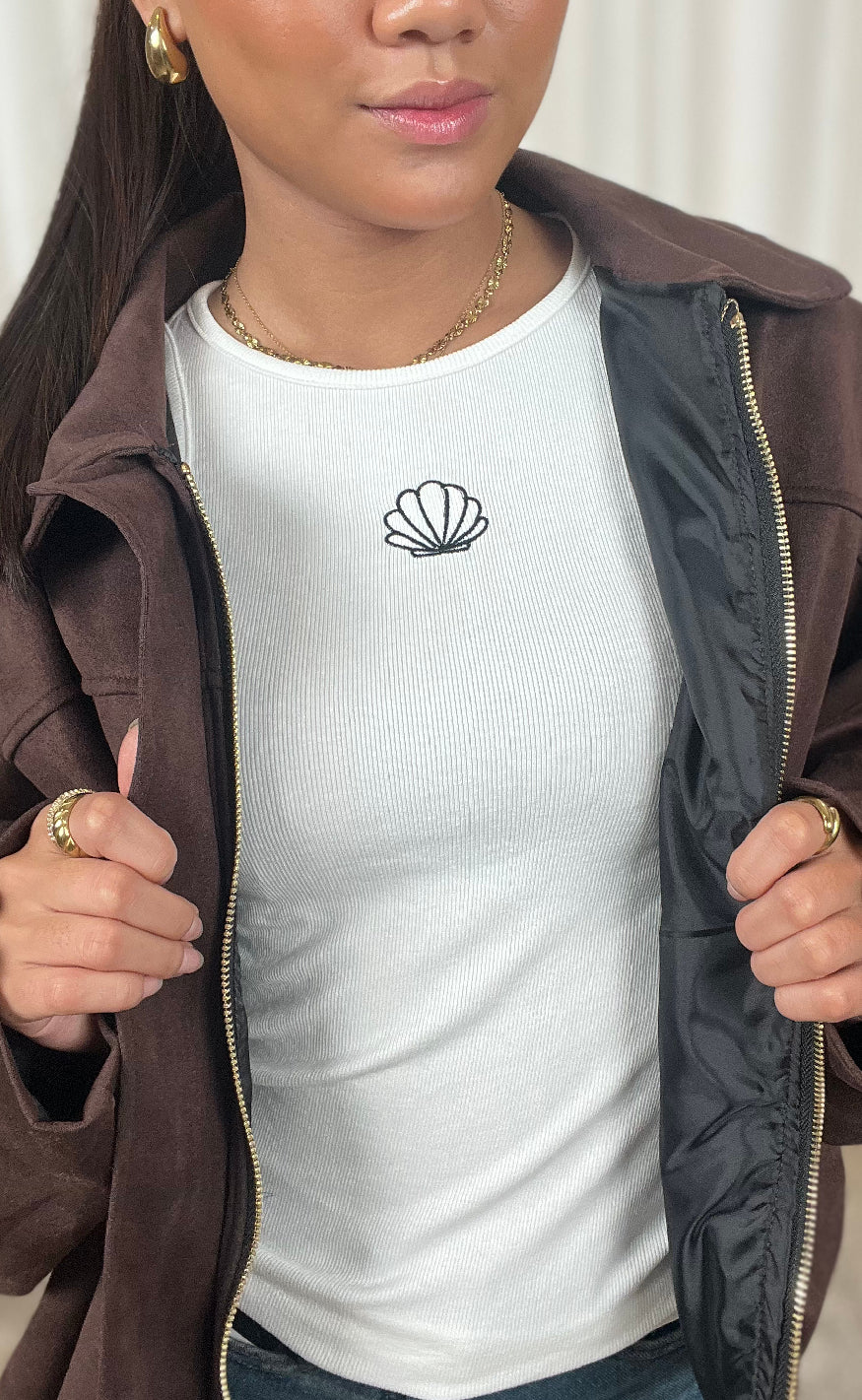 Flot top fra INA Copenhagen i hvid med en broderet skal i sort.