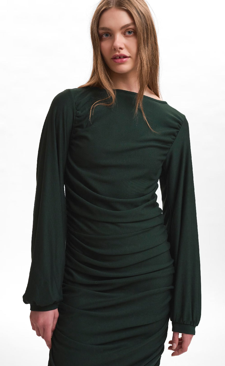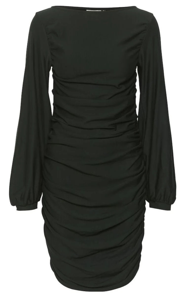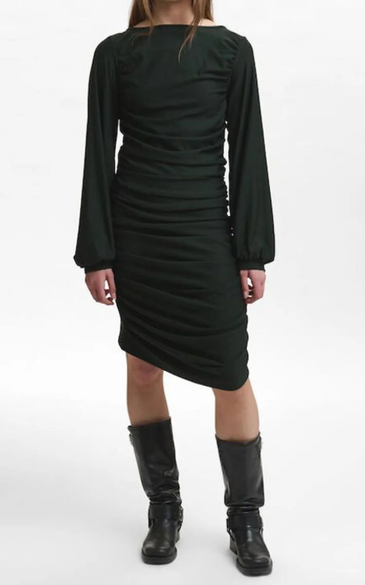 Mørkegrøn kjole fra Gestuz med lange ærmer og en elegant, draperet detalje langs siderne, der skaber en flatterende silhuet.