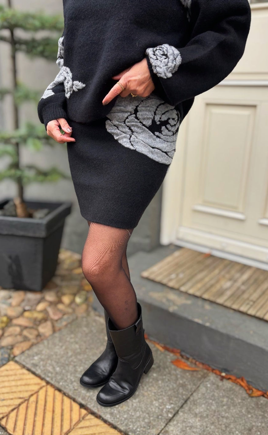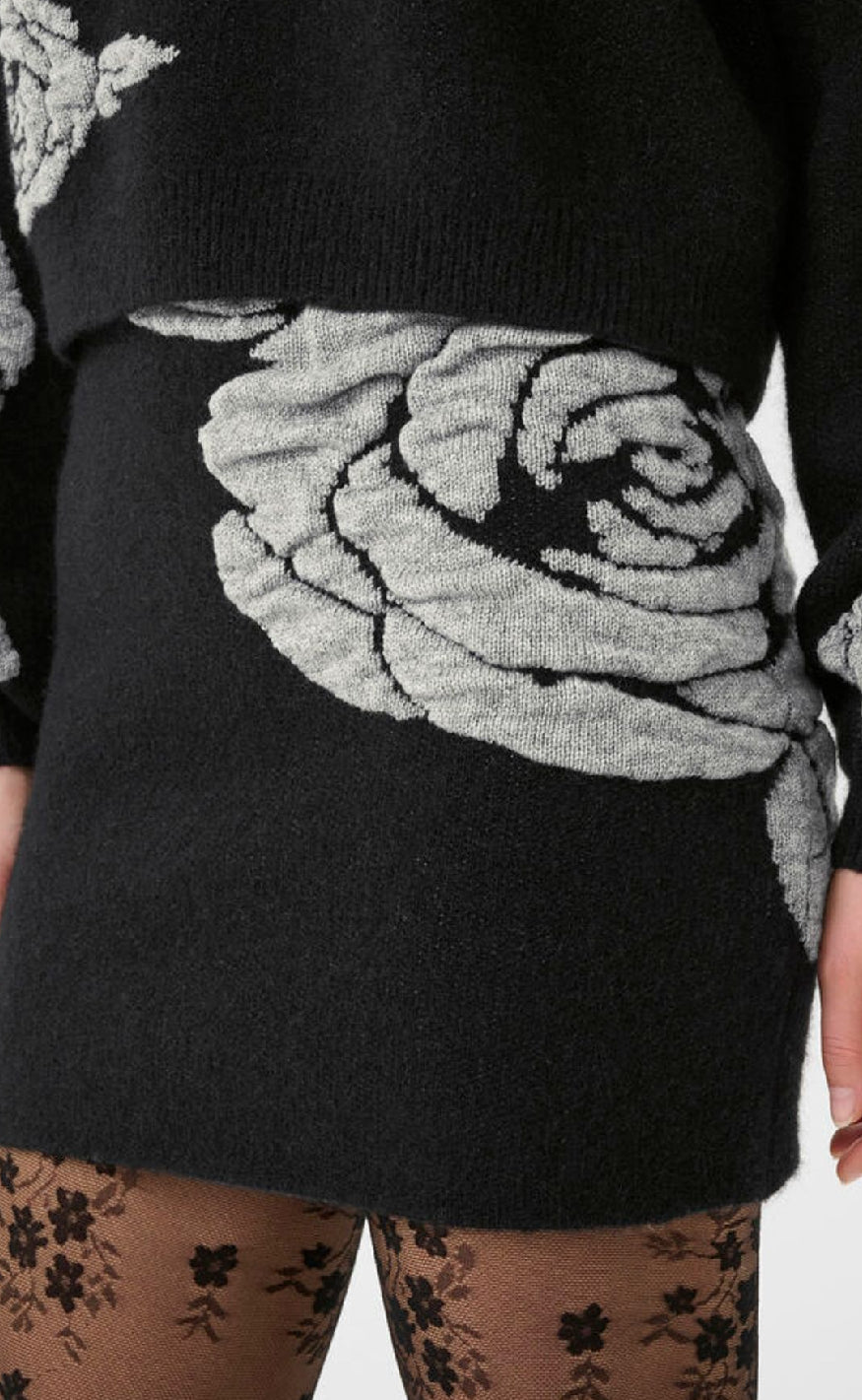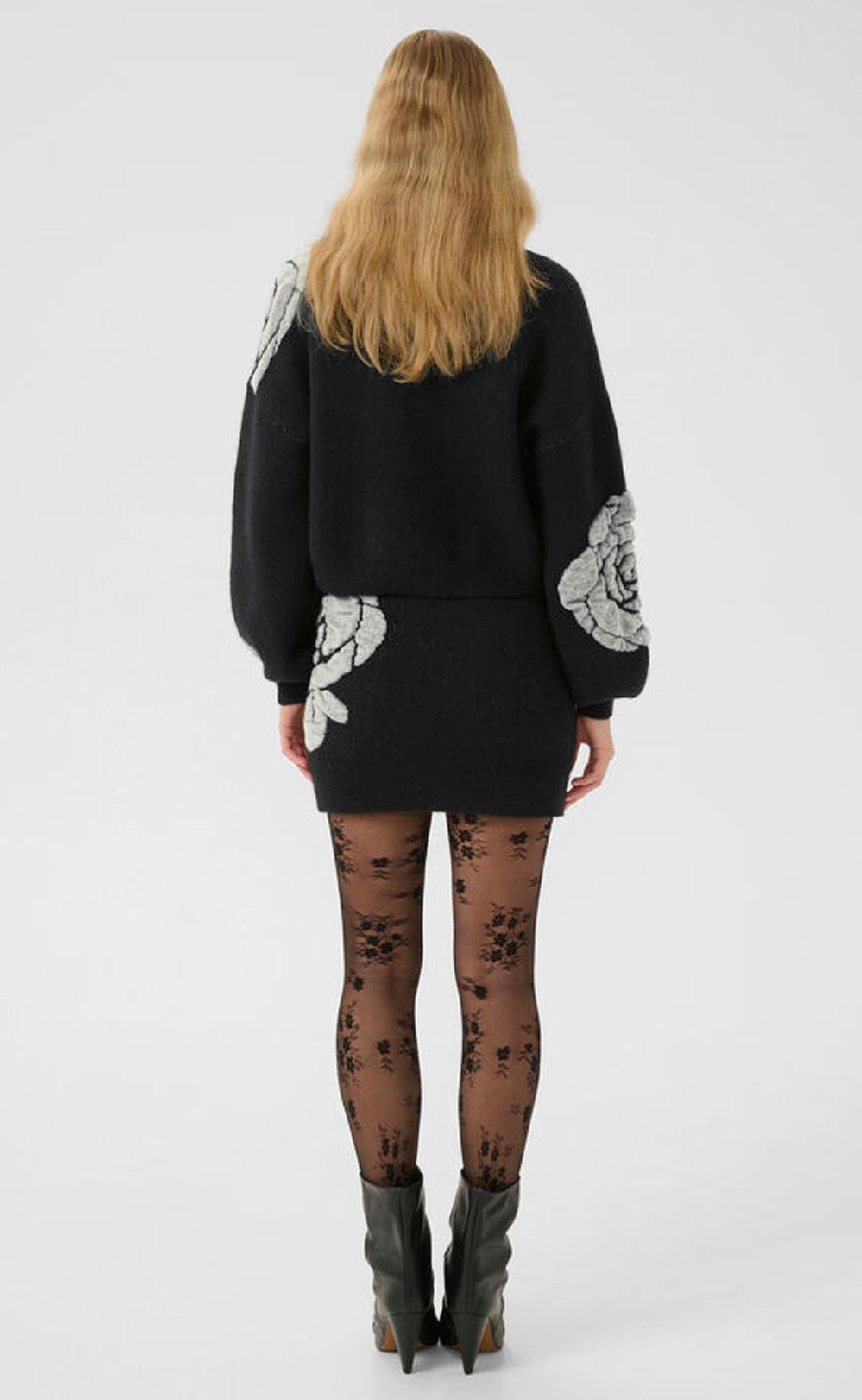 Fin strik nederdel fra Gestuz i sort med en hvid blomster detalje.