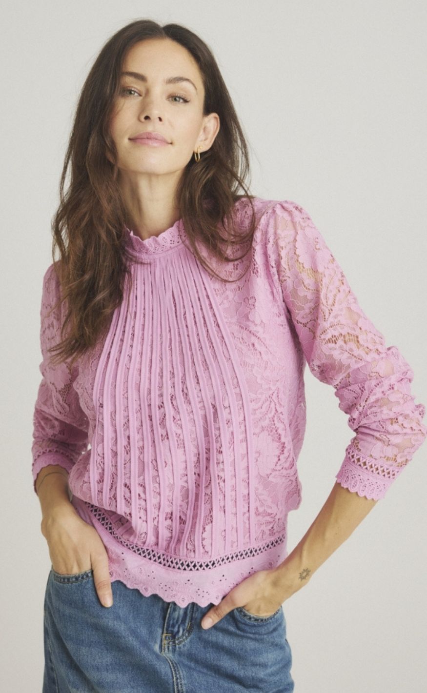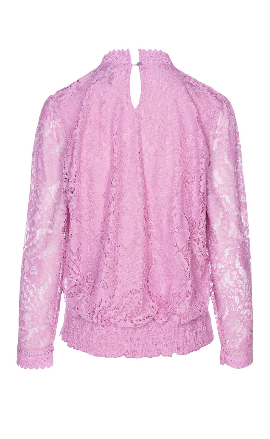 Blusen har blonde ærmer, høj blonde-hals og mange andre fine detaljer.