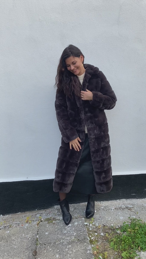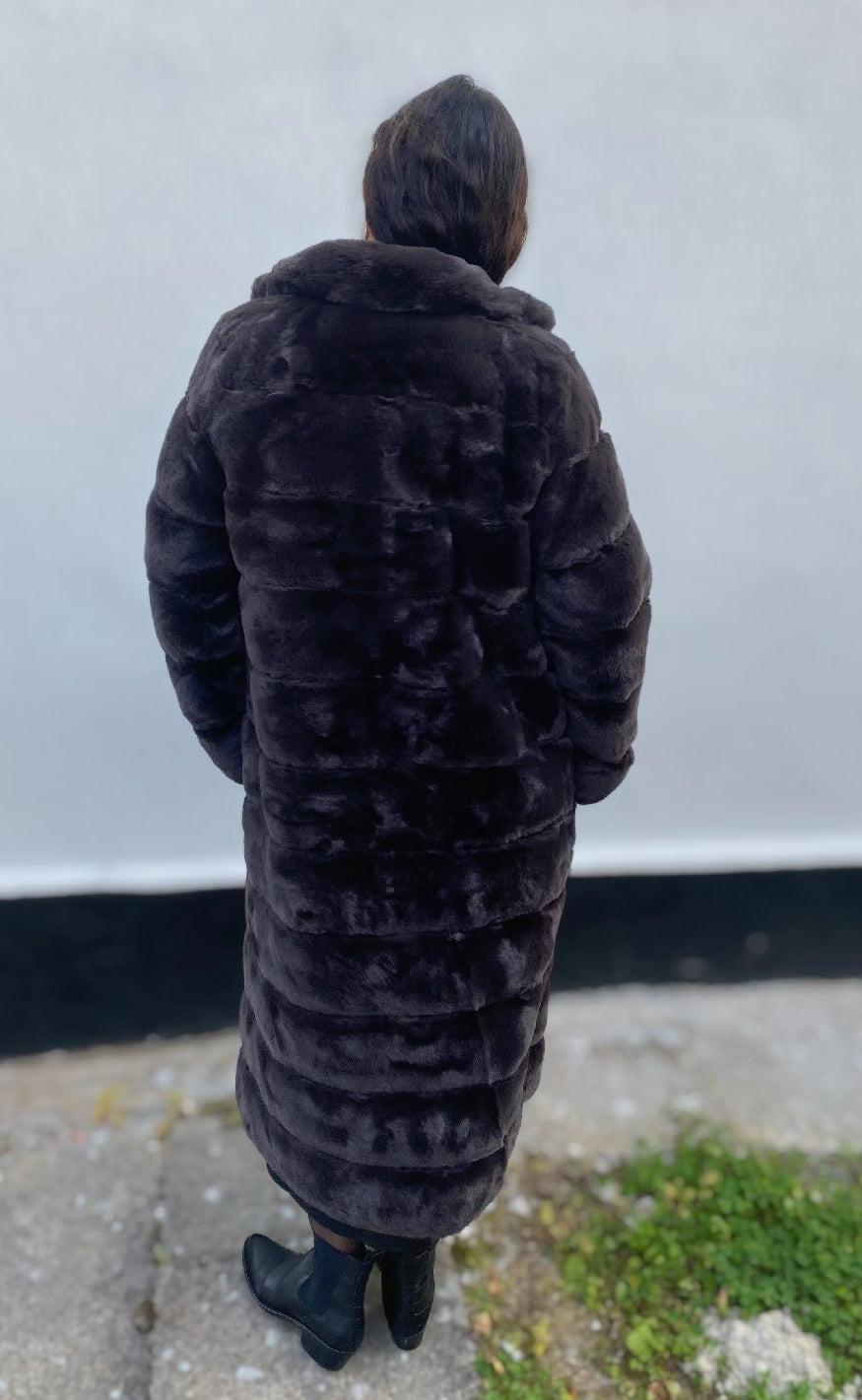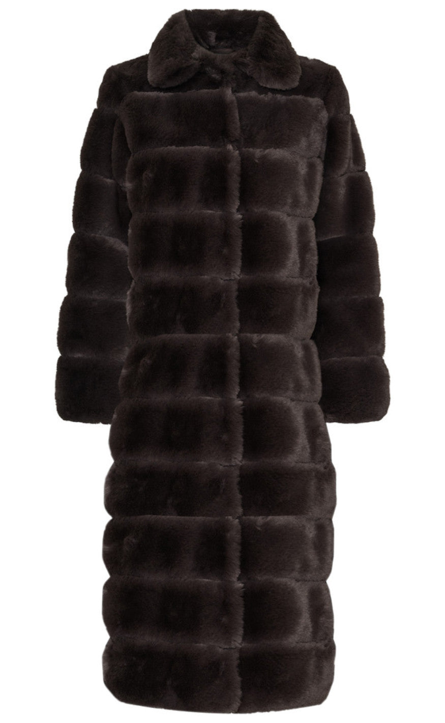 Lang frakke i blød fake pels med klassisk krave og praktiske sidelommer. Modellen lukkes med knapper foran og har et elegant, tidløst udtryk, der gør den velegnet til både hverdagsbrug og mere formelle lejligheder. En stilfuld frakke, der kombinerer varme og sofistikation – et must-have til garderoben.