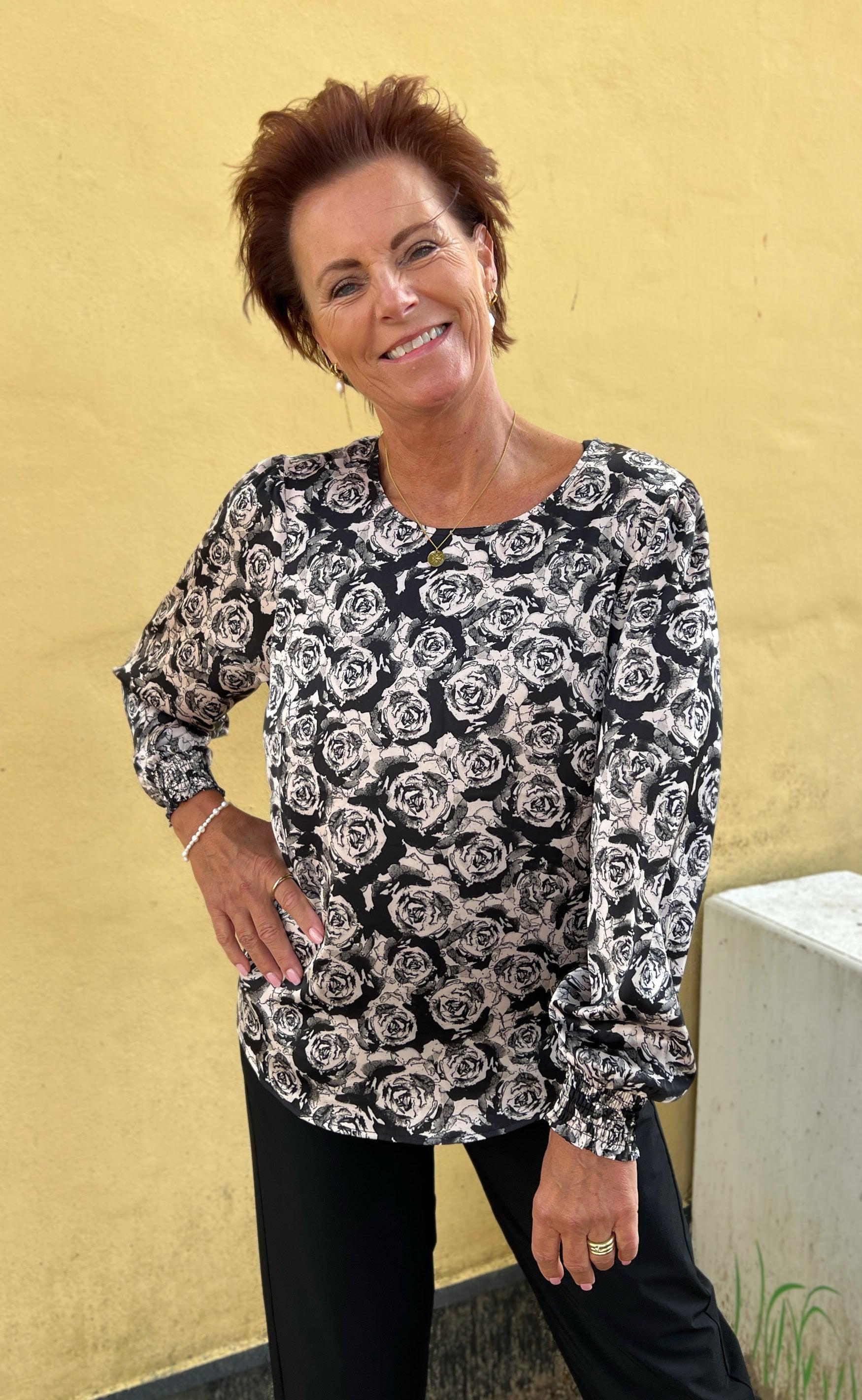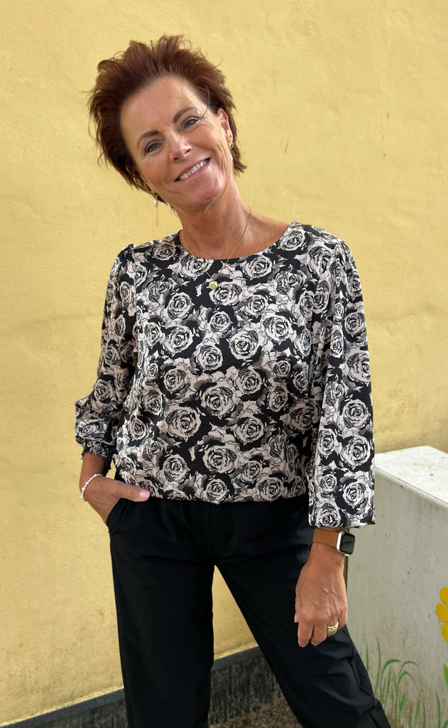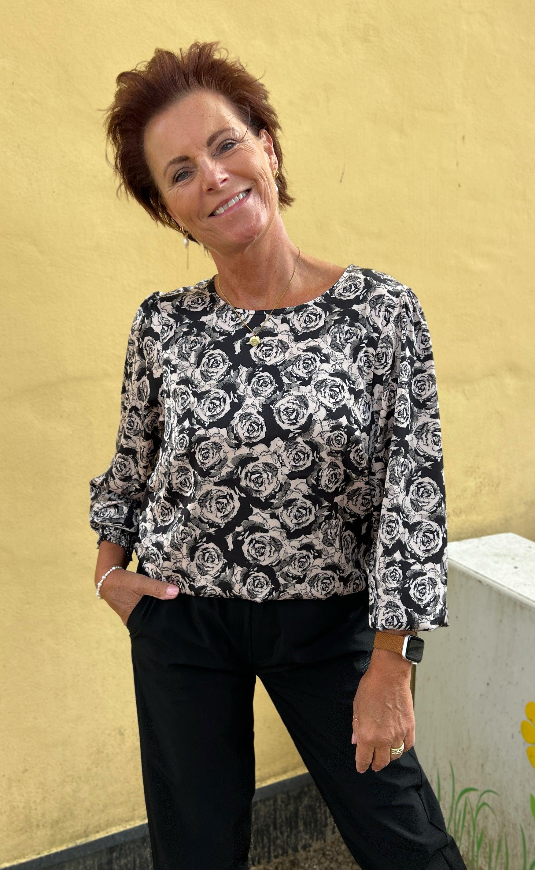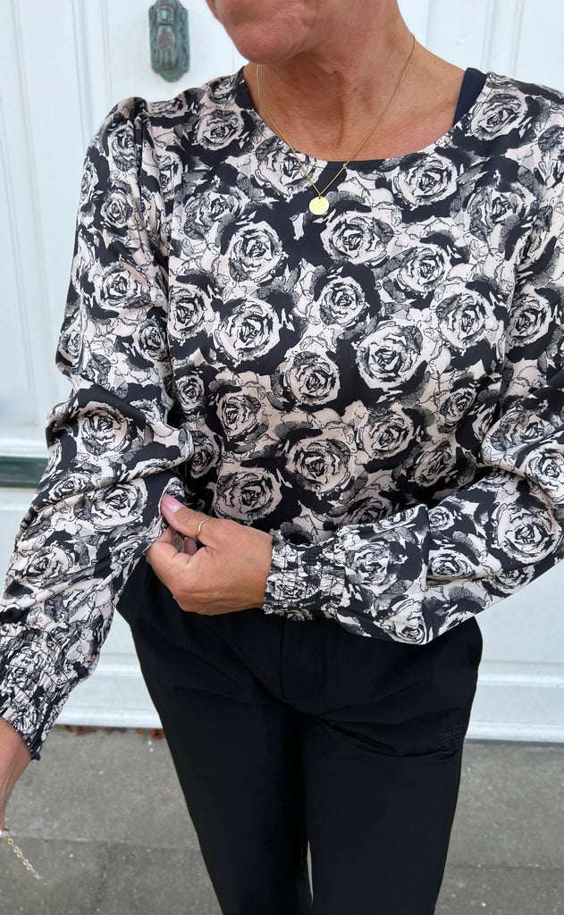 Super smuk bluse fra INA Copenhagen i det flotteste roseprint i sort og med en sart rosa baggrund.