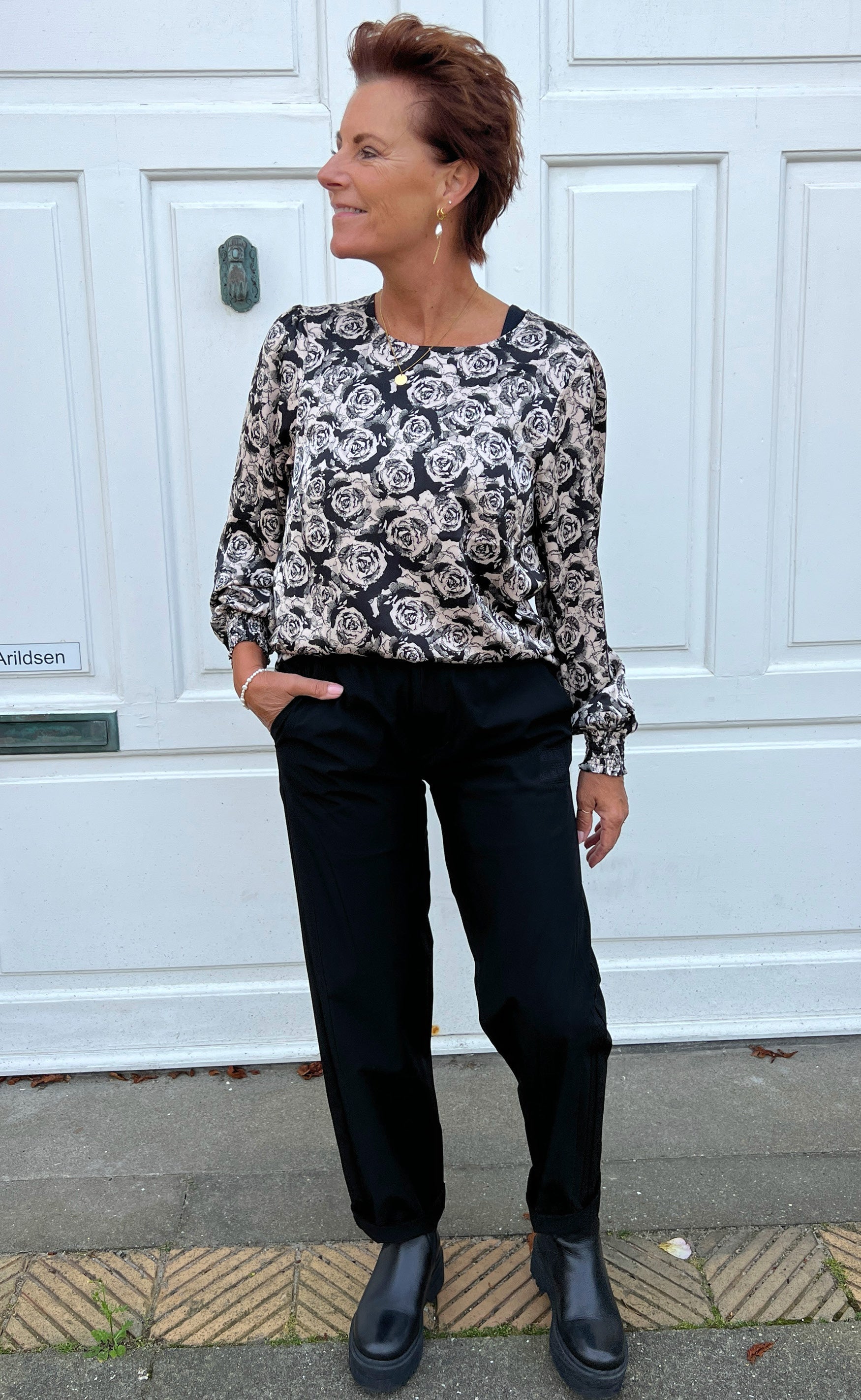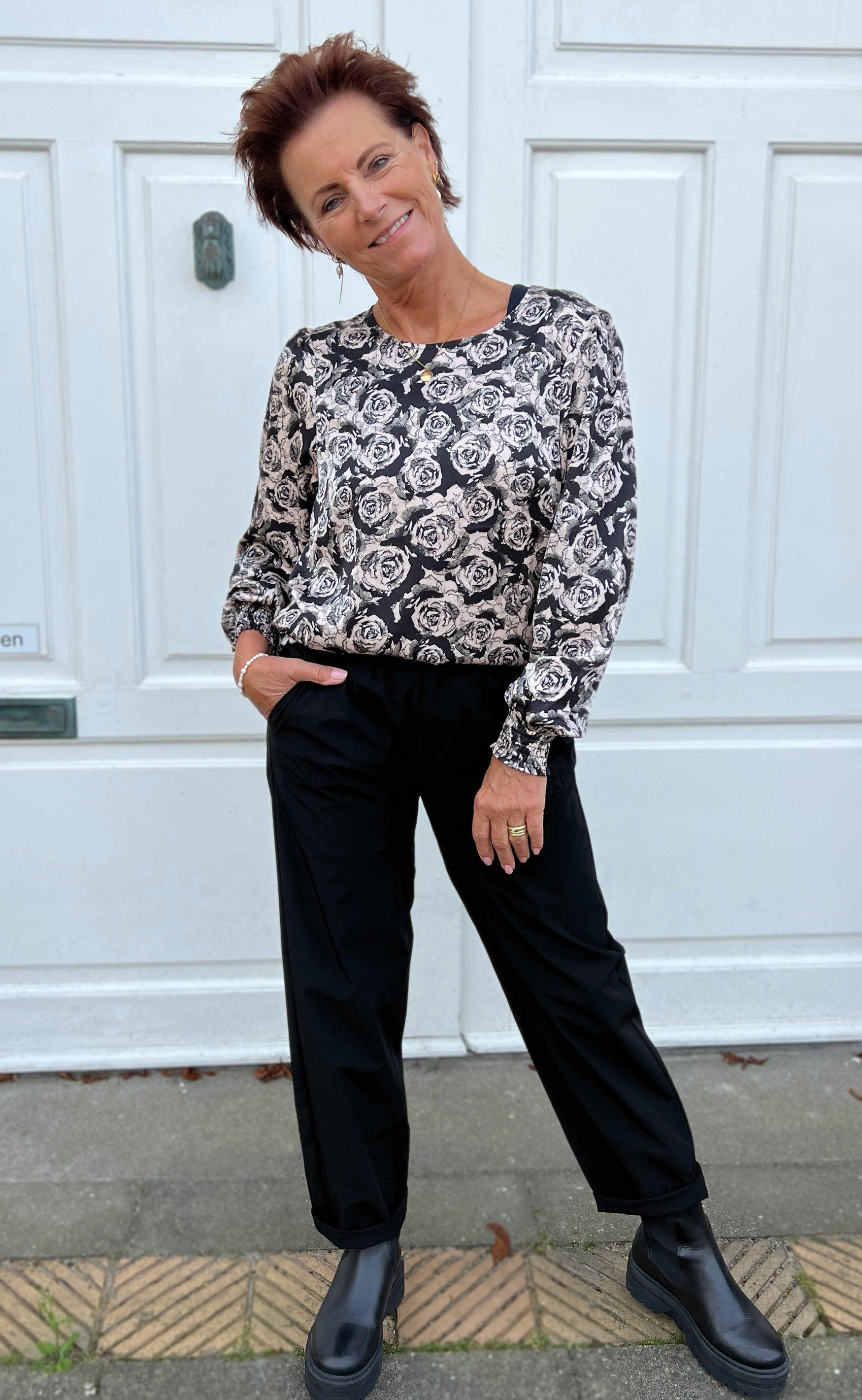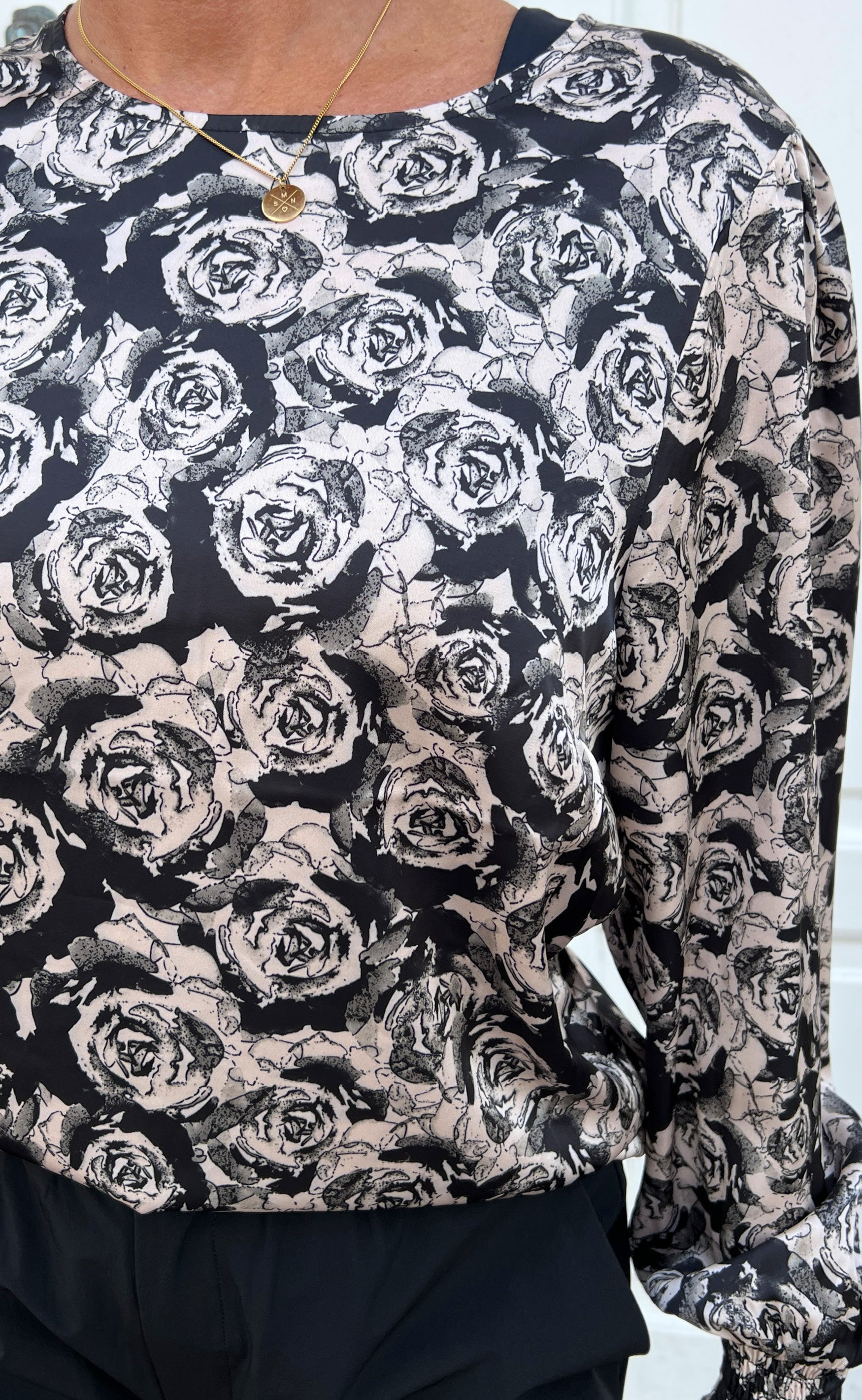 Super smuk bluse fra INA Copenhagen i det flotteste roseprint i sort og med en sart rosa baggrund.