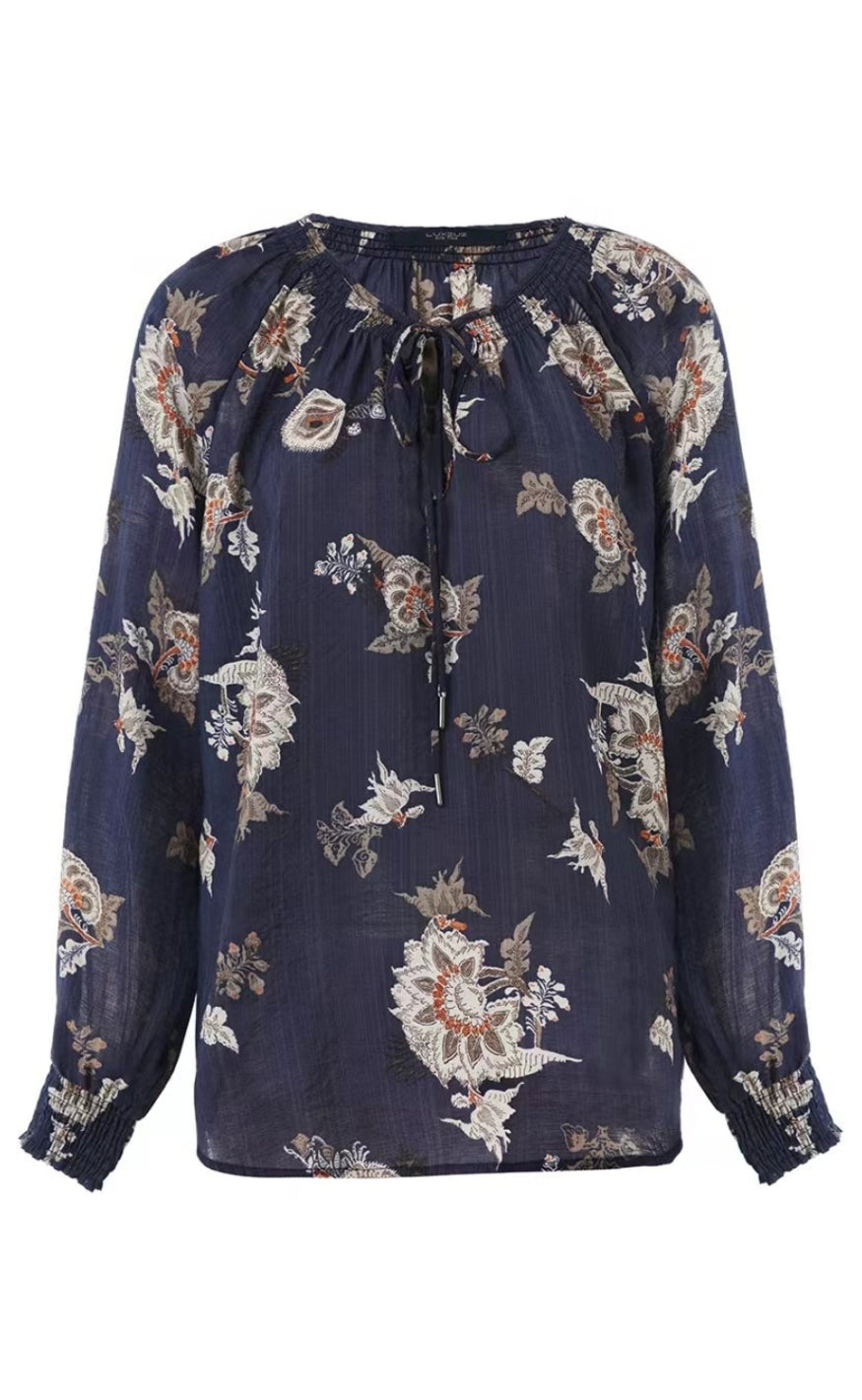 Mørkeblå bluse fra Luxzuz med blomsterprint og bindebånd i halsen.