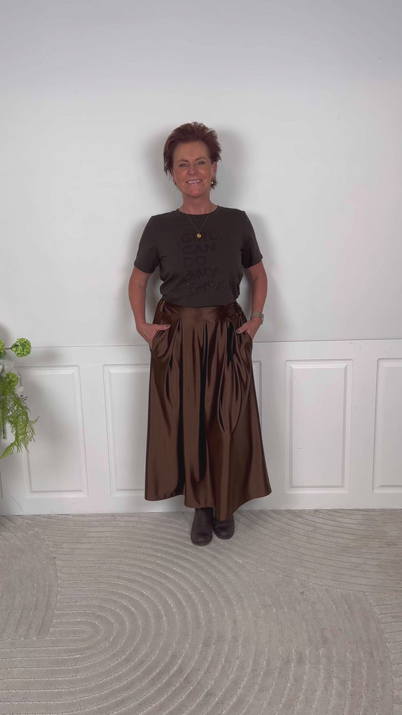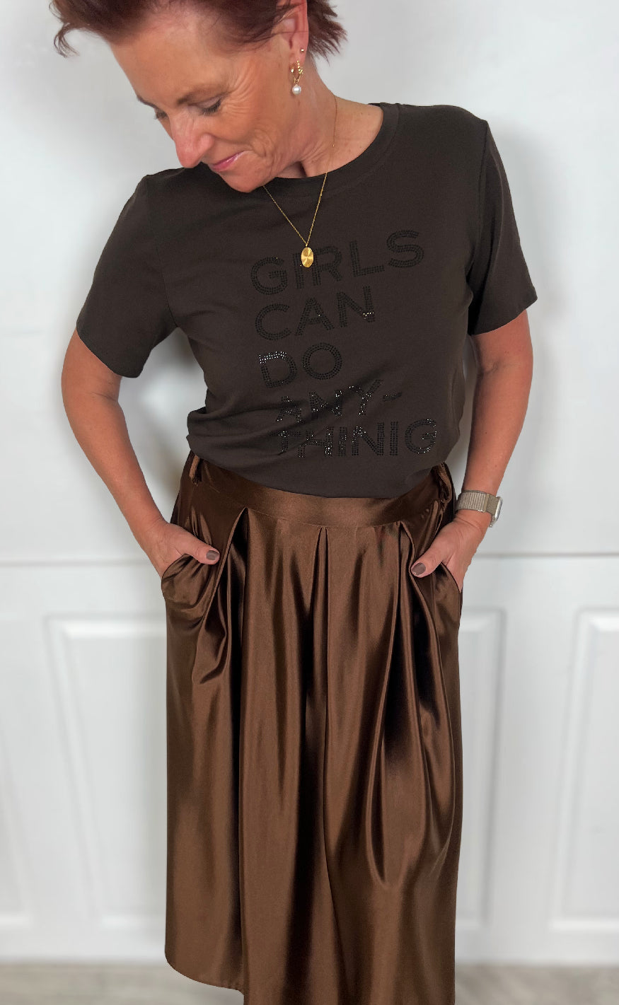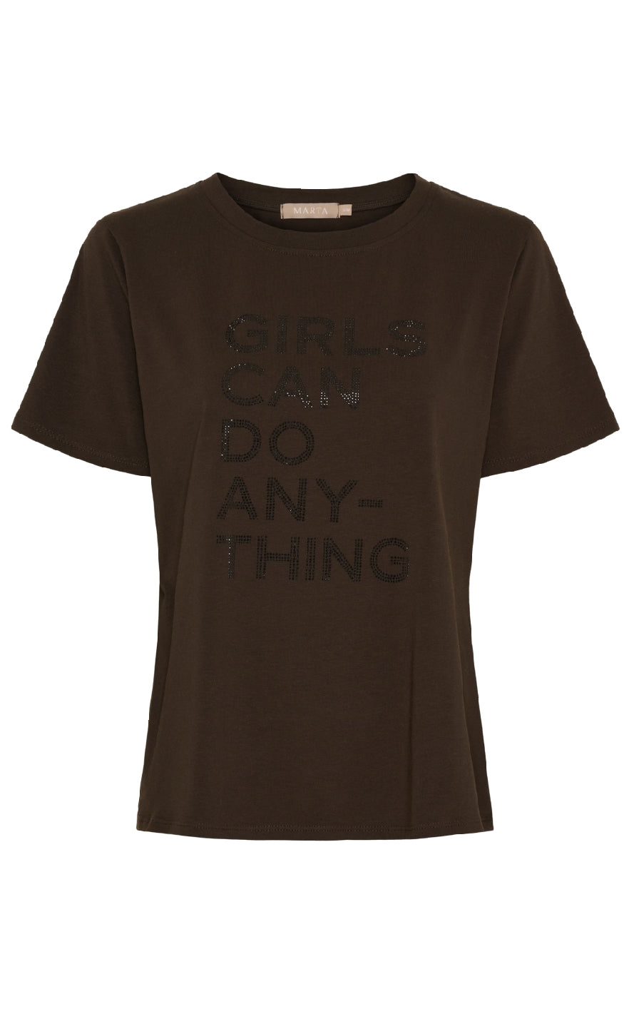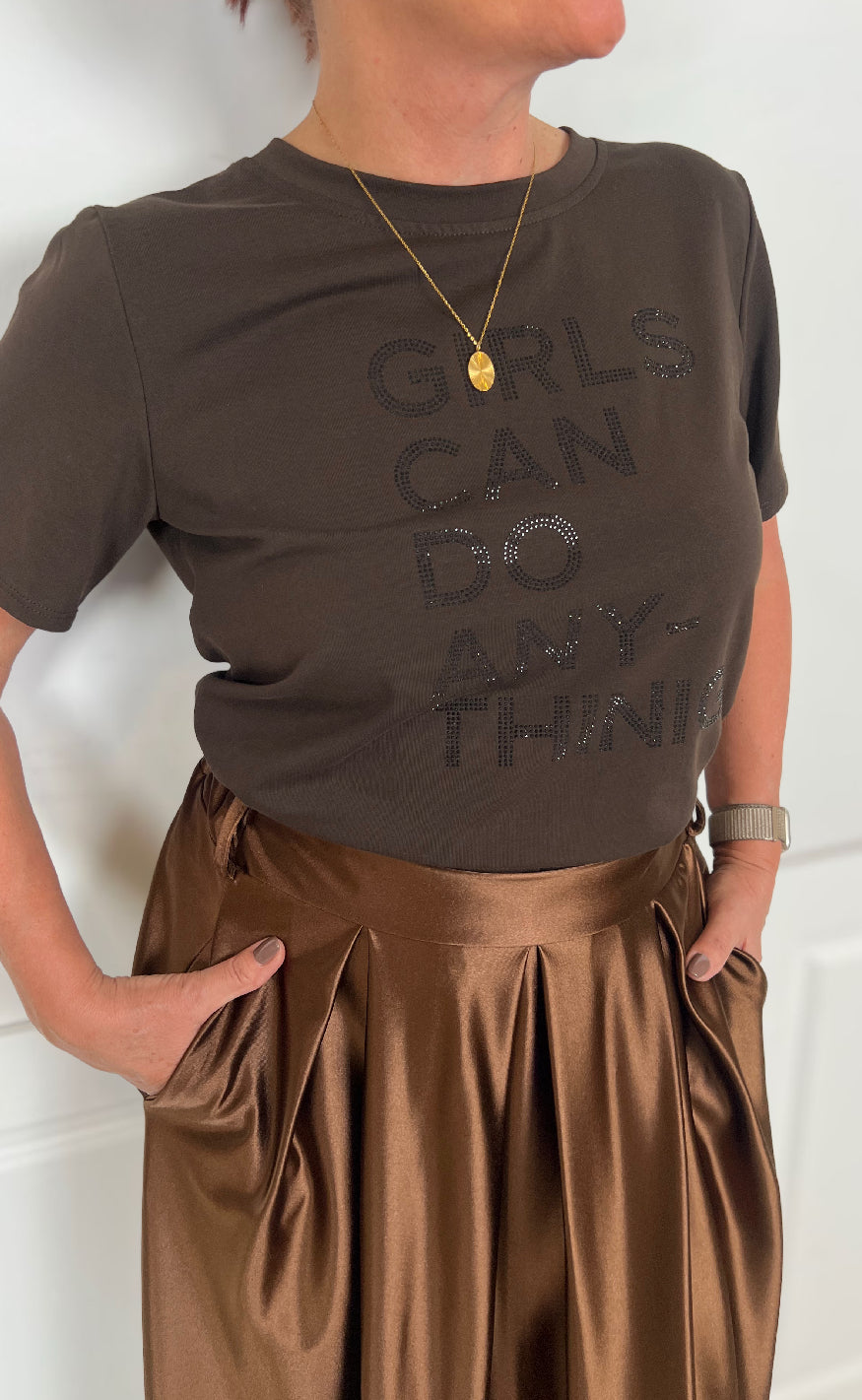 T-shirten har et cool statementprint på fronten med teksten “Girls Can Do Anything” i små sten, som giver et feminint og edgy udtryk. Perfekt til at style med jeans eller under en blazer for et casual look med attitude.